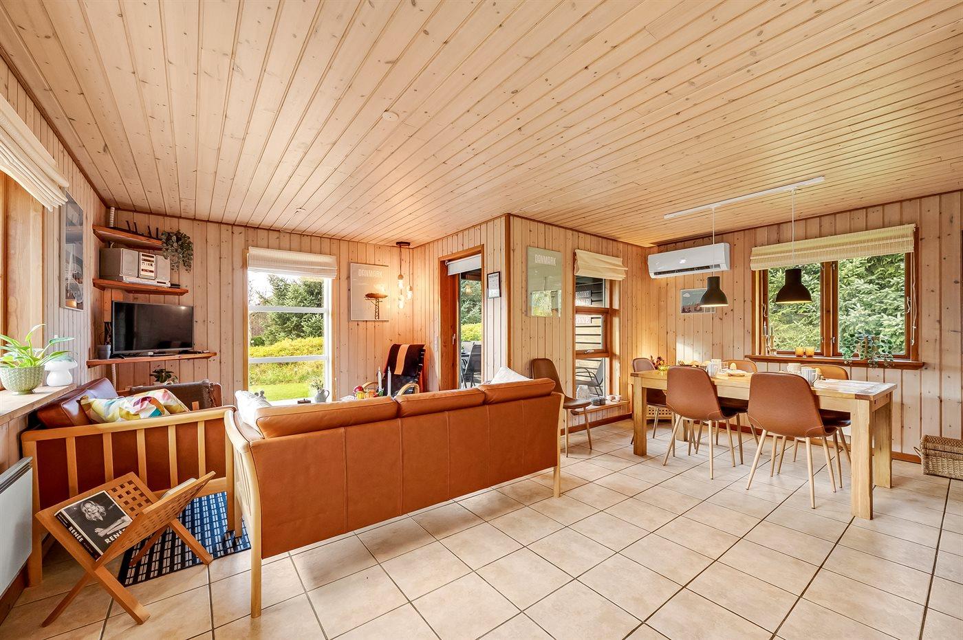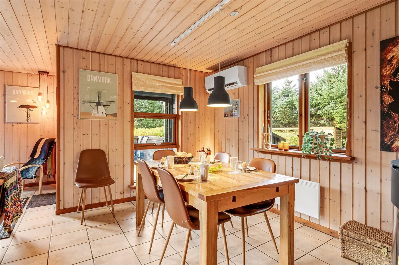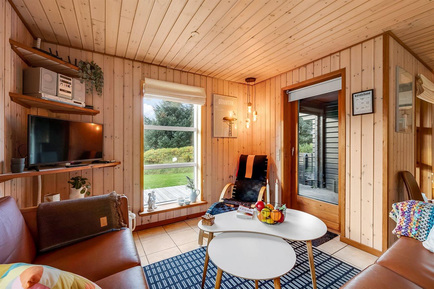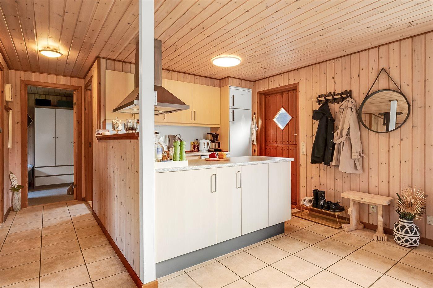 Det særdeles veludstyret køkken har god skabsplads, køle-/fryseskab, keramisk komfur med almindelig + varmluftsovn, mikrobølgeovn, emhætte og opvaskemaskine. Stuen, der er i åben forbindelse med køkkenet, har en hyggespredende brændeovn, der også alene kan varme hele huset op. Der er TV med parabol og chromecast, DVD-afspiller og stereoanlæg med CD-afspiller.