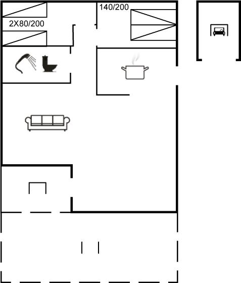 Et soverum med dobbeltseng (140x200 cm) og et med to enkeltsenge (80x190 cm). Begge soverum har skabe. Badeværelset er med muret brusehjørne med forhæng, toilet, håndvask, skabe, vaskemaskine og tørretumbler.