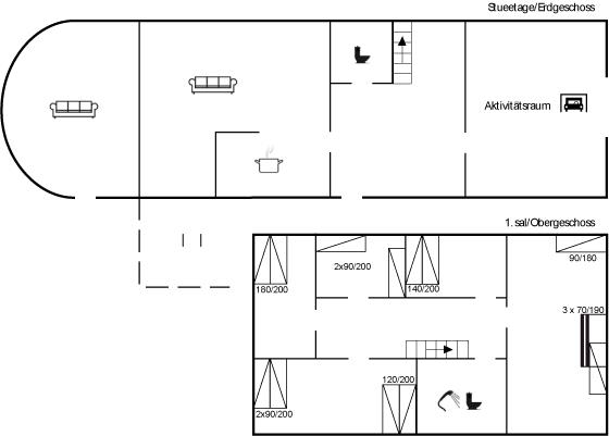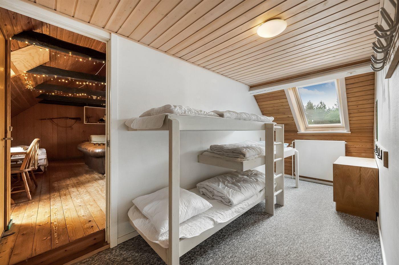 Der er i alt 5 soveværelser. Sovepladserne fordeler sig på: 8 sovepladser i dobbeltsenge. 3 sovepladser i enkeltsenge. 3 sovepladser i køjesenge. Derudover er der 1 stk. barneseng.