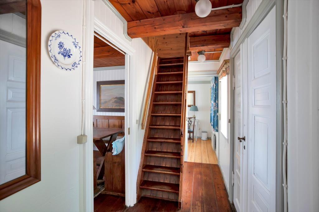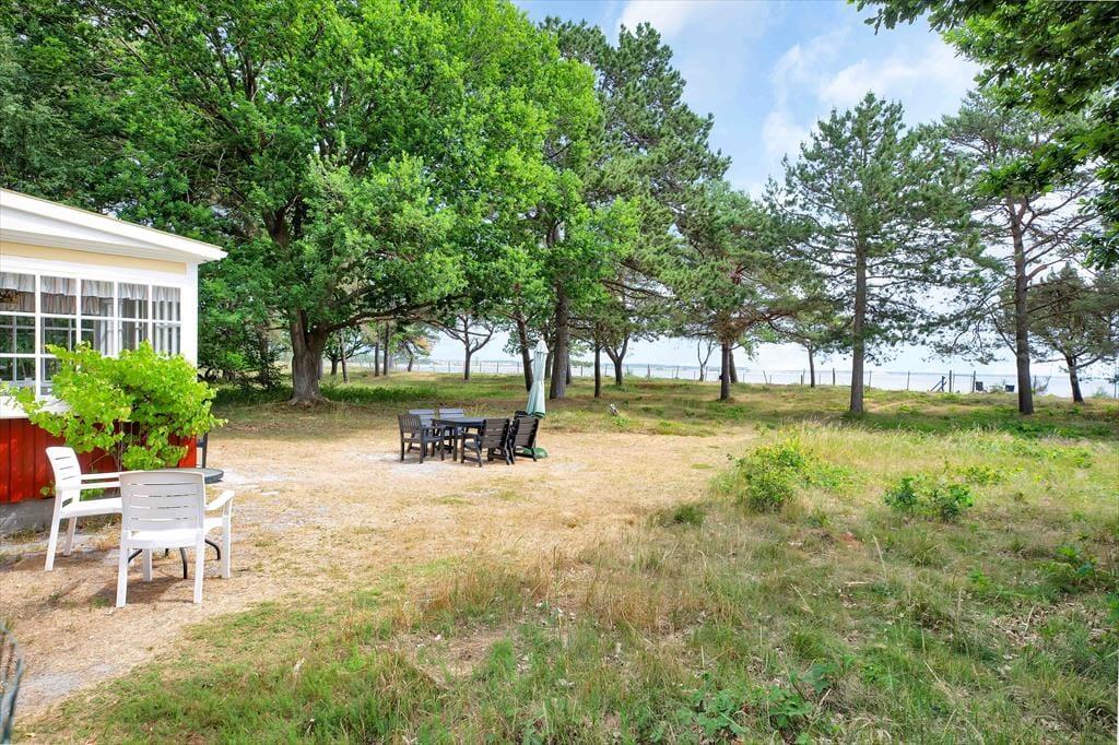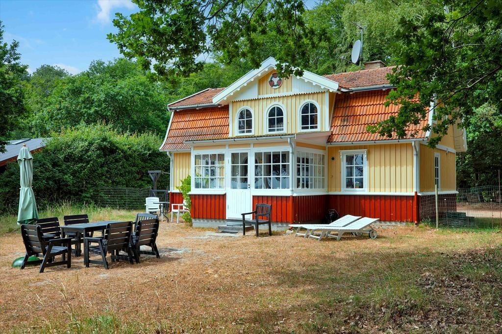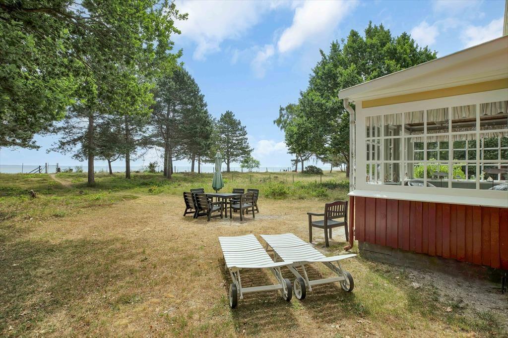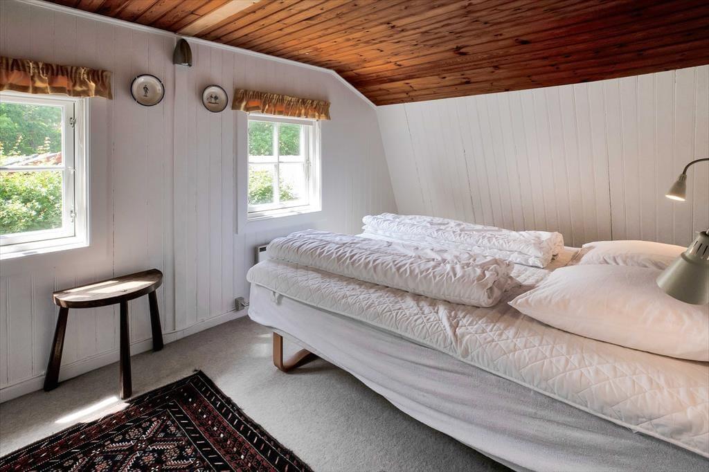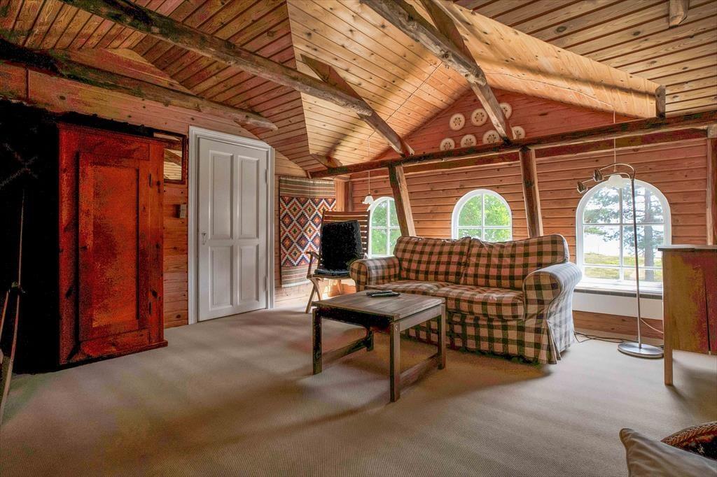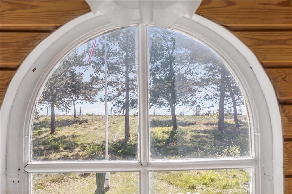 Med fritliggende bjælker på førstesalen og trægulv og -vægge falder dette unikke sommerhus naturligt ind på den kæmpestore naturgrund. Her er charme og nostalgi, varme og sjæl, og du føler dig nemt godt tilpas. Havestuen bliver hurtigt jeres foretrukne sted med en enestående havudsigt. Fra køkkenet kan du også se ud på havet. Når turen op ad den lidt stejle trappe til førstesalen er forceret finder du to soveværelser, ligeledes med havudsigt og en blød sofa, hvor dagens oplevelser kan fordøjes.
