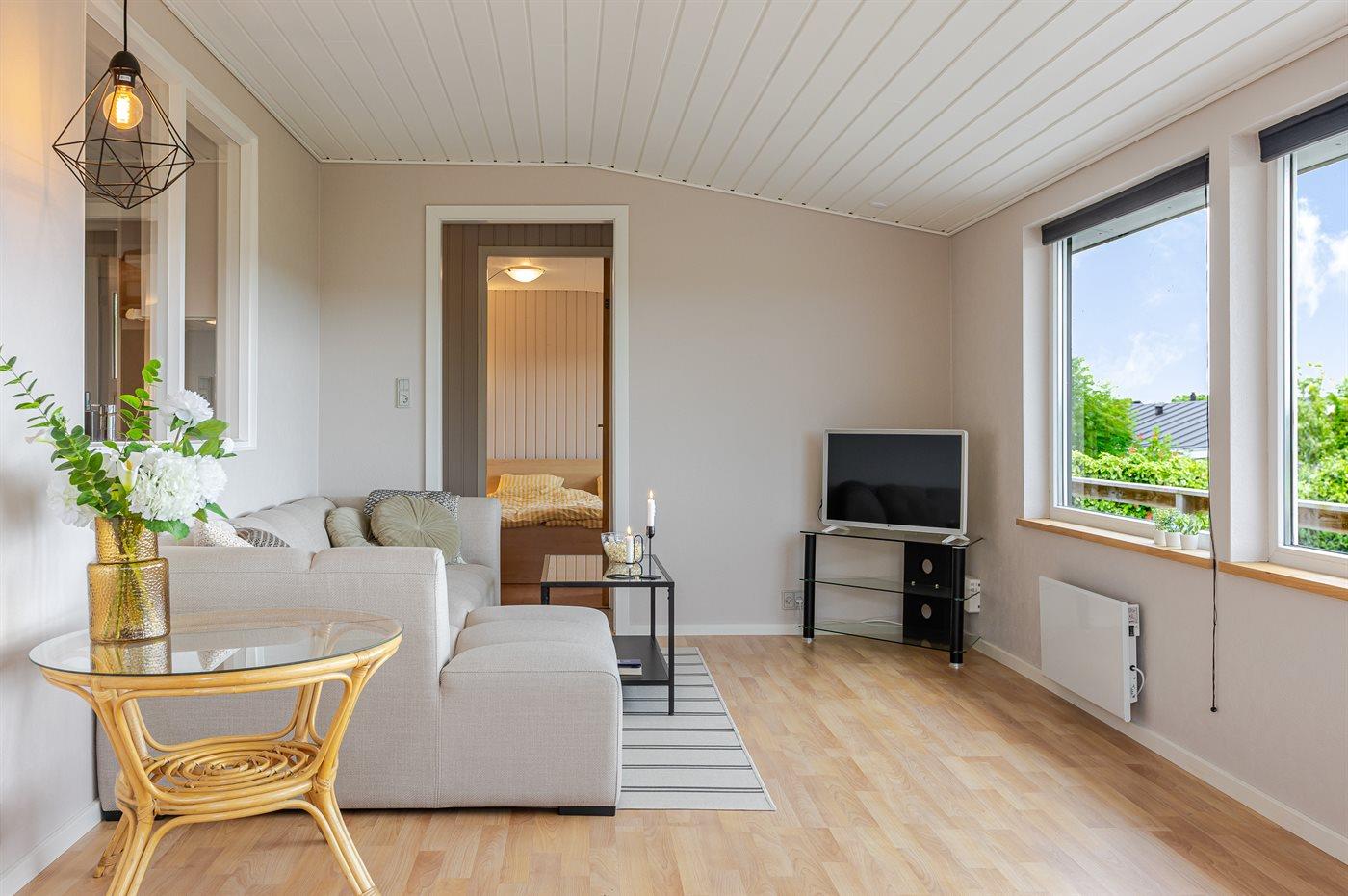 Hyggeligt sommerhus i Skarrev med havudsigt, terrasse og tæt på børnevenlig strand.