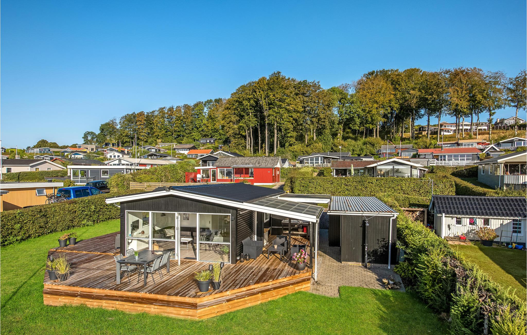 Hyggeligt sommerhus i Skarrev med panoramaudsigt over Aabenraa Fjord og tæt på badestrand.