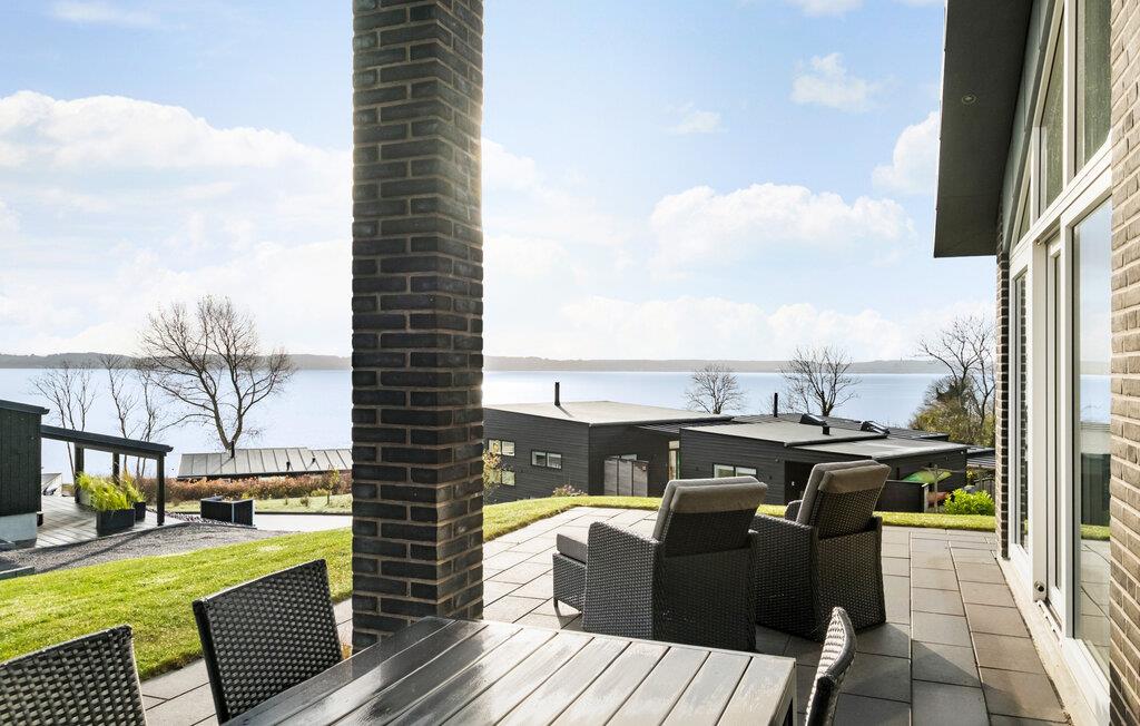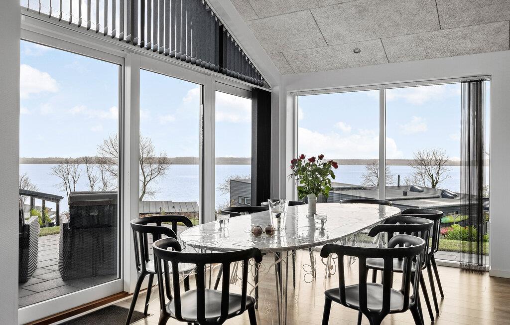 Jeres feriehus ved Skarrev Strand er noget særligt med sin unikke beliggenhed og moderne indretning. Huset byder på en spektakulær udsigt over Aabenraa Fjord, som I kan beundre både fra terrassen og fra spiseområdet. Observer skibs- og bådtrafikken, mens I nyder roen og vidderne i området. Feriehuset er designet med lyse rum, der via store vinduespartier skaber en sømløs overgang mellem indendørs og udendørs arealer. Den åbne opholdsstue med elegant indretning lægger op til afslapning. Gør det behageligt for jer på den rummelige sofa eller nyd fælles måltider ved det stilfulde spisebord med panoramaudsigt.