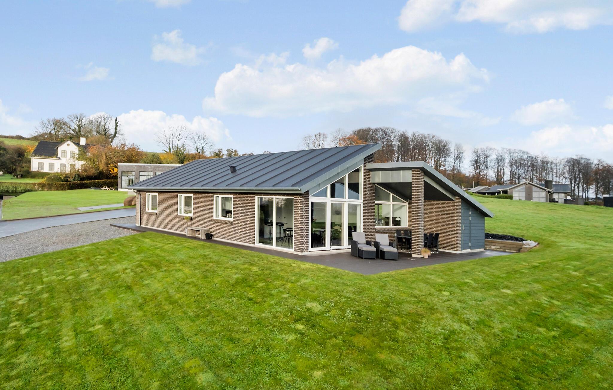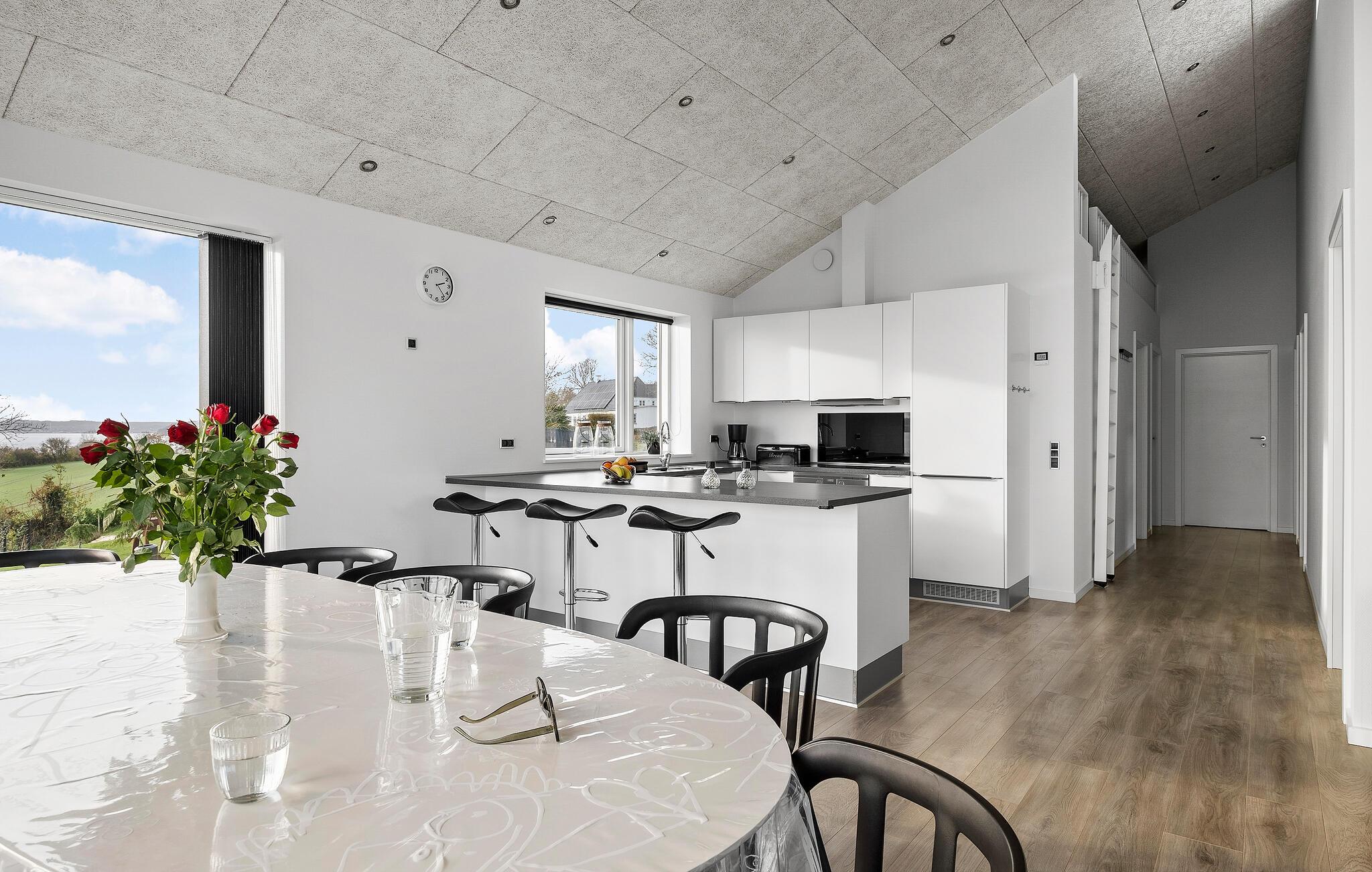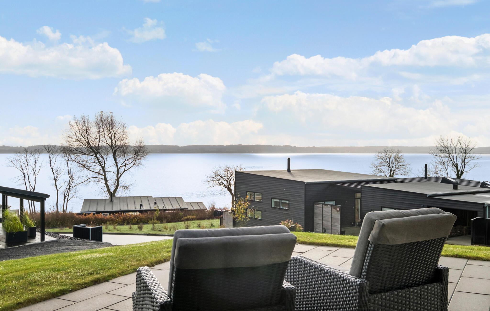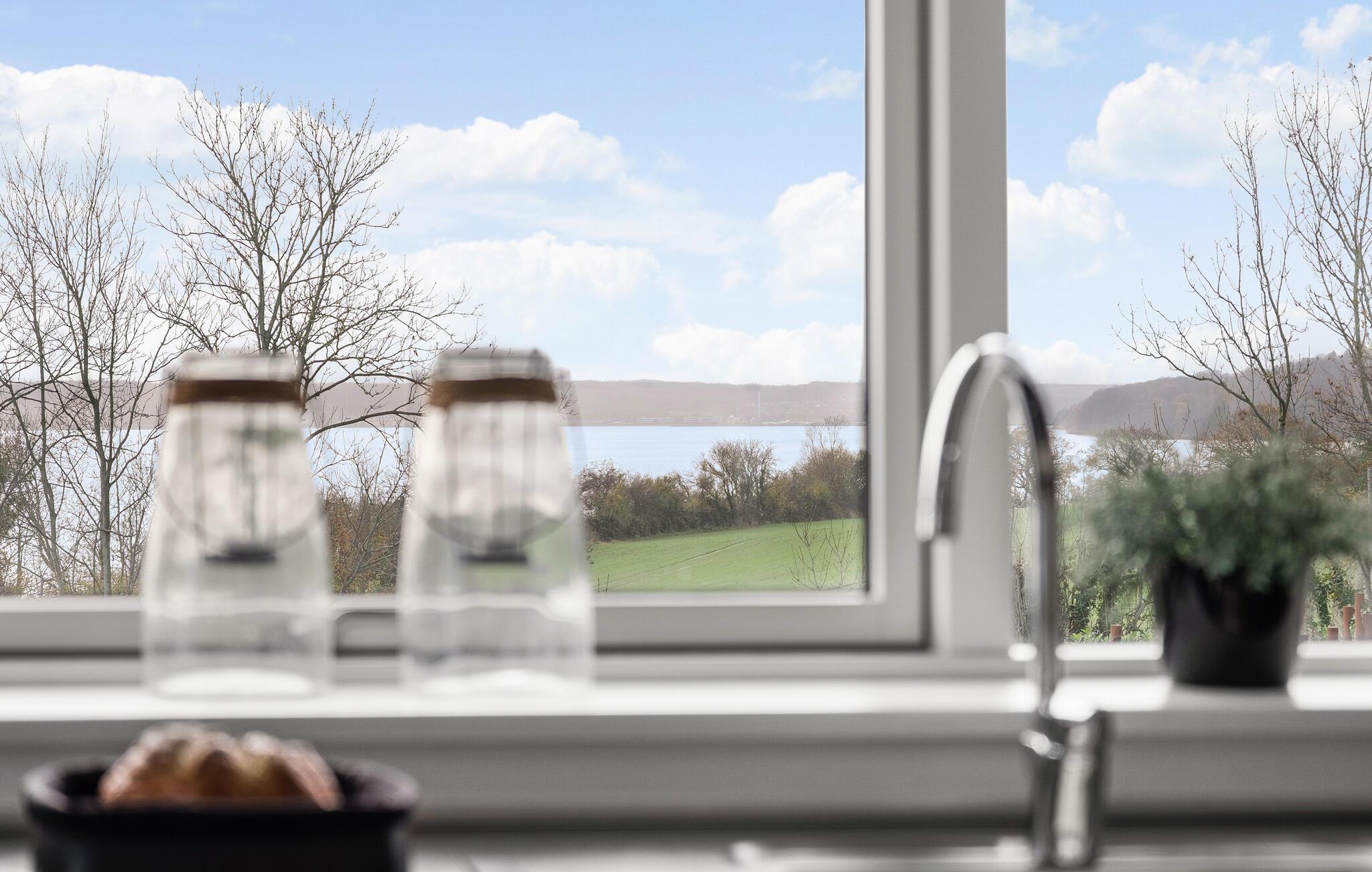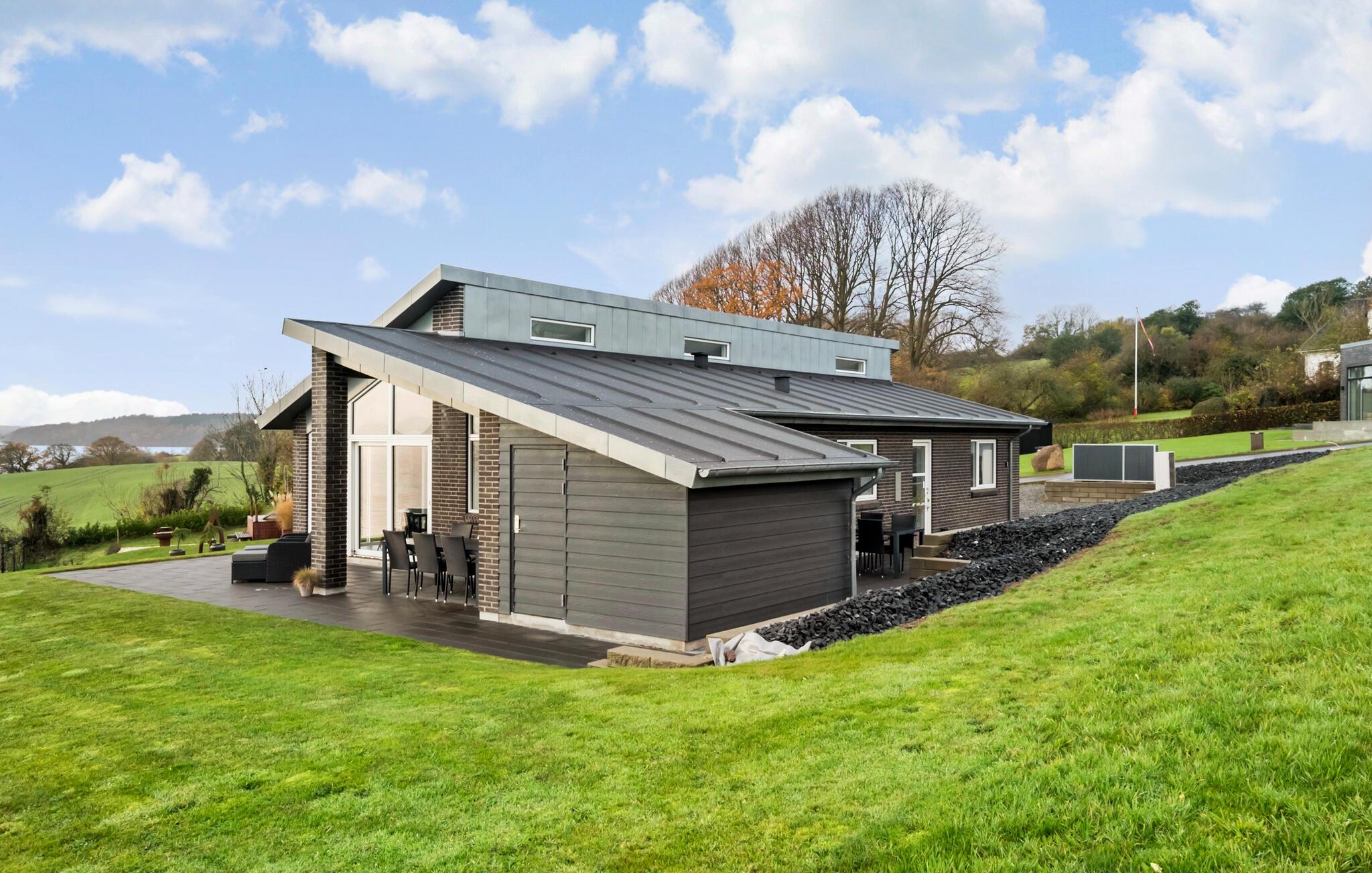 Stilfuldt feriehus ved Skarrev Strand med panoramaudsigt over Aabenraa Fjord og moderne indretning.
