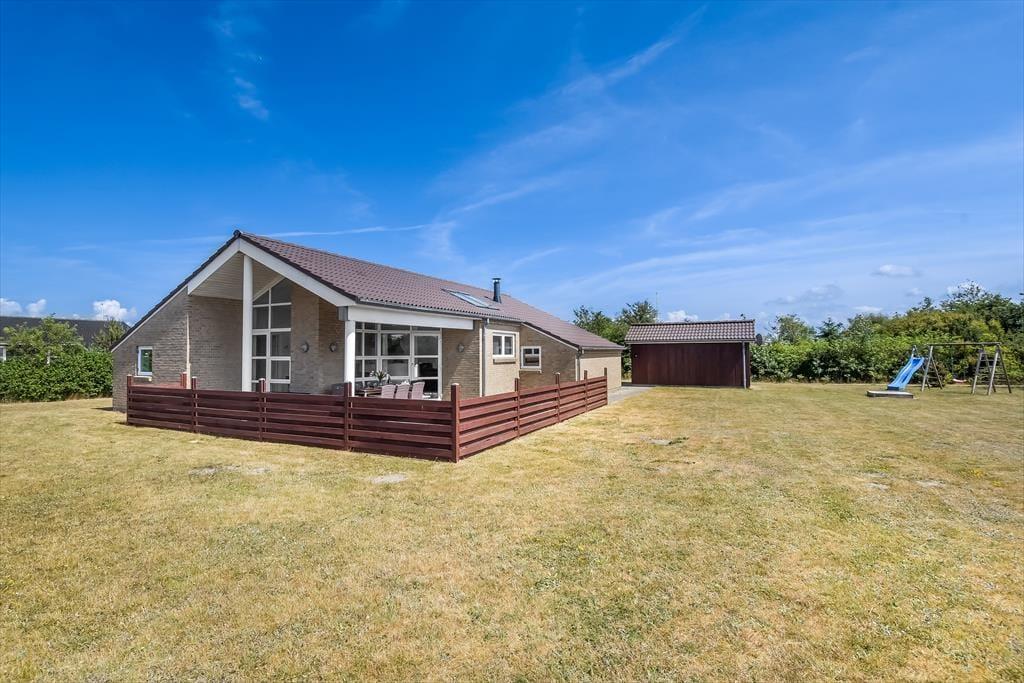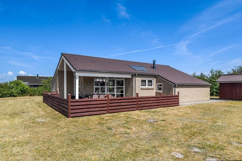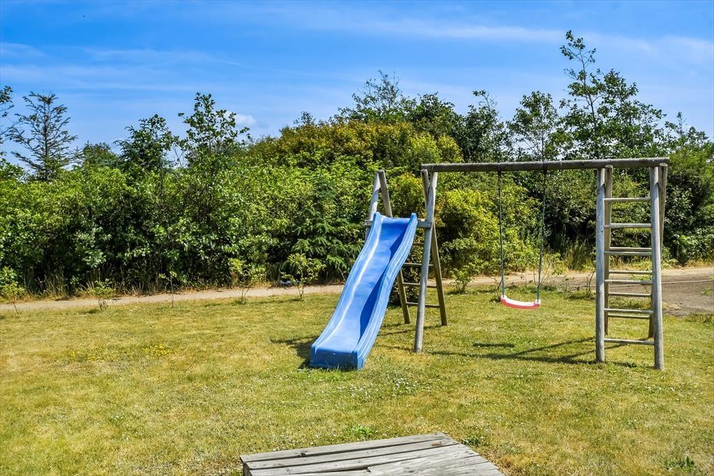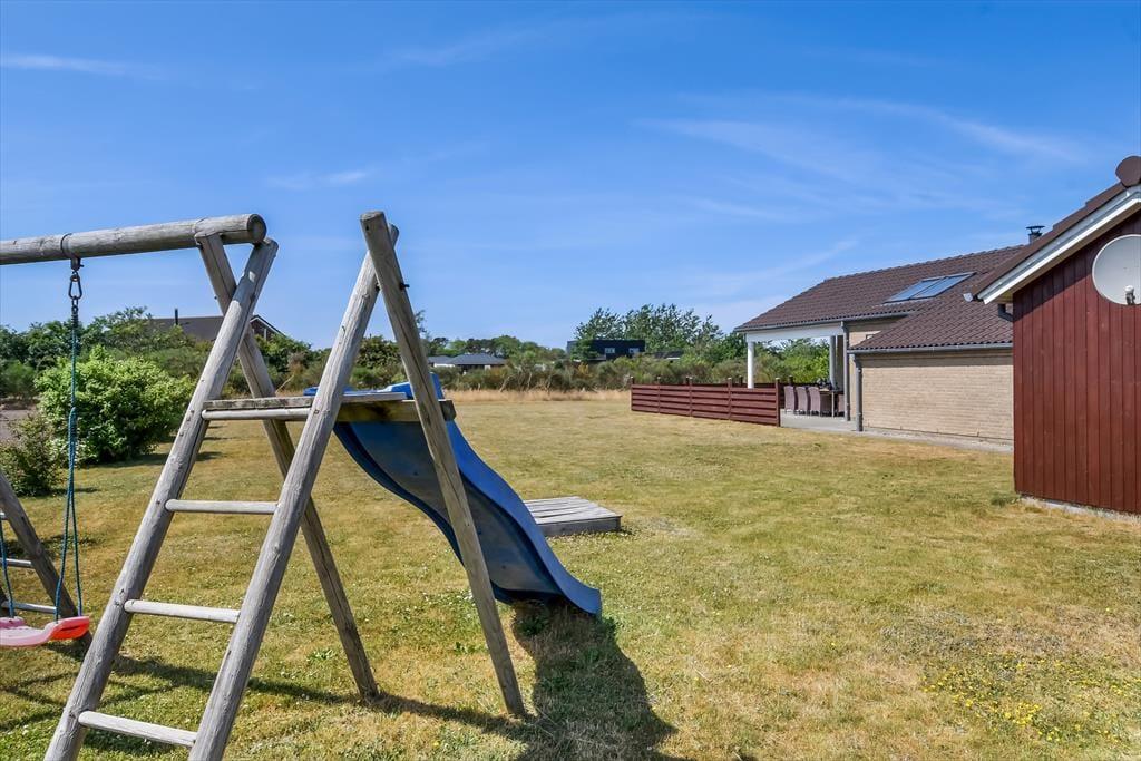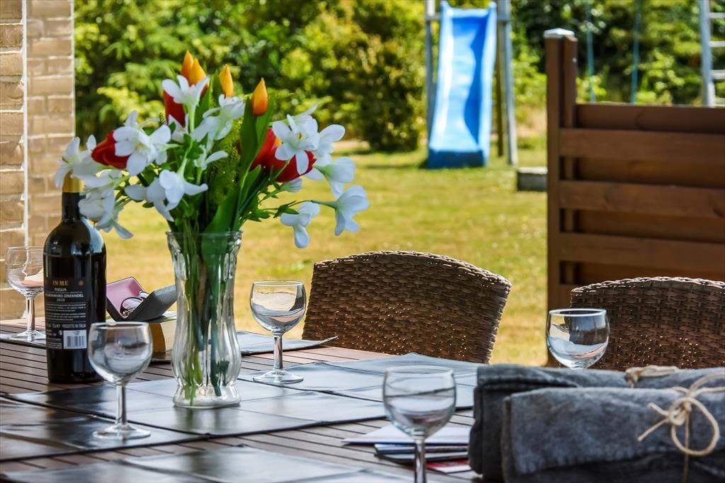 I får de bedste betingelser for at nyde livet under åben himmel på den 1416 m2 store grund. Her er der ro og fred, masser af sol og masser af frisk luft – alt det, man drømmer om på ferieturen. Familiens yngste vil med sikkerhed begejstres over den store plæne, der egner sig perfekt til leg og boldspil – og som ekstra bonus medfølger der i haven også et legestativ med gynge og rutsjebane. Når dagen går på hæld, kan I tænde op i grillen og dække op til en hyggelig middag på terrassen – det er sommerhusliv, når det er bedst. Terrassen er tilmed overdækket, så her kan I nyde aftenstunden, selvom der falder lidt dug fra oven.