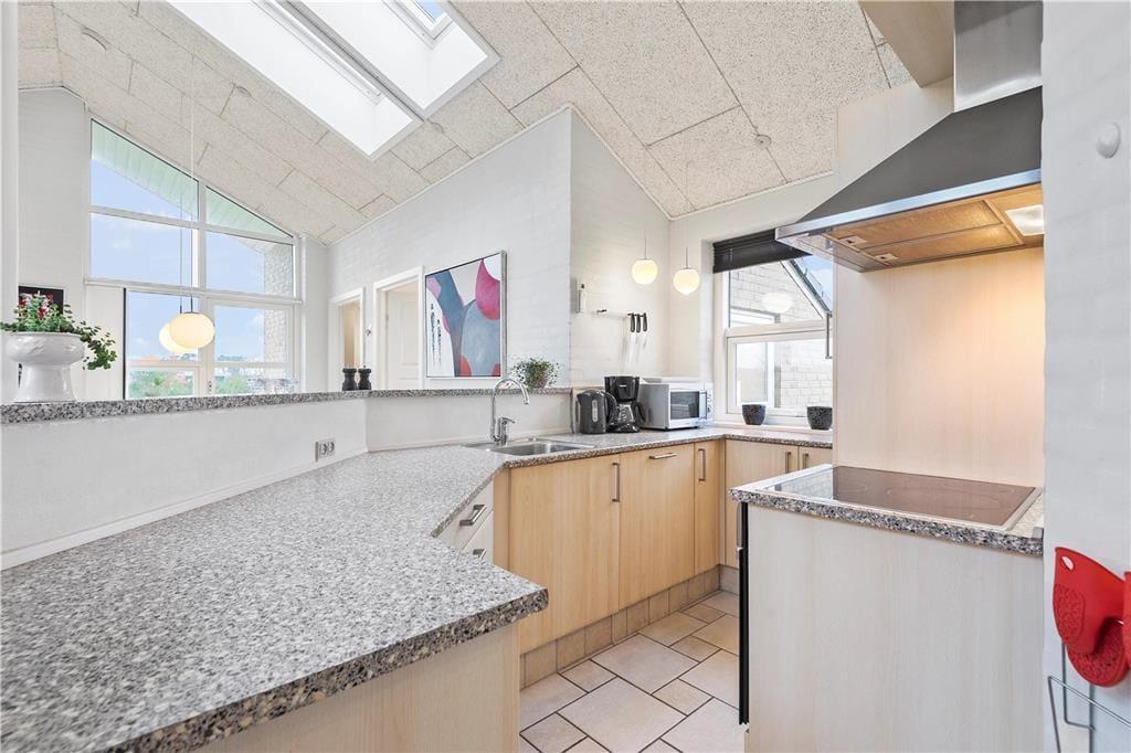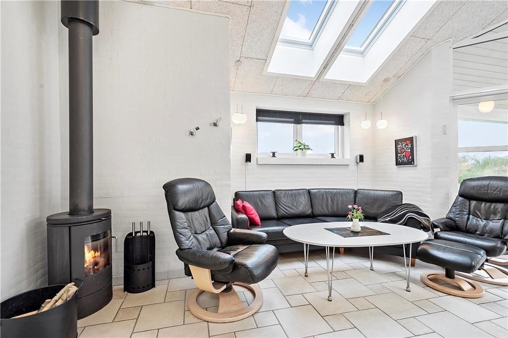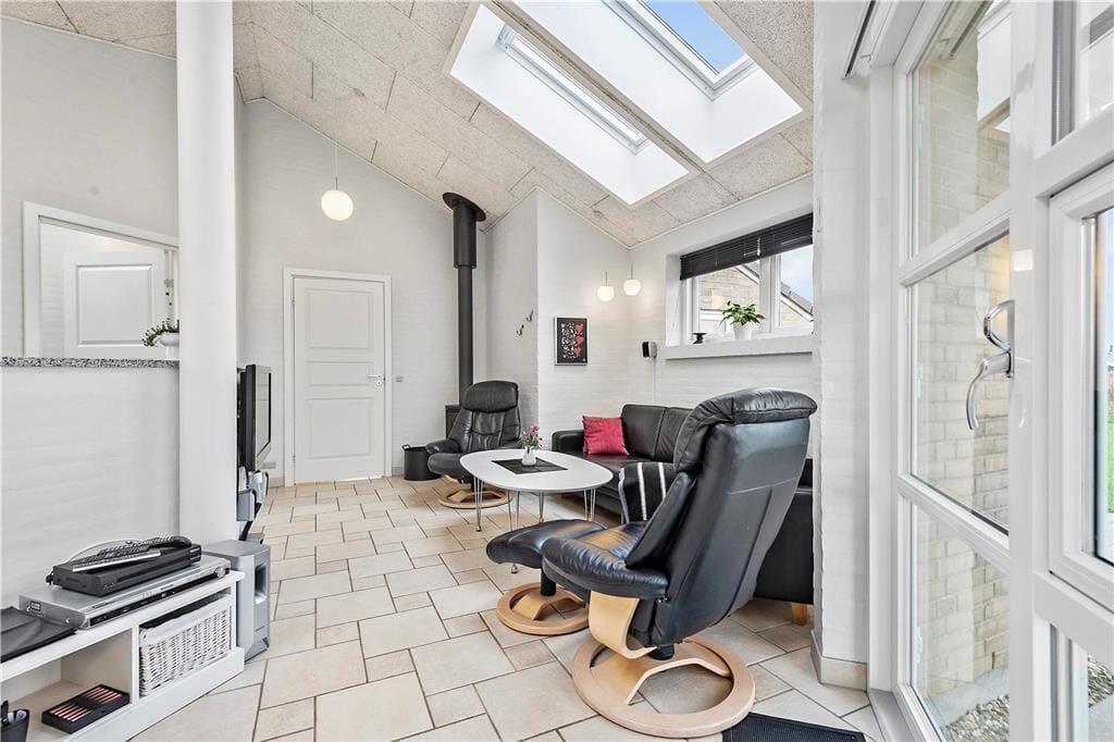 Takket være ovenlysvinduer er der et skønt lysindfald i huset, som med sine 105 m2 byder på god plads. Der er loft til kip i køkken-alrummet, hvorfra der er fint kig til alt det grønne udenfor. Køkkenet er i åben forbindelse med opholdsafdelingen kun adskilt af en ”bardisk”. Fra alrummet er der direkte udgang til terrassen og haven, som på de lune sommerdage bliver en naturlig udvidelse af opholdsarealet. Huset indeholder fire soverum, og hertil kommer to badeværelser, hvoraf det ene er udstyret med sauna.