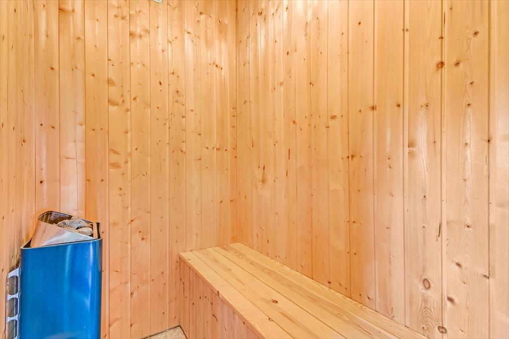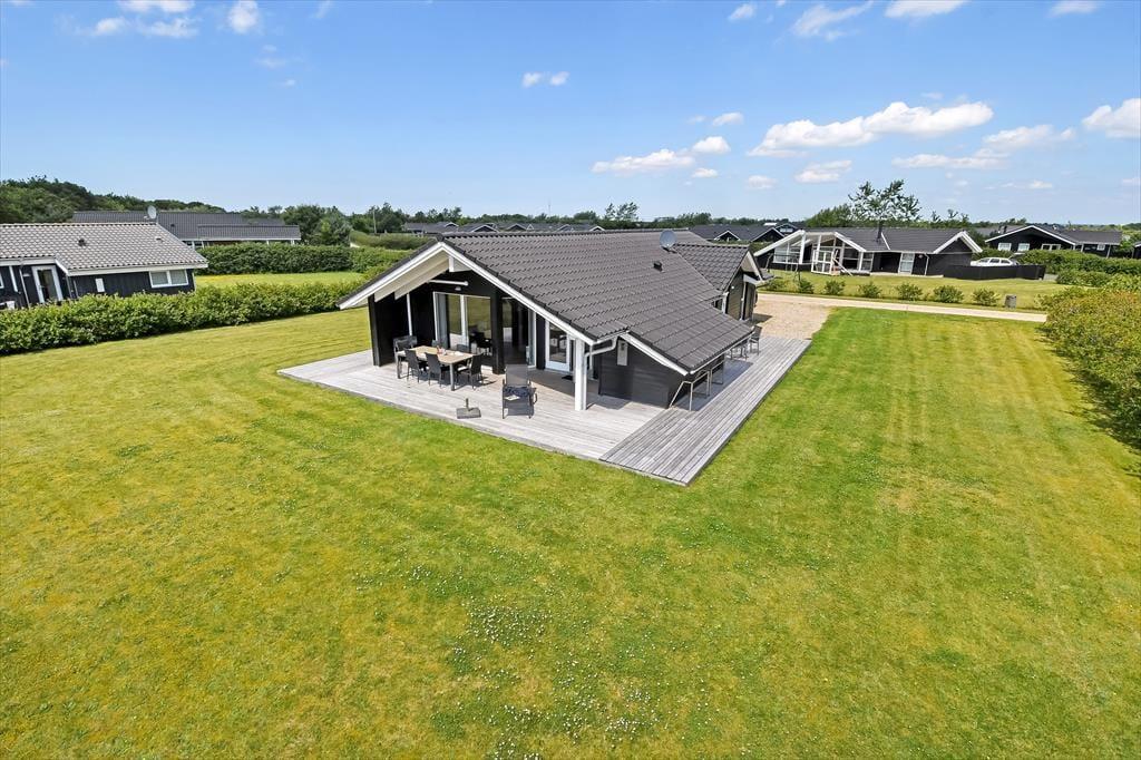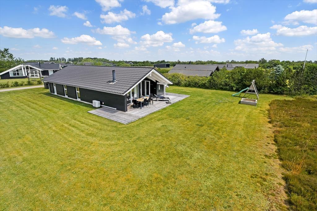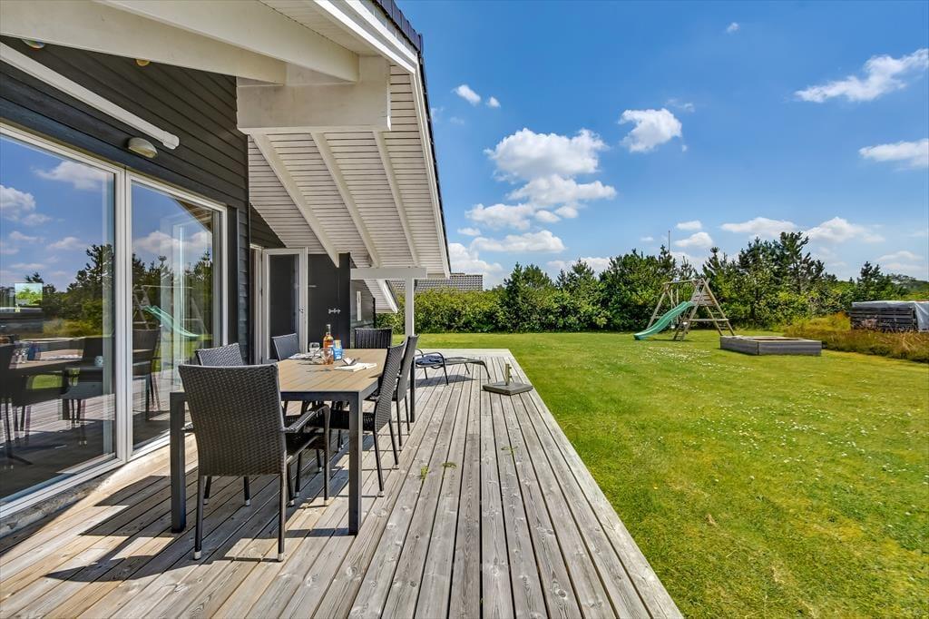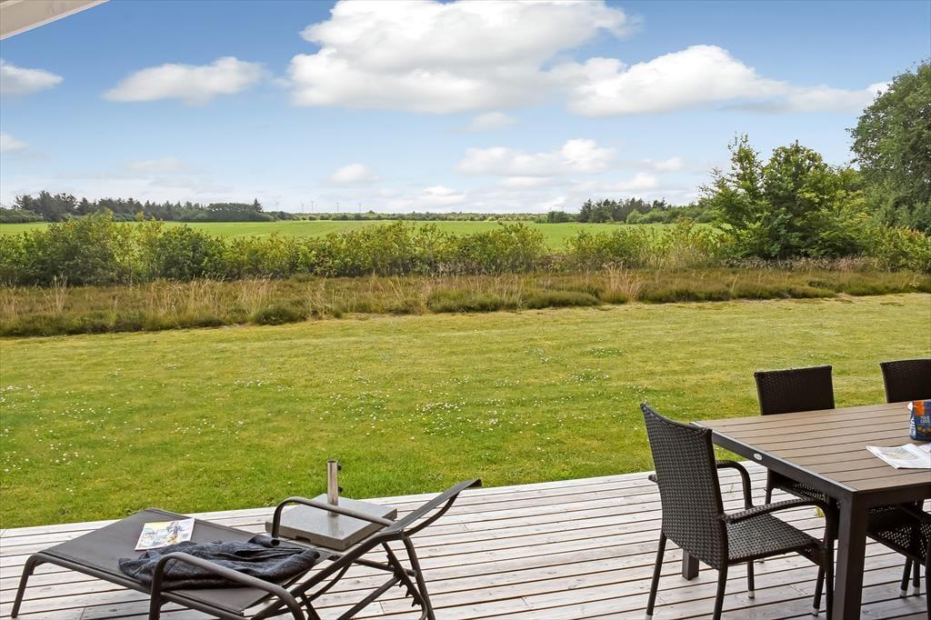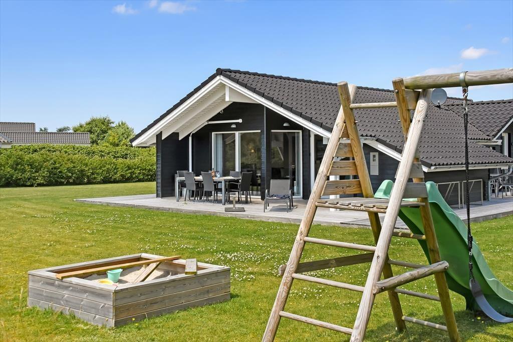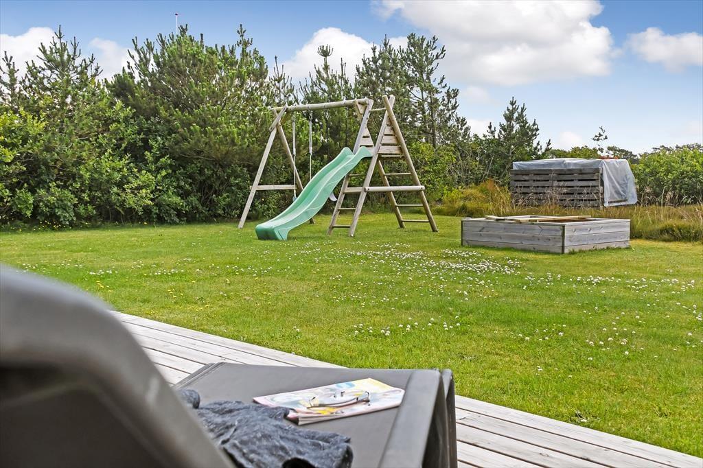 Når vejret ikke indbyder til spabad og varme saunature, men nærmere solbadning, havespil og læskende sodavandsis, er haven det helt rette sted at være. Grunden er stor, og du har god plads til at boltre dig på græsplænen med din familie – og når du kigger op over hækken, kan du nyde synet af flade marker, smukke træer, vindmøller og himlens drivende skyer. Til børnene er der sandkasse og et legestativ med gynger og rutsjebane, og mens de yngste leger, kan de voksne måske nå en kop kaffe og en læsestund på den dejlige træterrasse, der breder sig mod øst og syd.