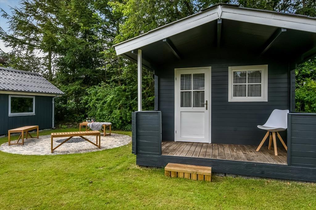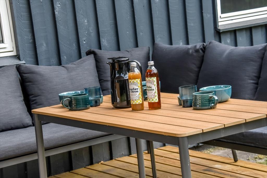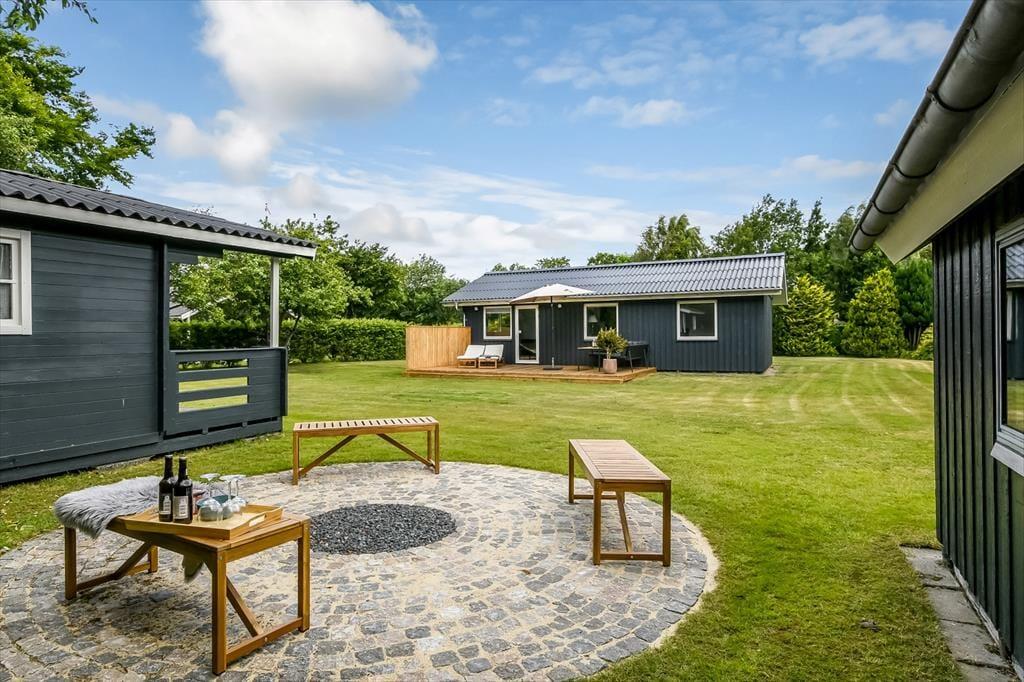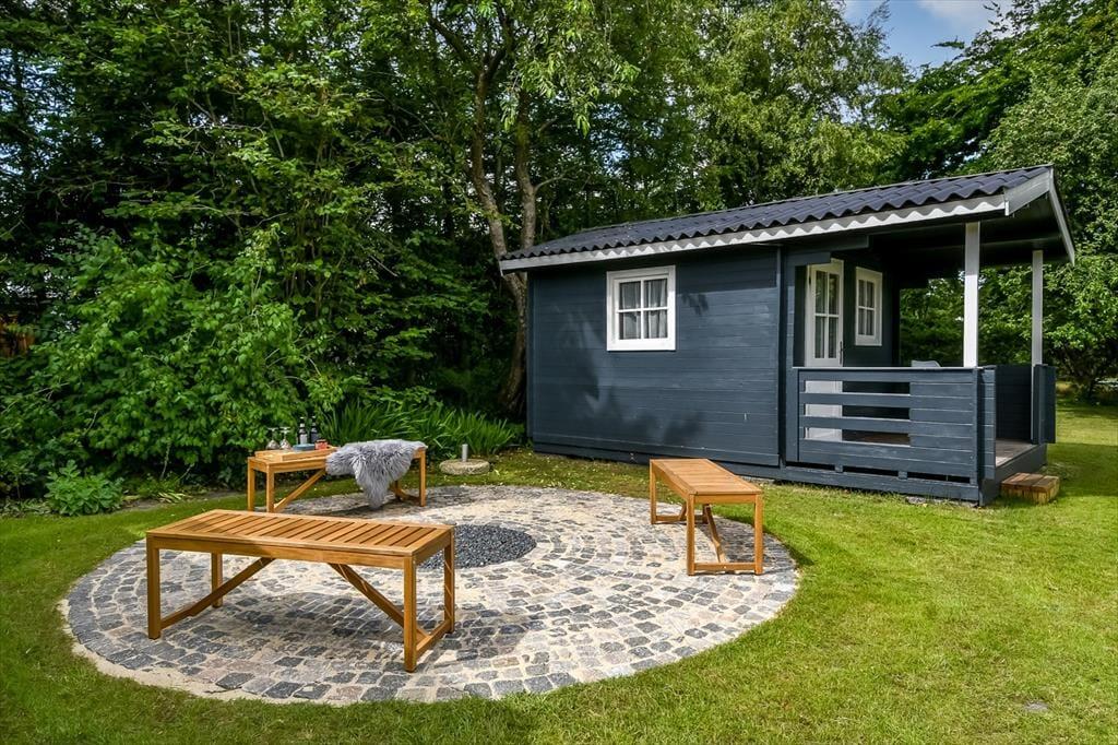 Udenfor fortsætter stemningen i samme afslappede stil. Grunden er omkranset af høje træer og tætte buske, så du kan nyde privatlivet, mens solen varmer terrassen og fuglene kvidrer i trækronerne. Her kan du tage morgenkaffen med udenfor i nattøj og bare tæer – eller finde skumfiduserne frem og tænde op i bålstedet, når solen går ned, og himlen farves orange bag trætoppene. Der er masser af plads til at slappe af i solen eller lege i det grønne græs, og du vil hurtigt opleve, hvordan hverdagens travlhed fordufter, mens du finder din egen rytme mellem havestolene og den friske fjordluft.