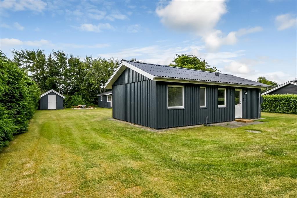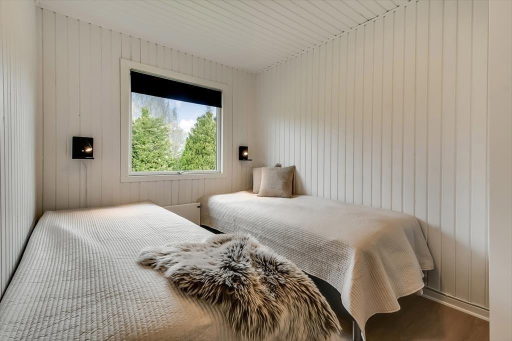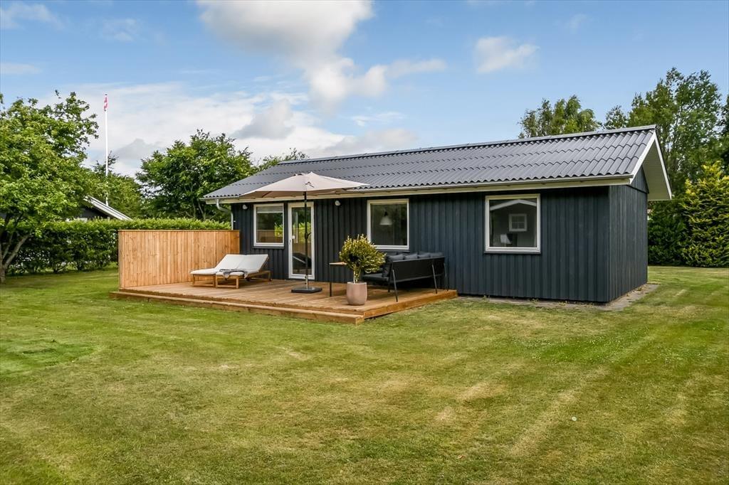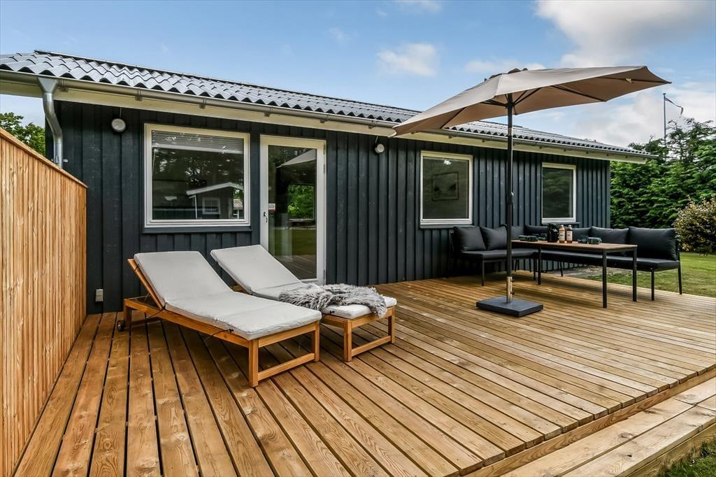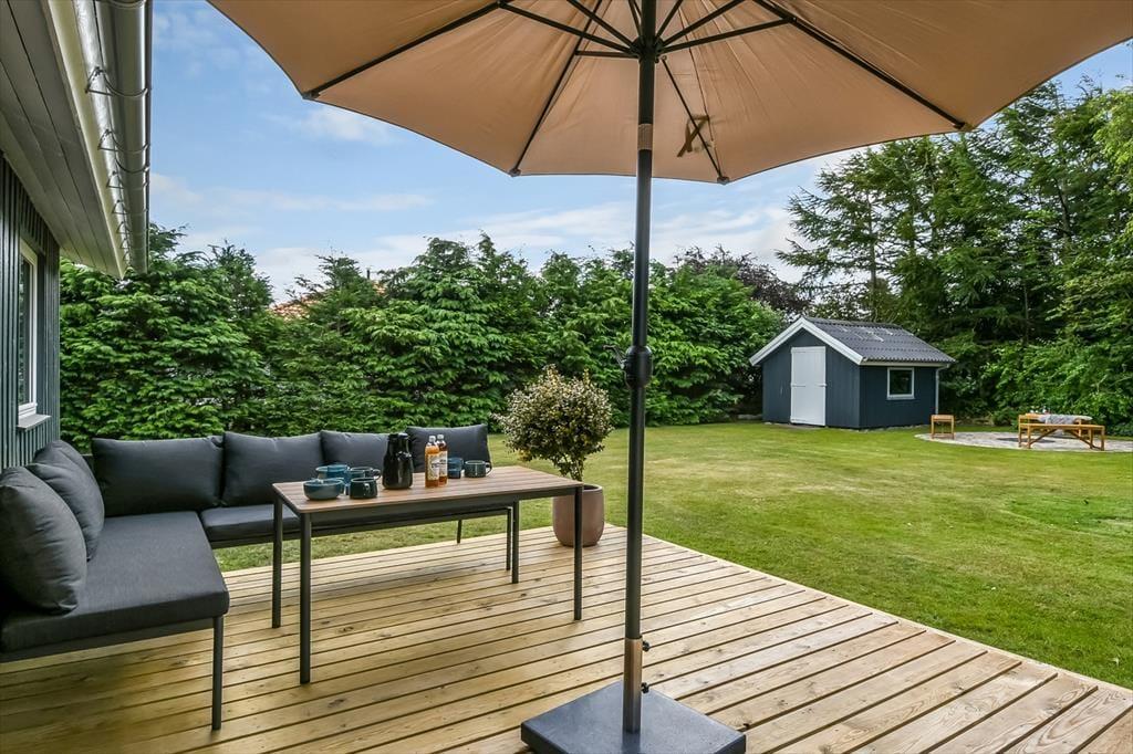 Udenfor fortsætter stemningen i samme afslappede stil. Grunden er omkranset af høje træer og tætte buske, så du kan nyde privatlivet, mens solen varmer terrassen og fuglene kvidrer i trækronerne. Her kan du tage morgenkaffen med udenfor i nattøj og bare tæer – eller finde skumfiduserne frem og tænde op i bålstedet, når solen går ned, og himlen farves orange bag trætoppene. Der er masser af plads til at slappe af i solen eller lege i det grønne græs, og du vil hurtigt opleve, hvordan hverdagens travlhed fordufter, mens du finder din egen rytme mellem havestolene og den friske fjordluft.