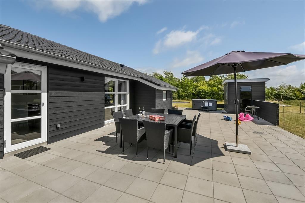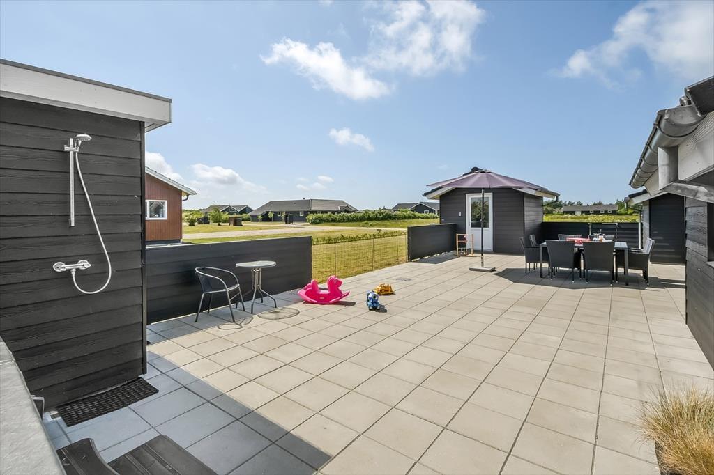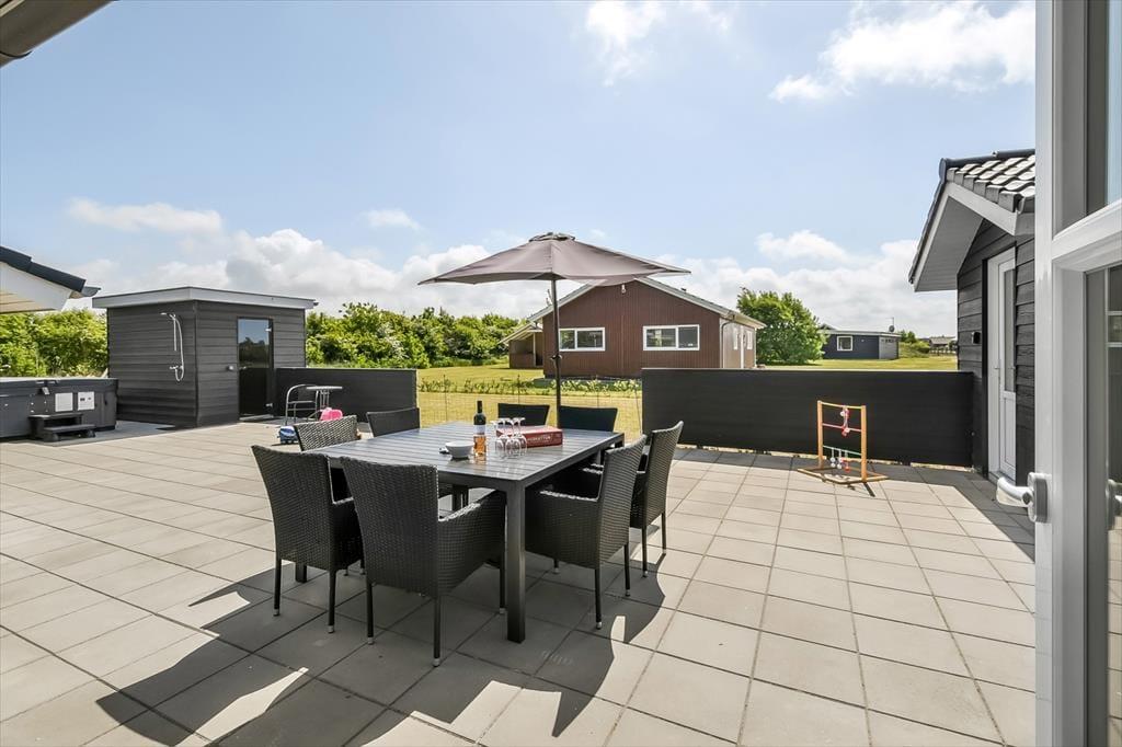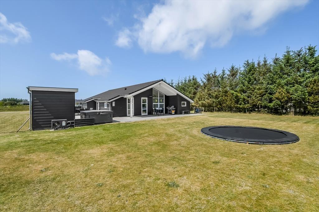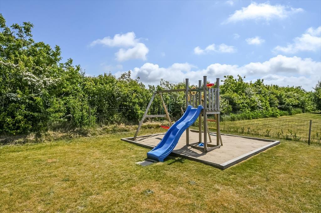 Udenfor folder ferieglæden sig for alvor ud. Terrassen bliver hurtigt jeres foretrukne opholdssted – her kan morgenkaffen nydes med fuglefløjt i baggrunden, mens solen langsomt får magt over dagen. Børnene vil elske at have deres egen lille legeplads med gyngestativ, rutsjebane, trampolin og sandkasse, og imens kan de voksne nyde en stille stund i spabadet eller tage et forfriskende skyl i udebruseren. Om aftenen kan I lade dagen runde af under åben himmel på den skønne terrasse, måske med lyden af latter og glade børnestemmer i baggrunden. Haven er indhegnet og giver derfor god tryghed, hvis I har hunde eller mindre børn med – her er der plads til både leg, ro og nærvær.