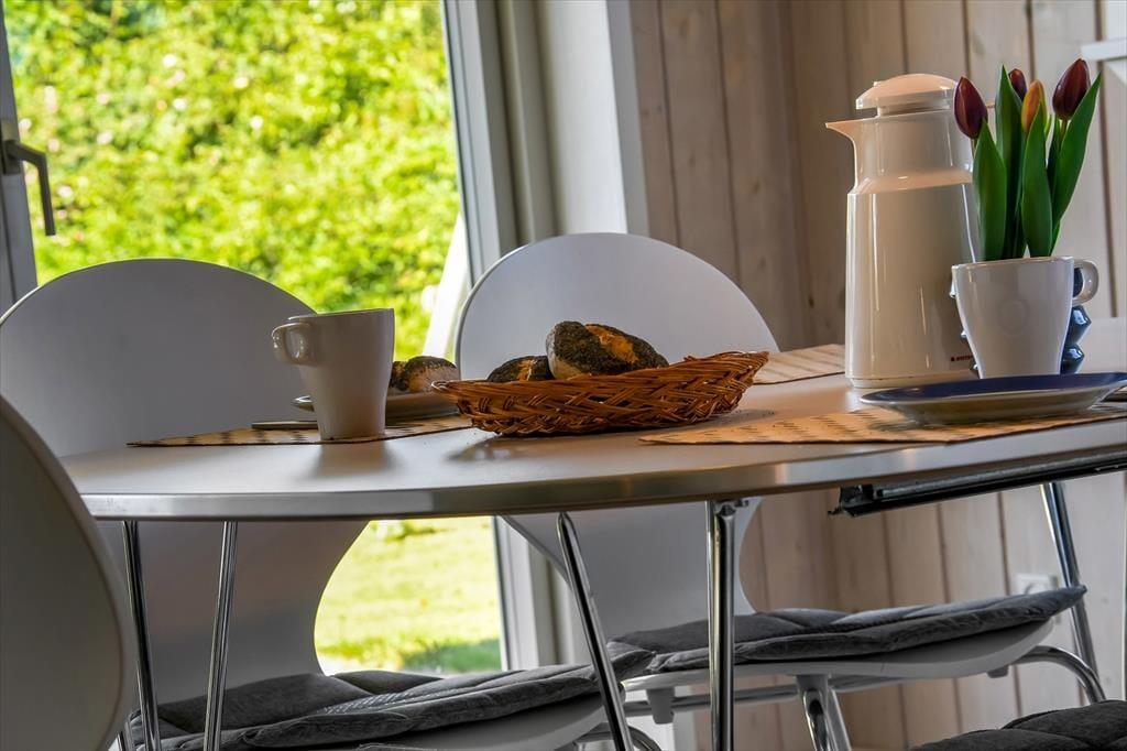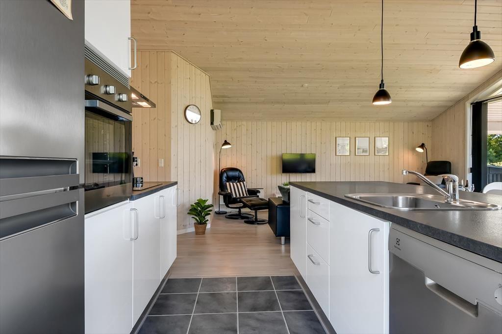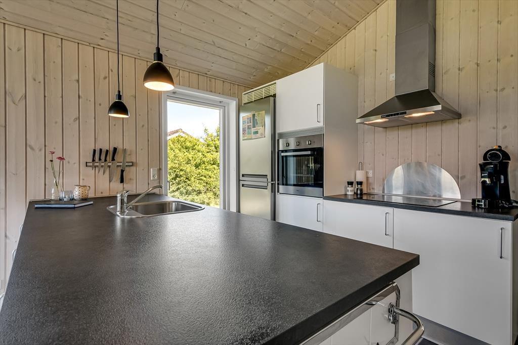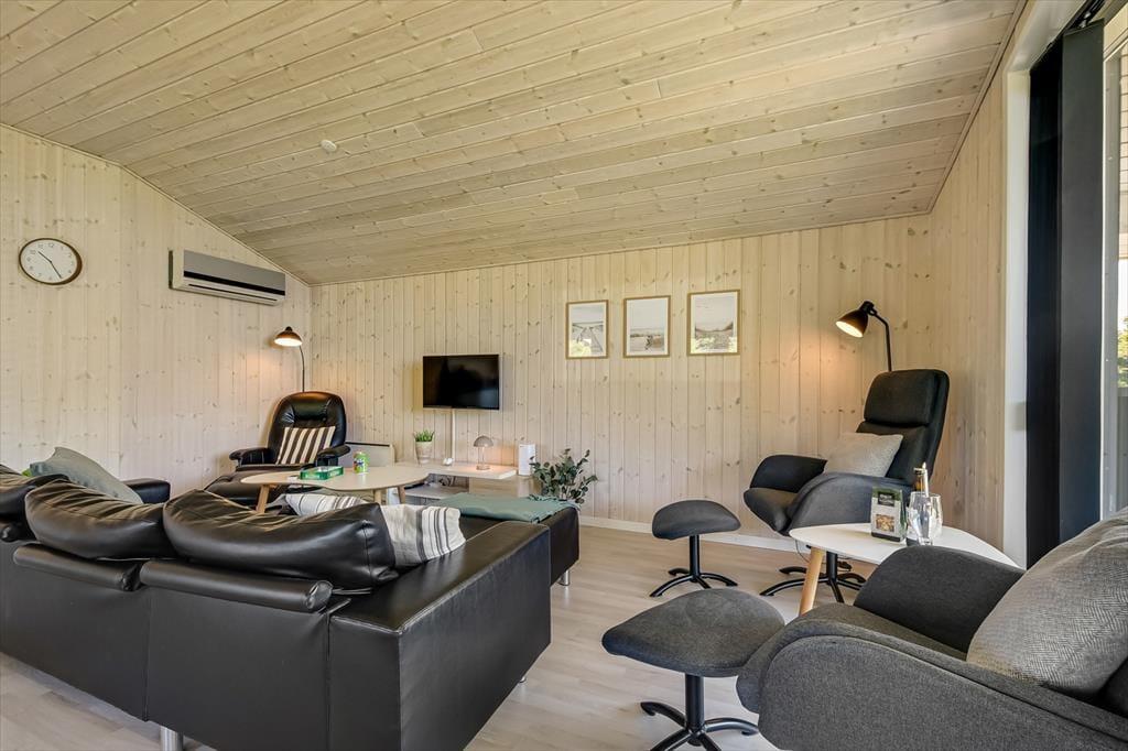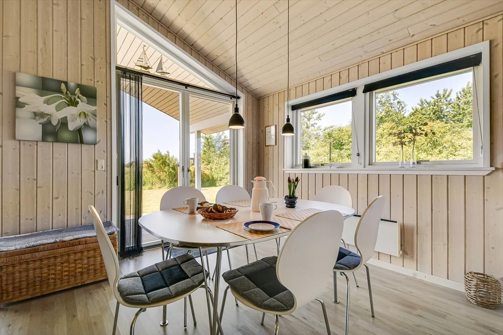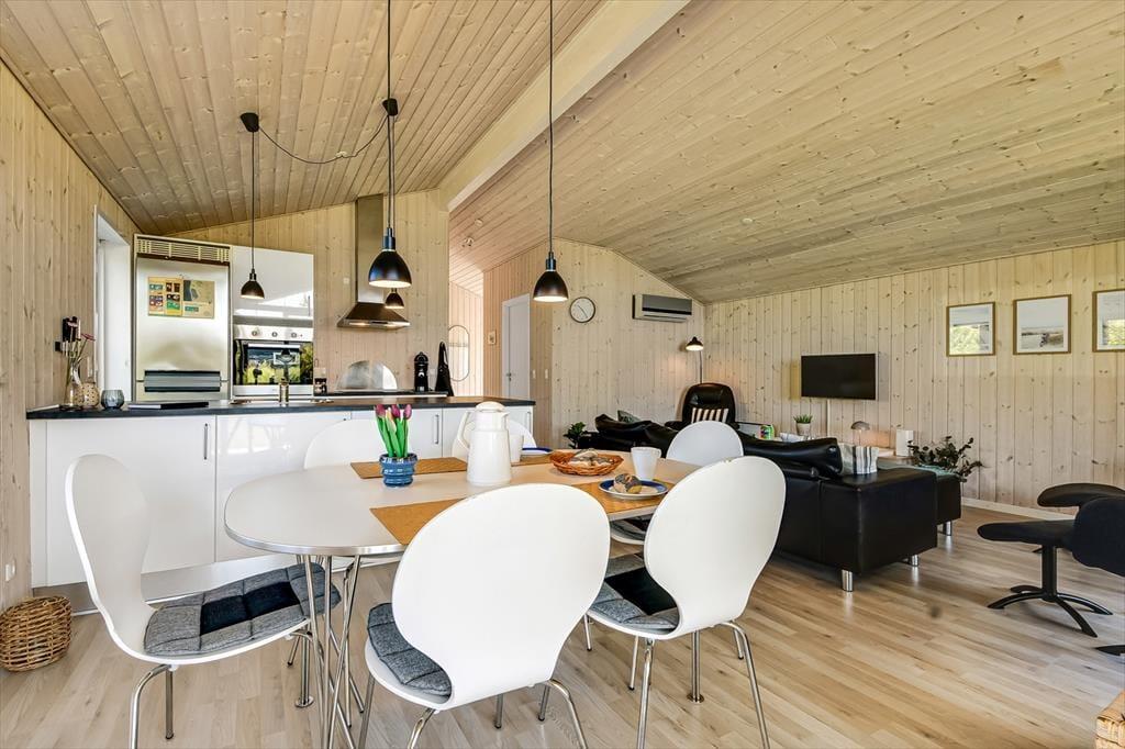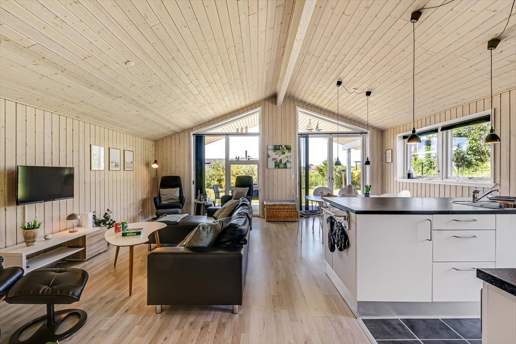 Når du træder indenfor i sommerhuset, bliver du mødt af et lyst og rummeligt leverum, hvor stue, spisestue og køkken smelter sammen til ét hyggeligt opholdsrum. Her er det oplagt at samles med familien om dagens måltider ved spisebordet, mens snakken går og duften af mad spreder sig fra køkkenet. Efter middagen kan I slænge jer i sofaen med et spil kort eller en god film, mens aftenen falder på udenfor. Indretningen skaber en afslappet atmosfære, hvor der er plads til både fælles oplevelser og stille stunder, så ferien kan leves i præcis det tempo, I ønsker.