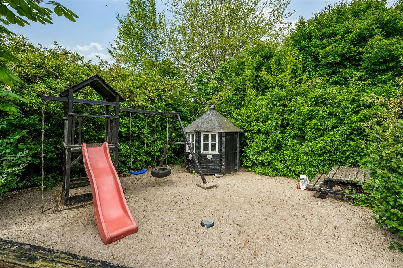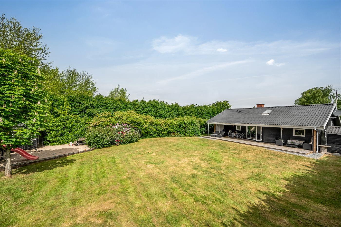 Fra køkken-alrummet er der direkte adgang til terrassen og den store grund, som er omkranset af buske og træer. Her er masser af plads og gode rammer for sjov og leg for både hunde og børn – og barnlige sjæle??
