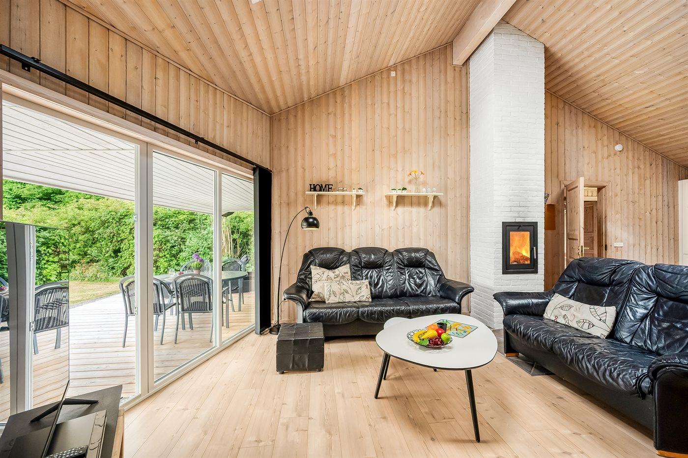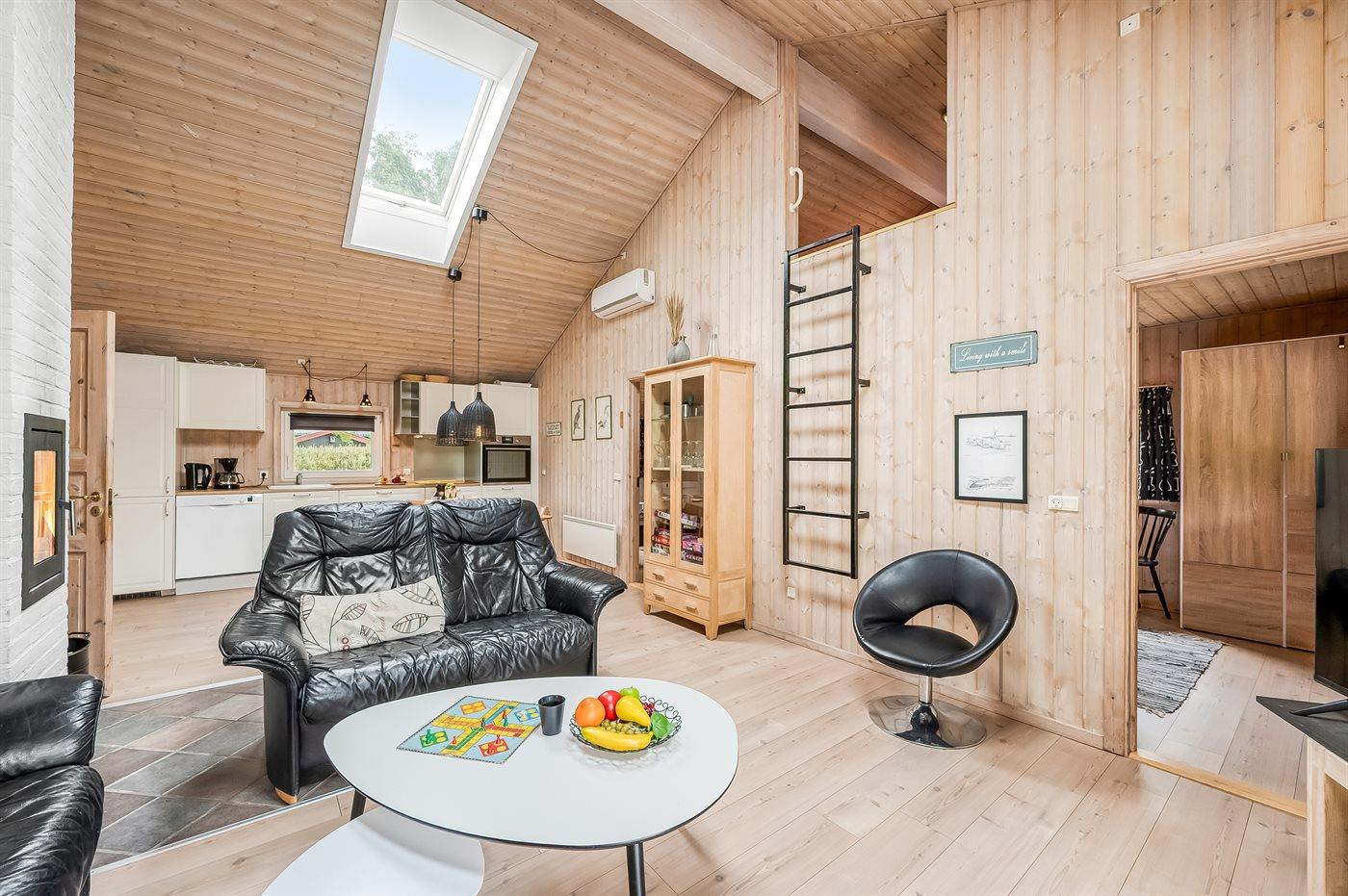 I det smukke og højloftede køkken-alrum strømmer lyset ind gennem det store terrassedørsparti samt ovenlysvinduerne, og hvis I virkelig vil skrue op for hyggen, så kan I tænde op i den smukke pejs. Det store badeværelse inviterer til wellness og selvforkælelse. Efter en dejlig dag i naturen er der god plads til afslapning i det store spabad, eller I kan gå i sauna, hvor varmen får jer til at slappe af både fysisk og psykisk.
