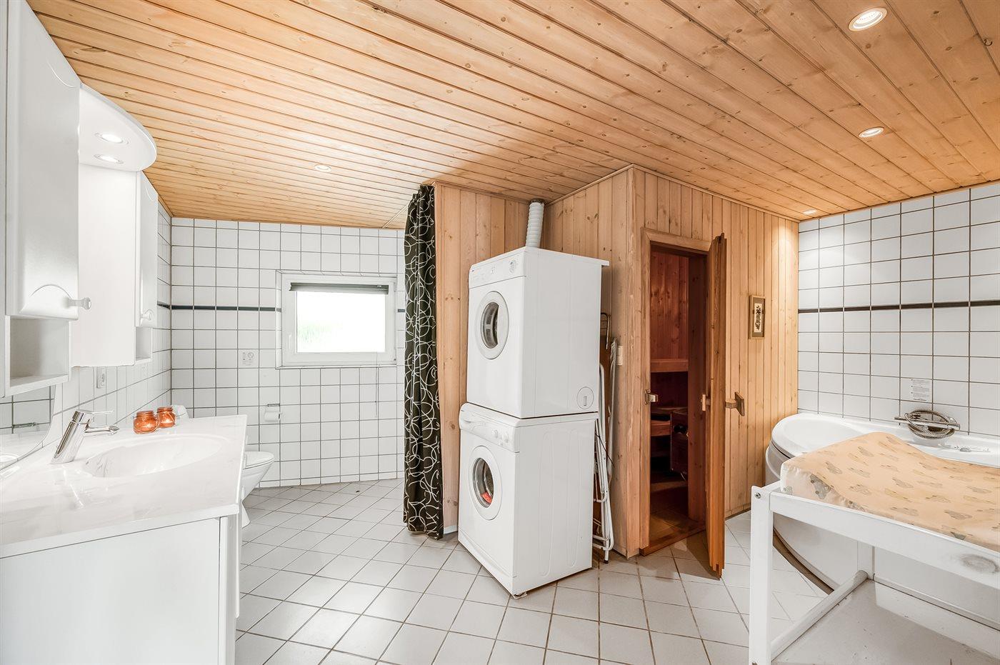 Der er 1 badeværelse med bruseniche og 1 toilet.. Der er gulvvarme på 1 badeværelse. I saunaen er der mulighed for afslapning.