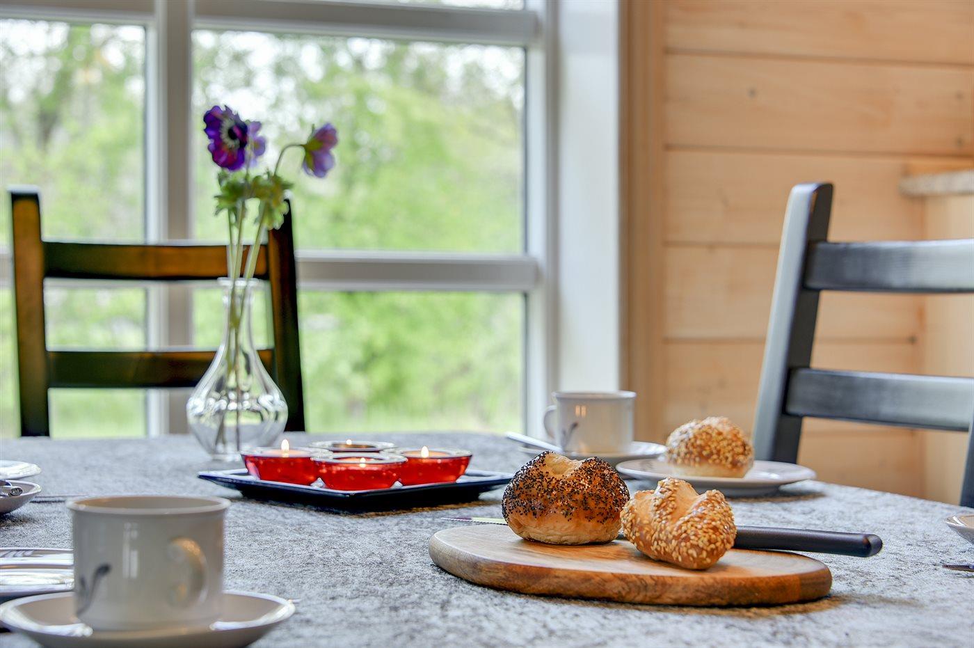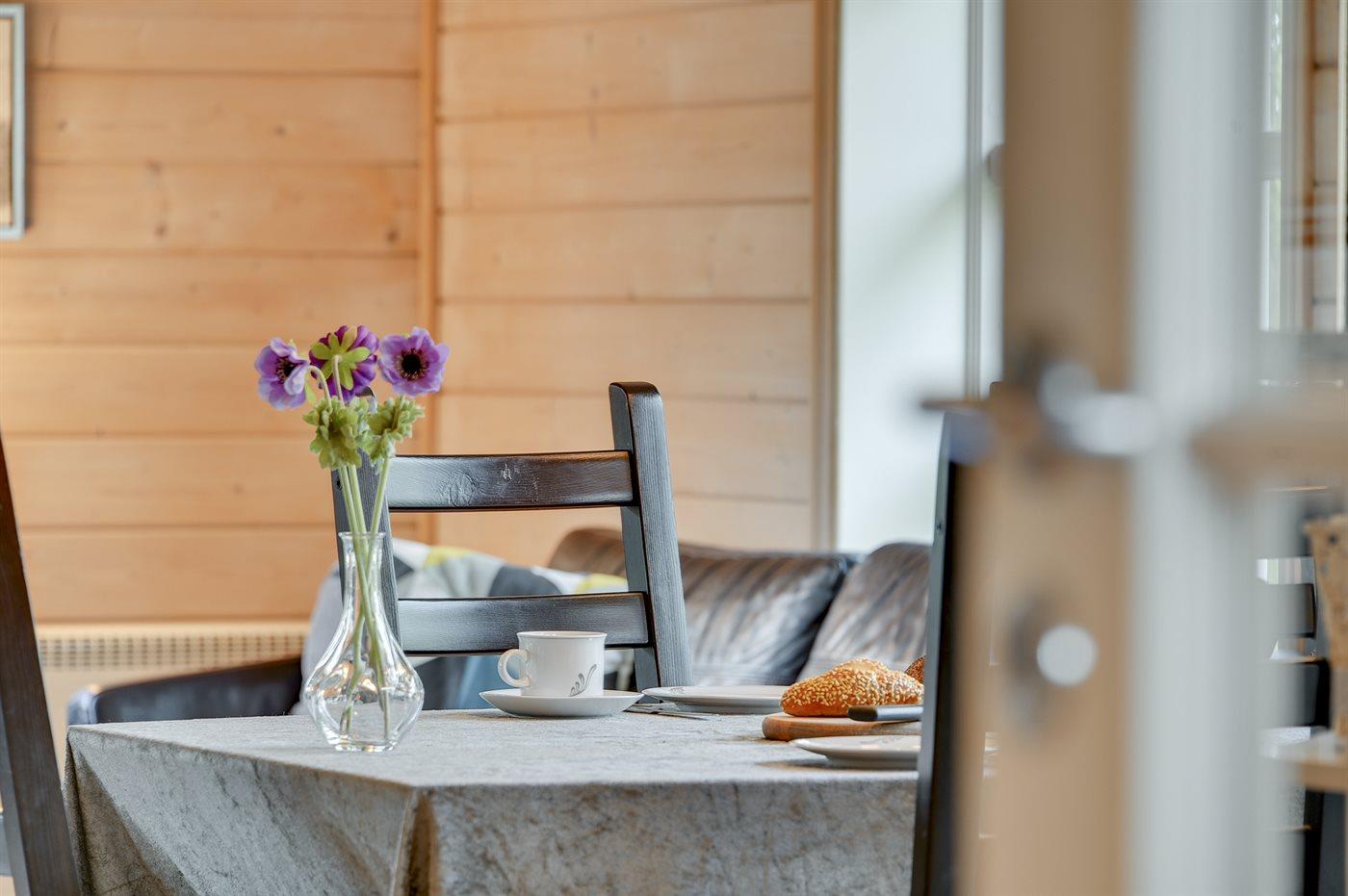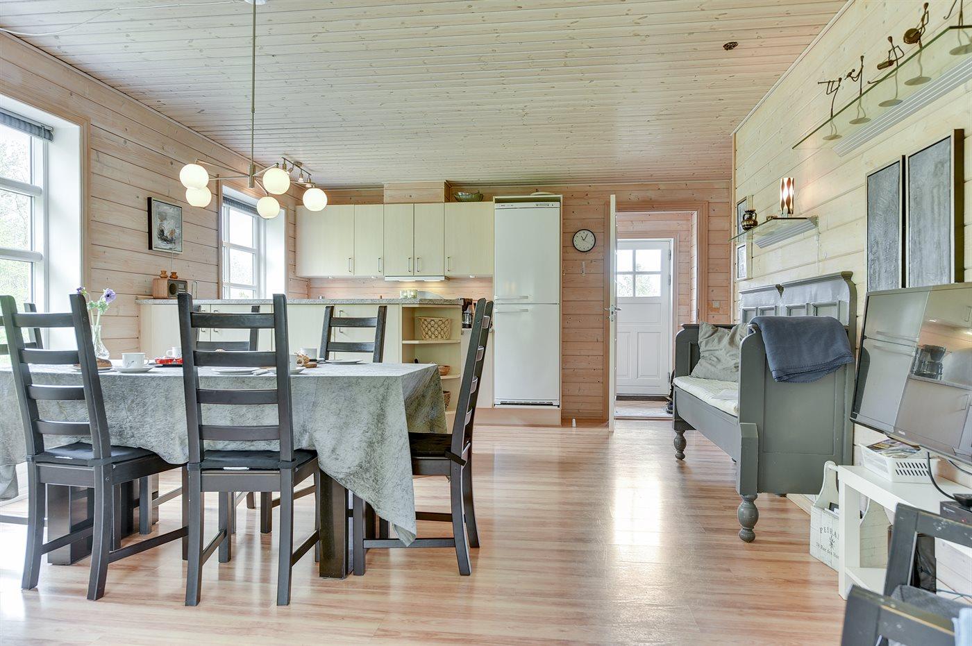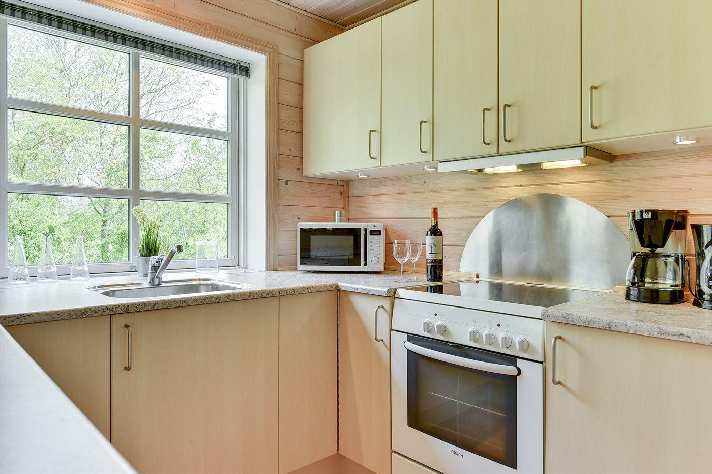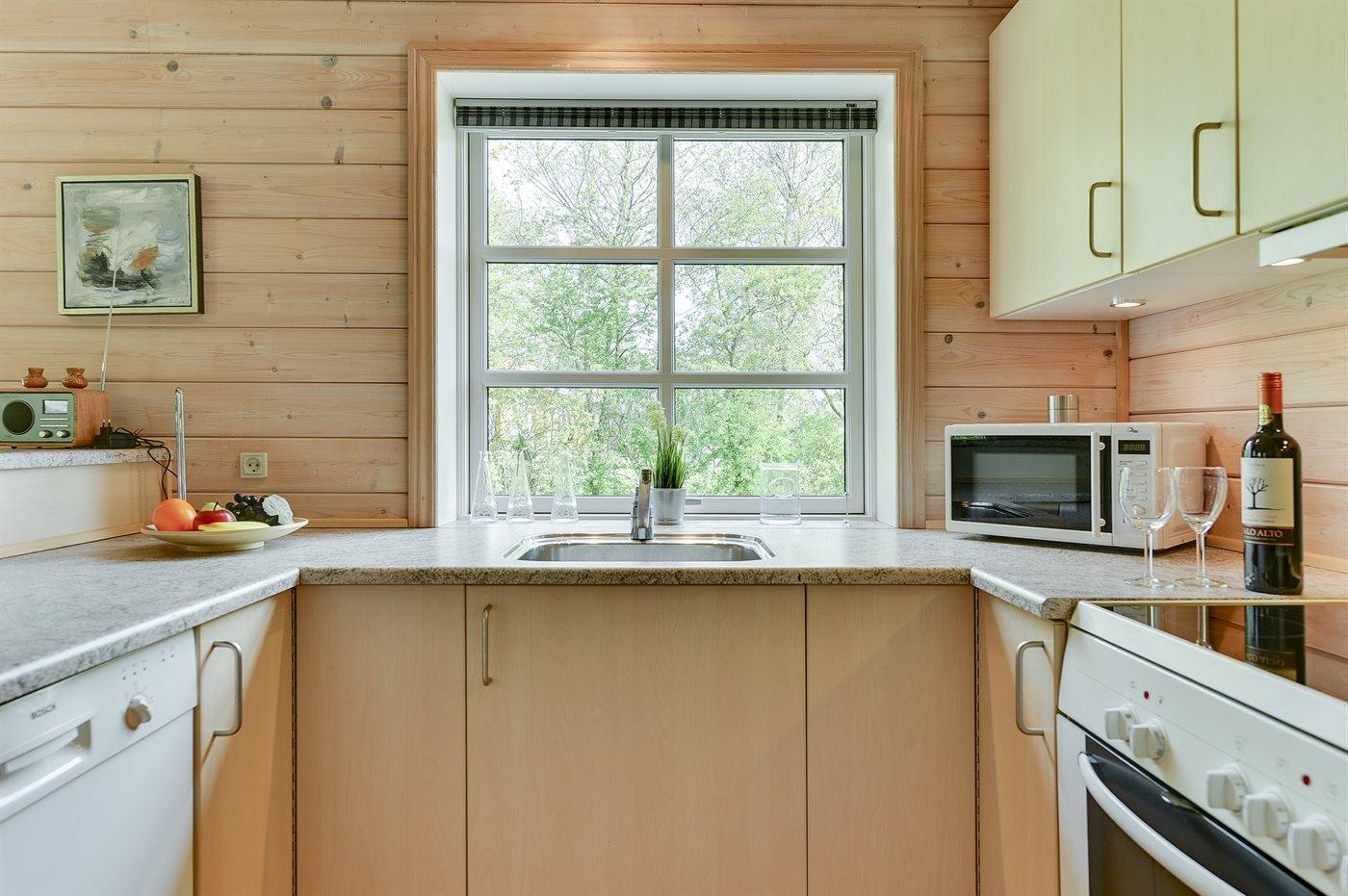 Køkkenet er udstyret med 1 køleskab. Der er 4 keramiske kogeplader, varmluftovn, mikrobølgeovn samt opvaskemaskine.