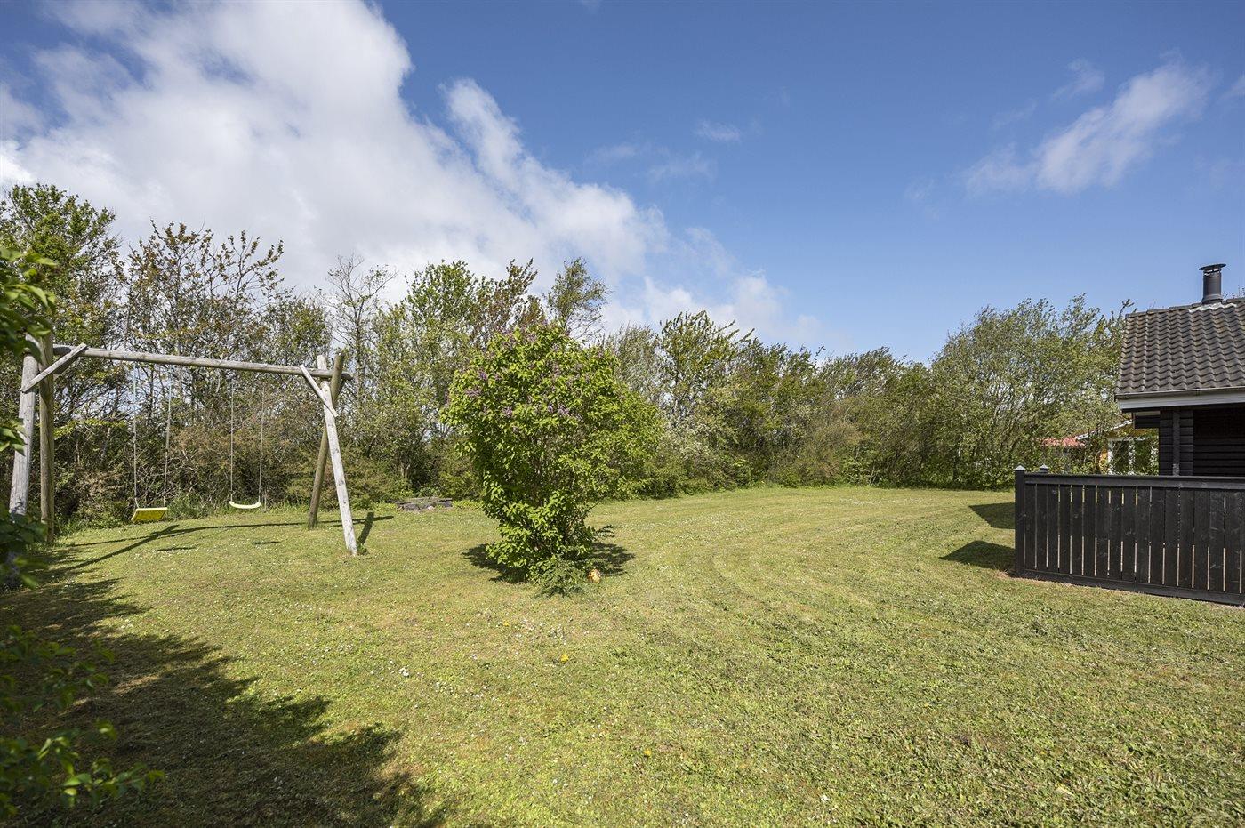 Ferieboligen er beliggende på en 1350 m² stor naturgrund. Der er 13100 m til havet. Der er 500 m til fjorden. Der er en sø i en afstand af 200 m. Nærmeste forretning er beliggende i en afstand af 250 m. Til ferieboligen hører 15 m² terrasseareal. Desuden er der 12 m² overdækket terrasse. Der er redskabsrum. Gynge. Der er installeret stik til opladning af elbil. Parkering ved ferieboligen.