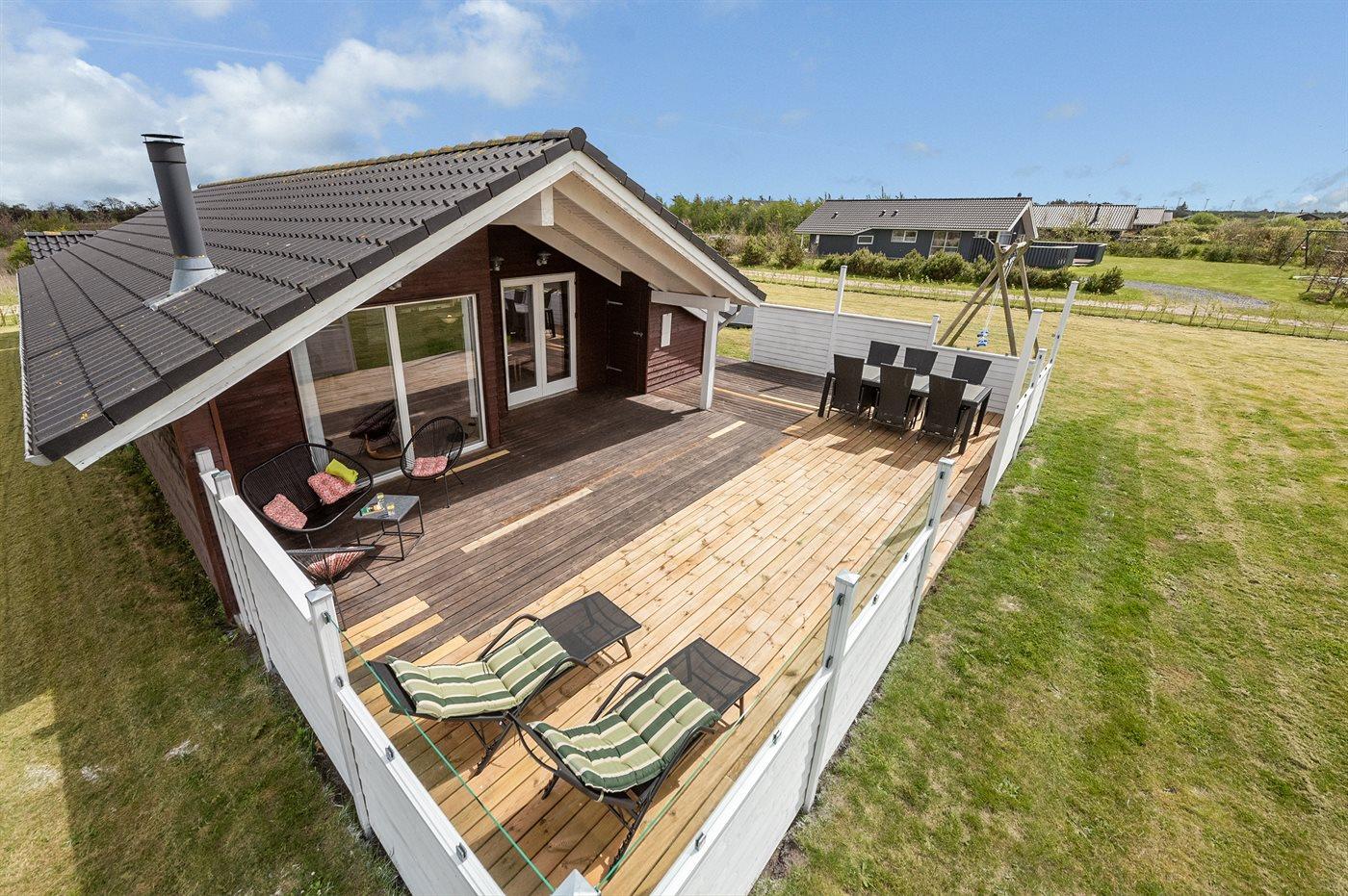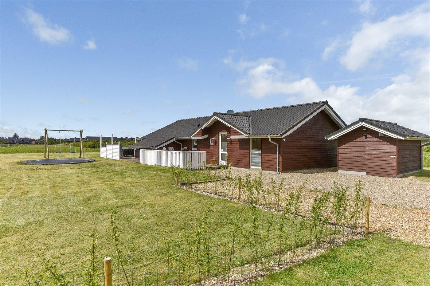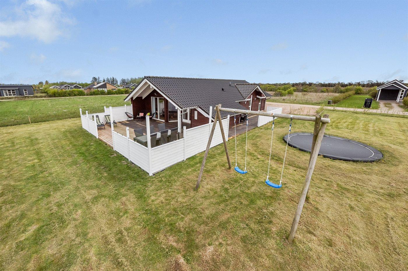 Ferieboligen er beliggende på en 1200 m² stor naturgrund. Der er 14000 m til havet. Der er 1250 m til fjorden. Nærmeste forretning er beliggende i en afstand af 500 m. Til ferieboligen hører 65 m² terrasseareal. Desuden er der 15 m² overdækket terrasse. Der er redskabsrum. Gynge. Trampolin. Der er installeret stik til opladning af elbil. Type 2 stik. Parkering ved ferieboligen.