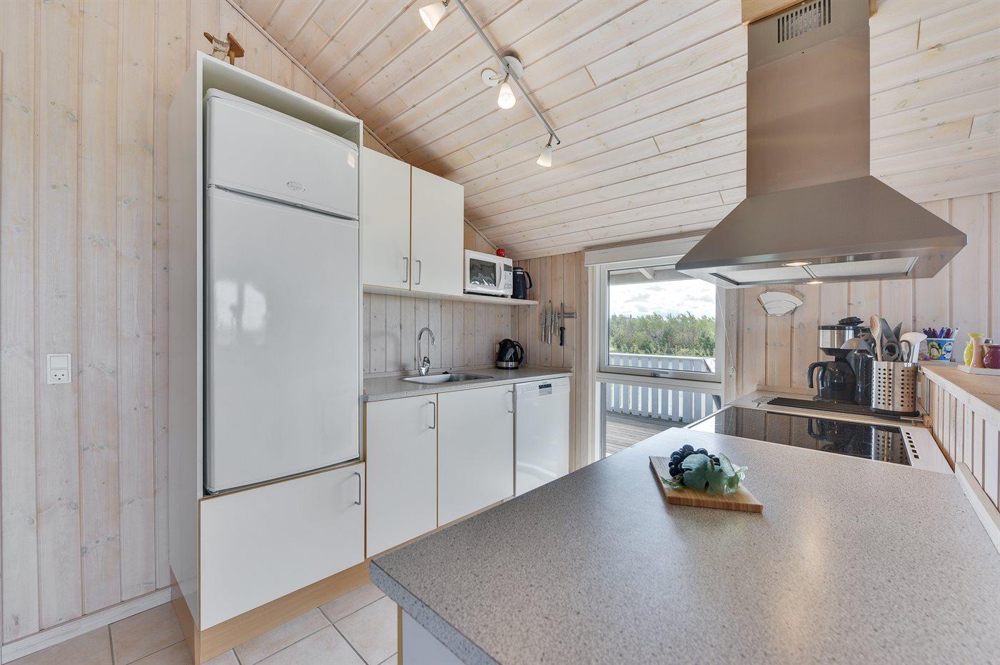 Køkkenet er udstyret med 1 køleskab. Der er 4 keramiske kogeplader, varmluftovn, mikrobølgeovn samt opvaskemaskine.