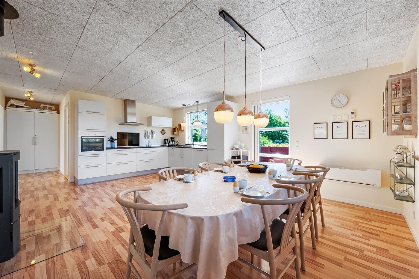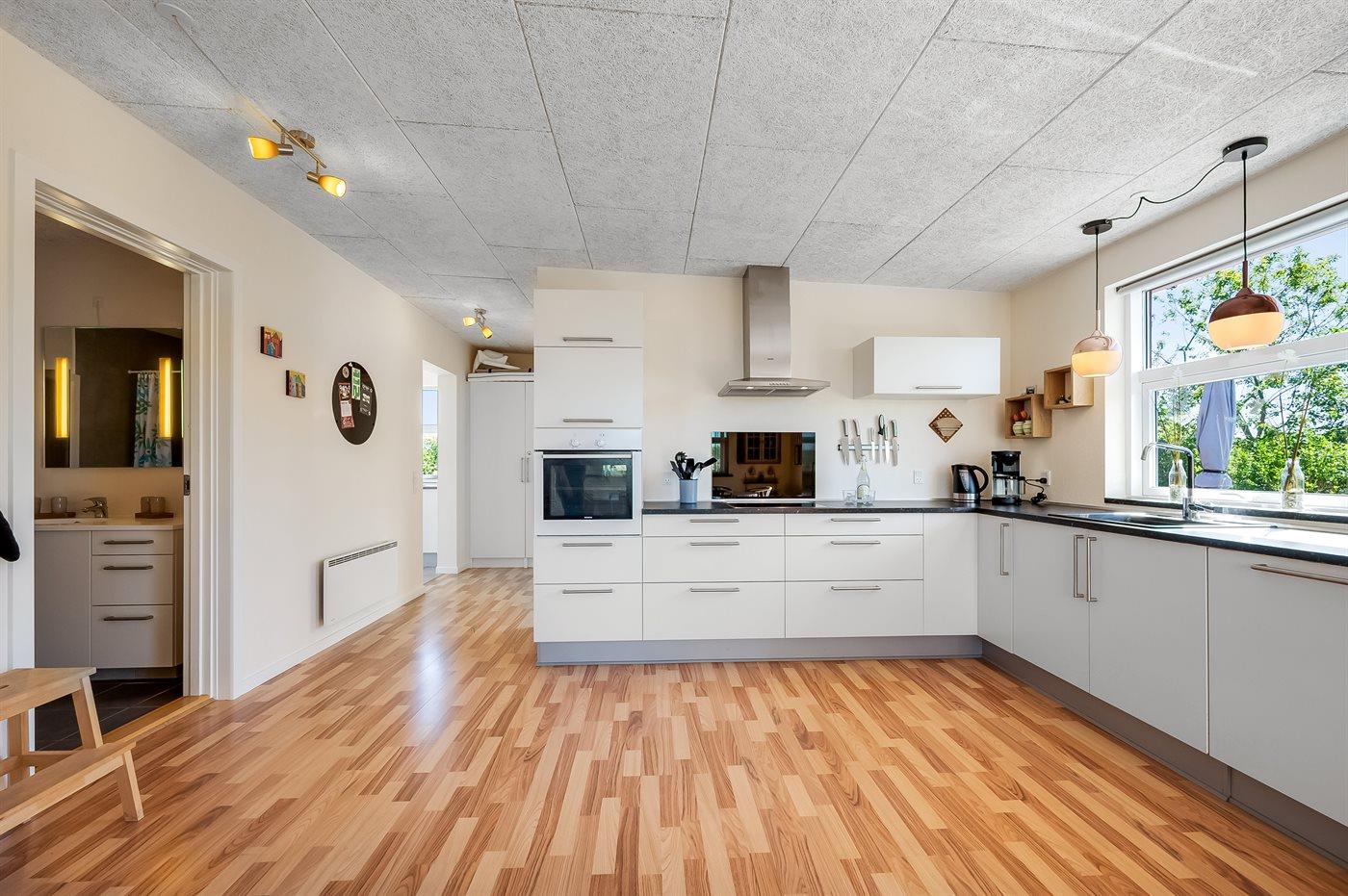 Køkkenet er udstyret med 1 køleskab. Der er 4 keramiske kogeplader, varmluftovn, mikrobølgeovn samt opvaskemaskine.