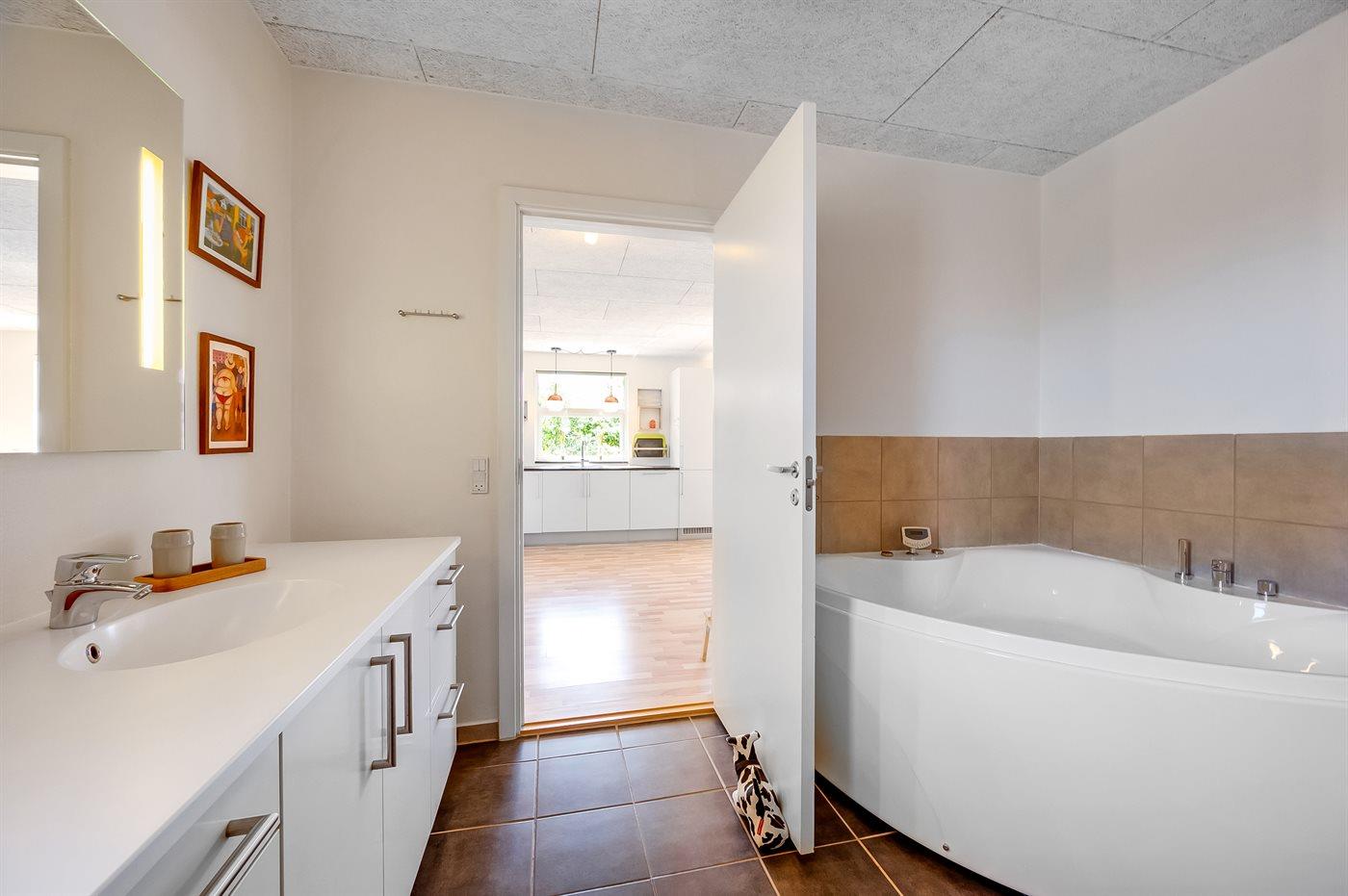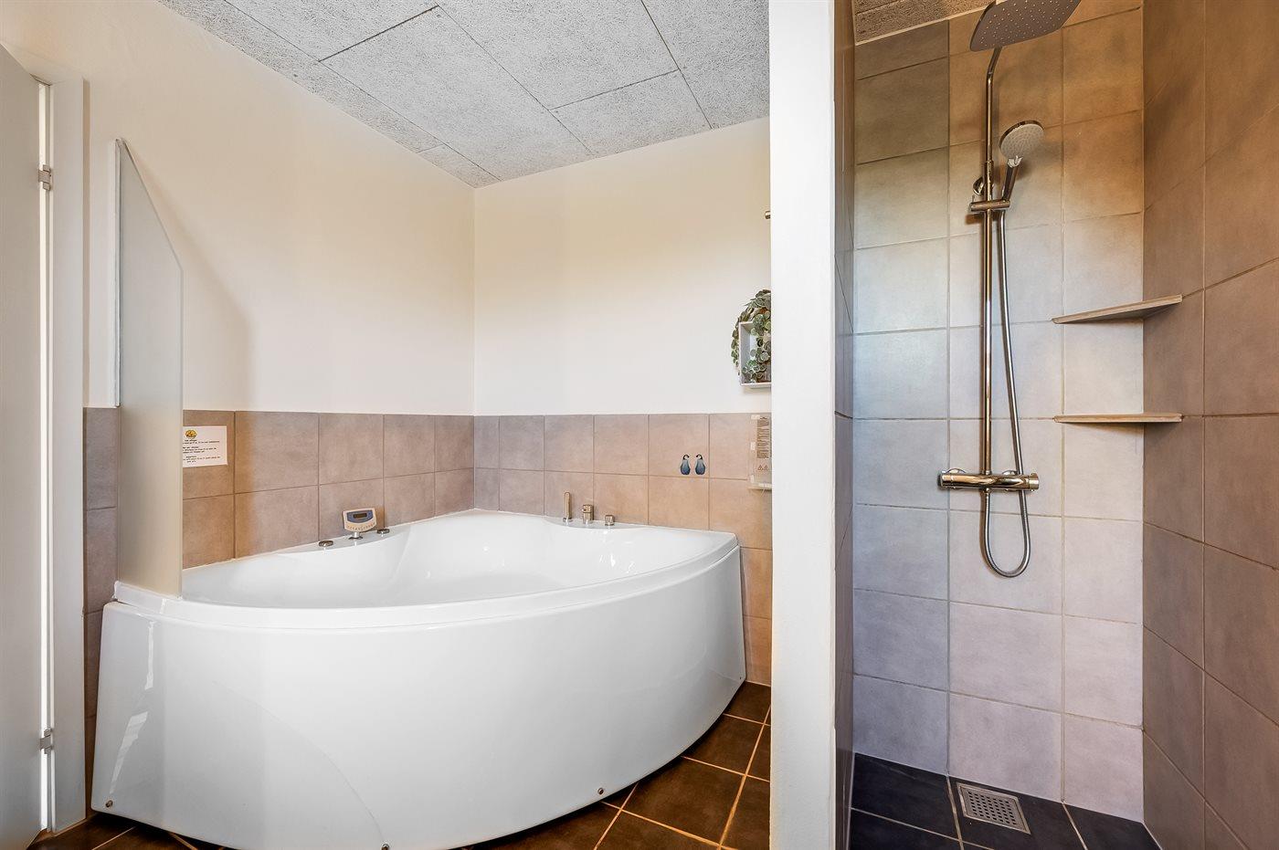 Der er 2 badeværelser med bruseniche og 2 toiletter. Der er gulvvarme på 2 badeværelser. I saunaen er der mulighed for afslapning.