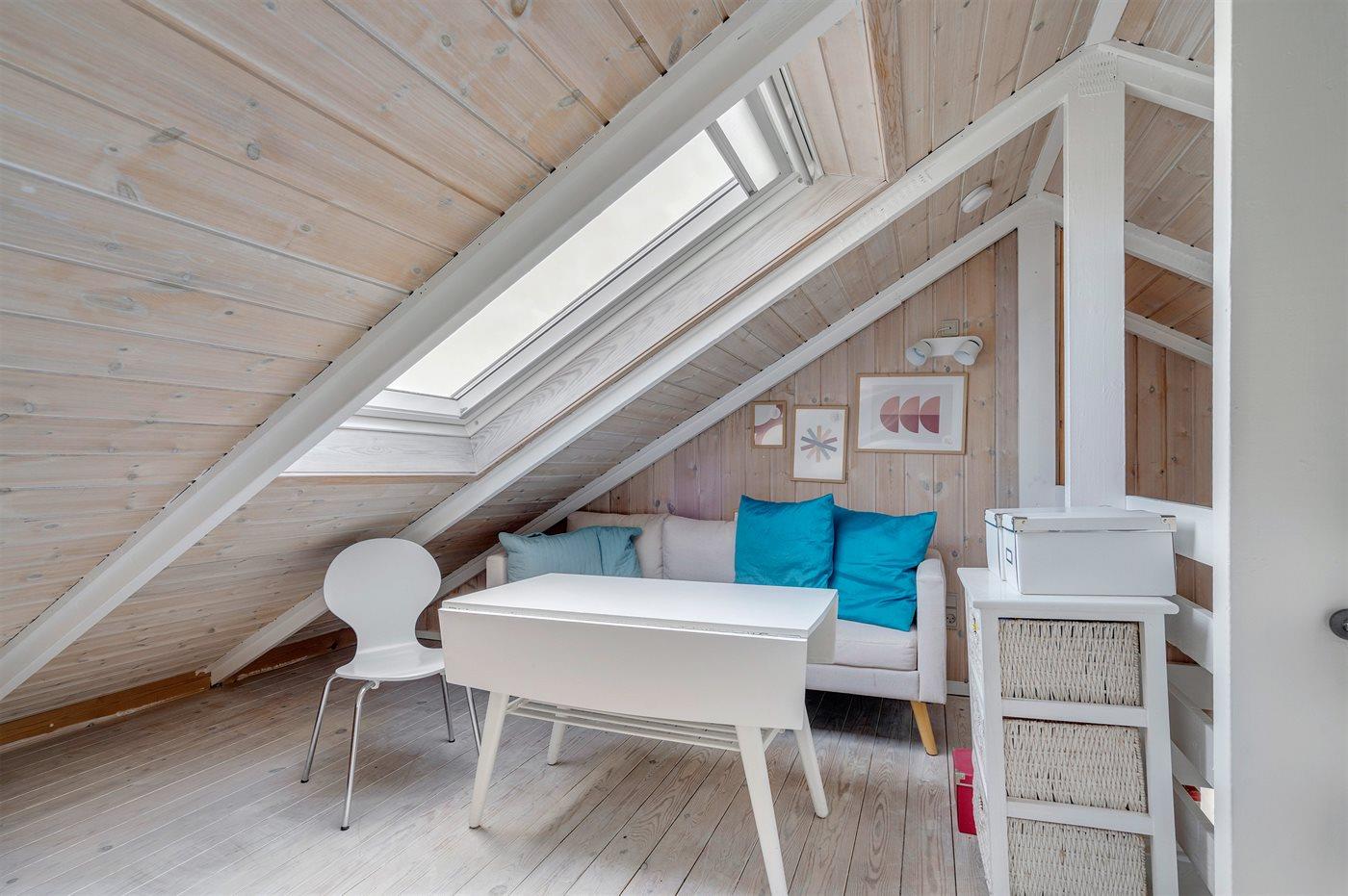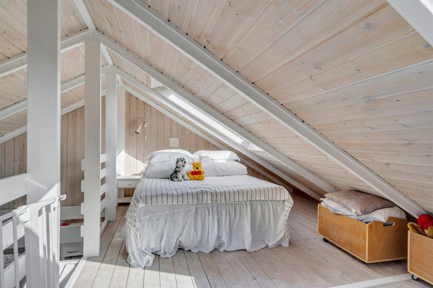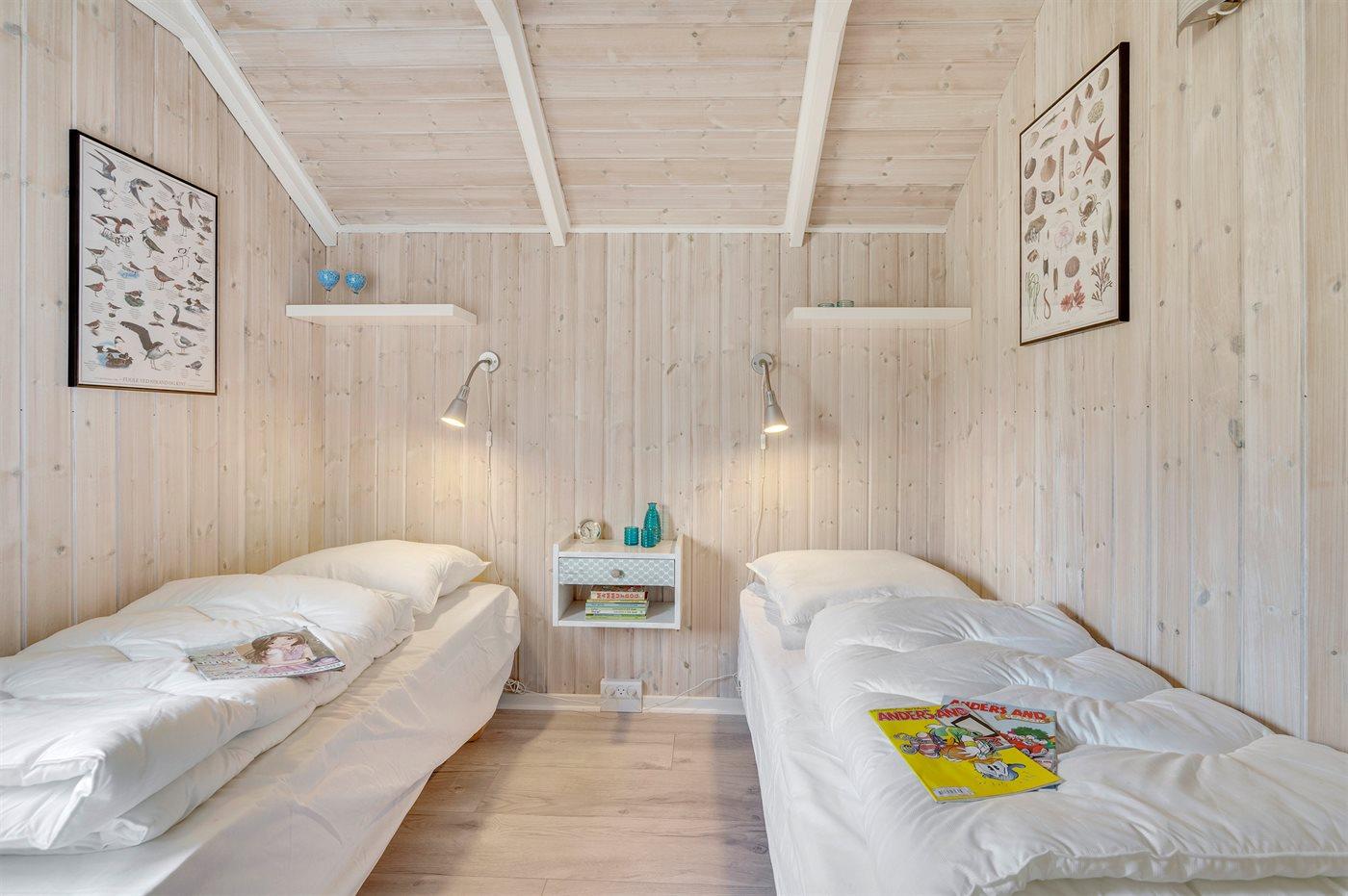 Der er i alt 2 soveværelser. Sovepladserne fordeler sig på: 4 sovepladser i dobbeltsenge. 2 sovepladser i enkeltsenge. 2 af disse sovepladser befinder sig på husets hems. Derudover er der 1 stk. barneseng.