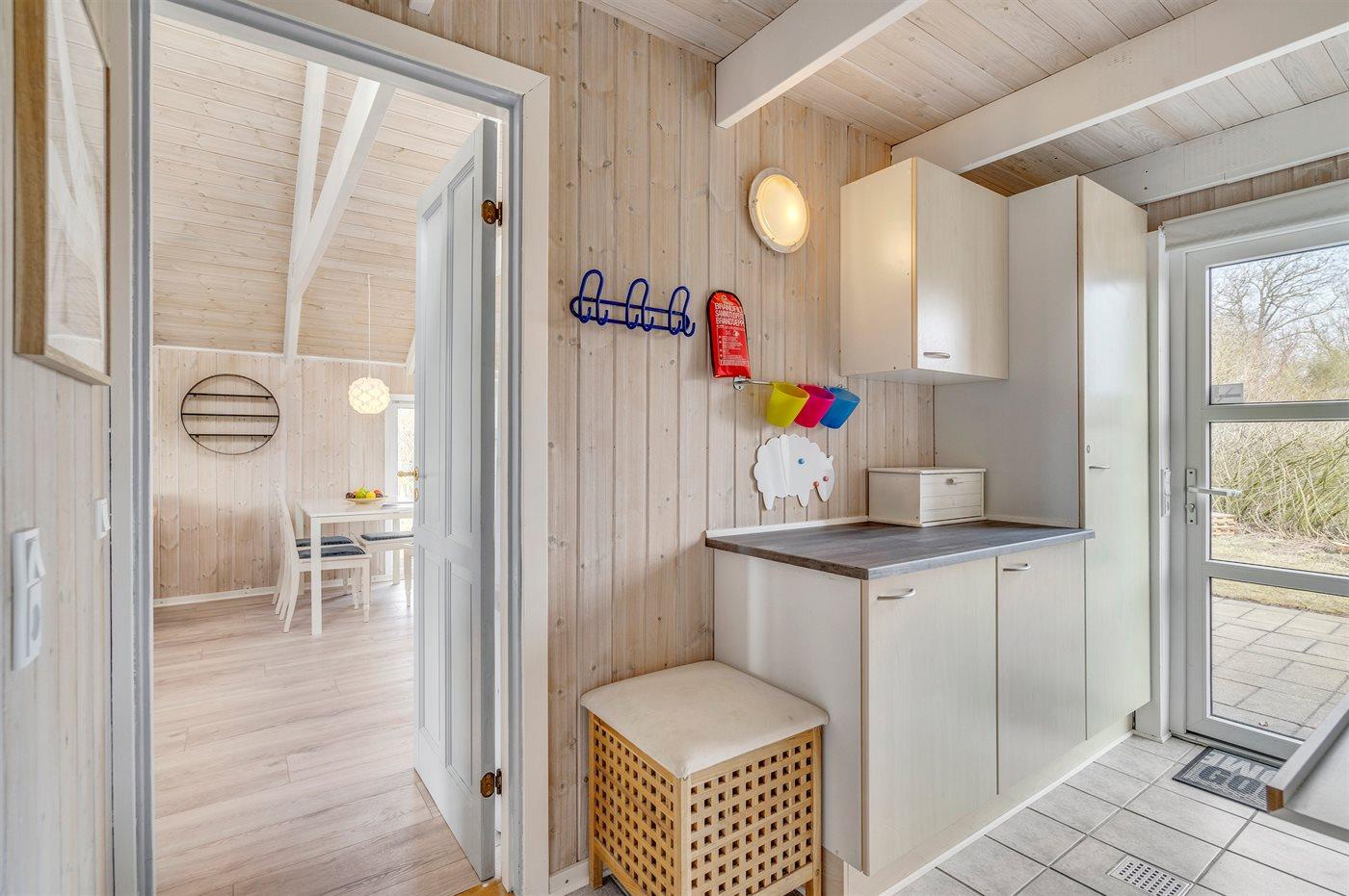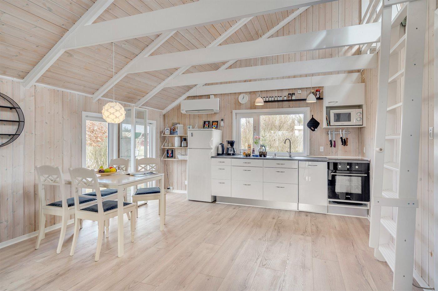 Køkkenet er udstyret med 1 køleskab. Der er 4 keramiske kogeplader, varmluftovn, mikrobølgeovn samt opvaskemaskine.