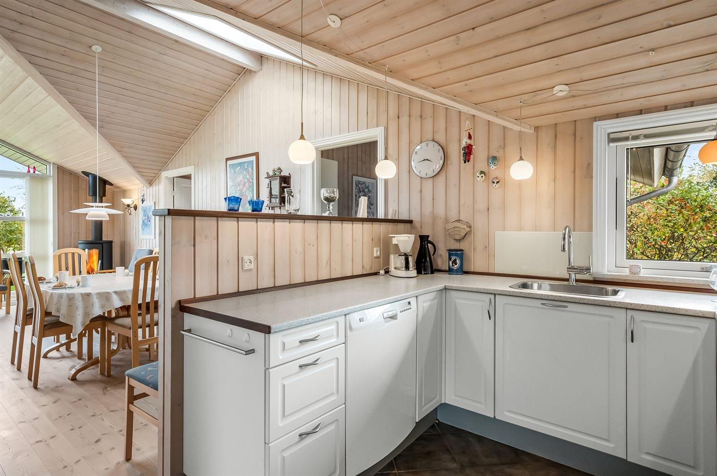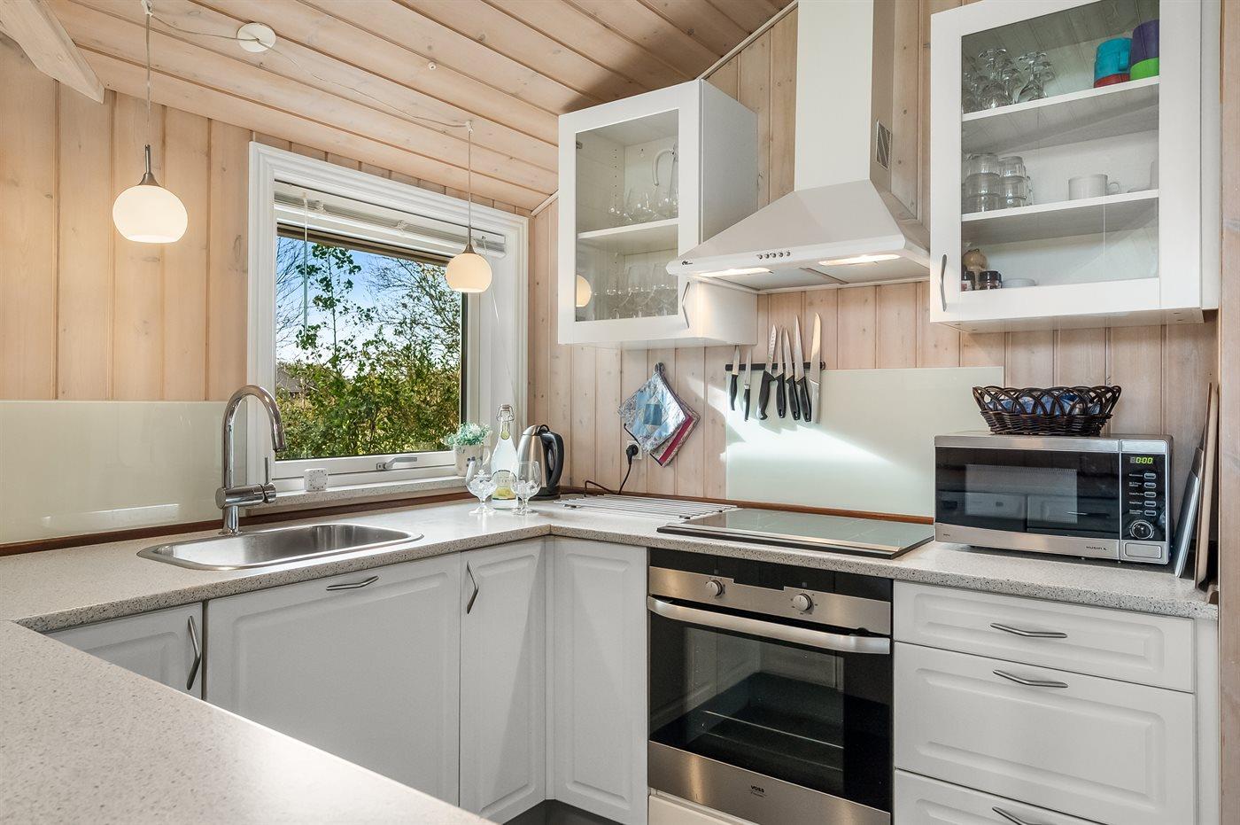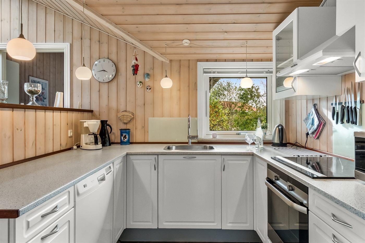 Køkkenet er udstyret med 1 køleskab. Der er 4 keramiske kogeplader, varmluftovn, mikrobølgeovn samt opvaskemaskine Der er gulvvarme i køkkenet.