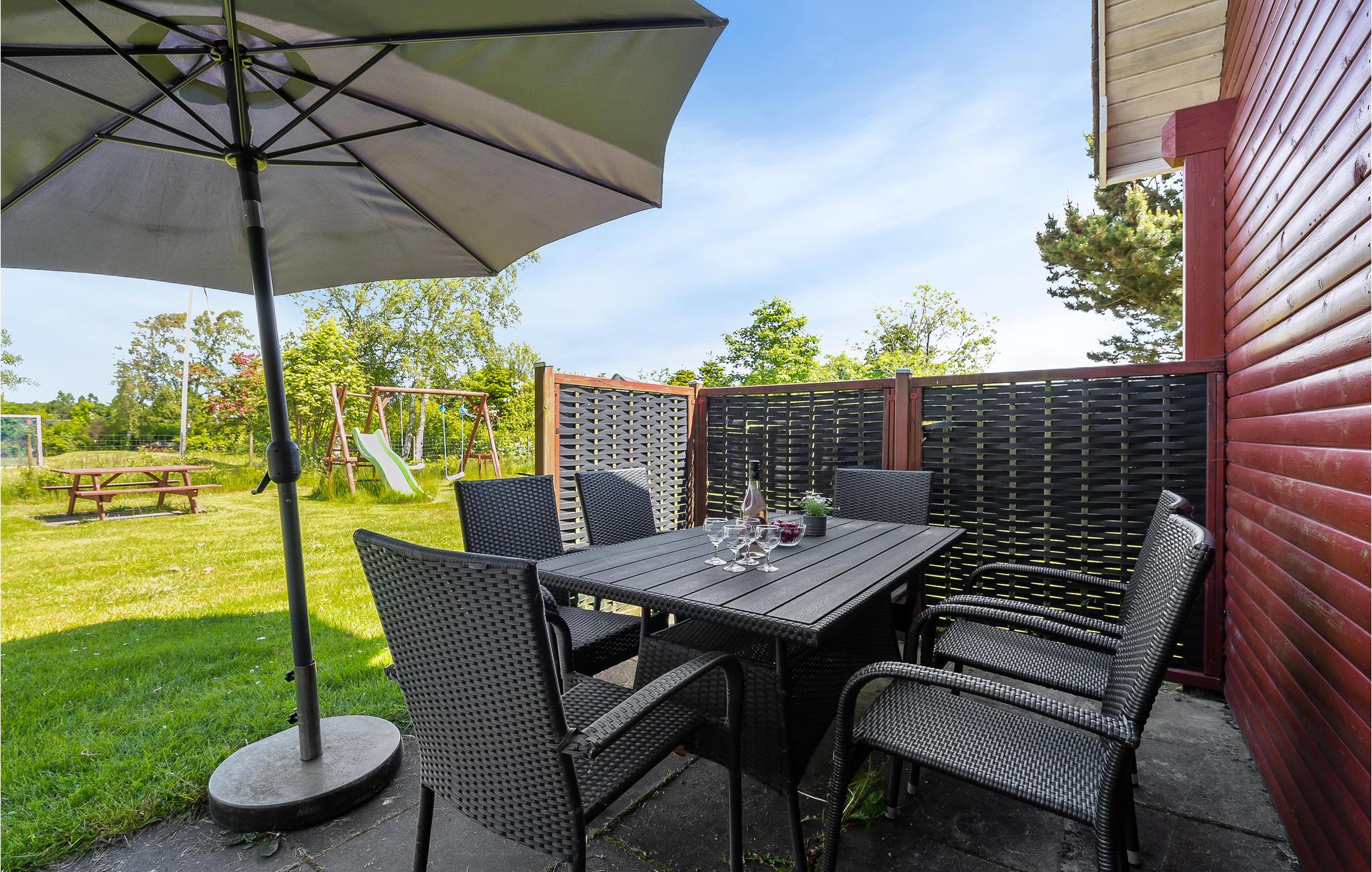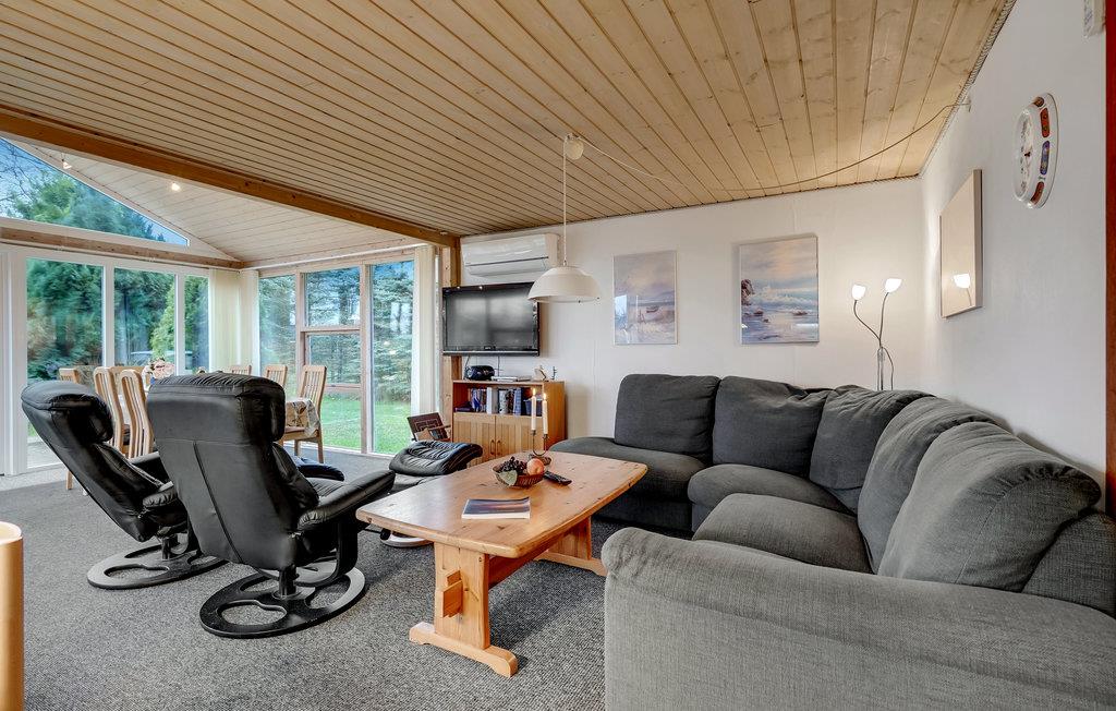 Nyd en afslappende ferie i dette familievenlige feriehus, som også vil glæde yngre gæster, for der er masser af legemuligheder. Tilbring hyggelige timer i den rummelige opholdsstue ved at bruge det indbydende sofaområde til afslappede læsetimer eller selskabelige spilleaftener. Tilbered jeres livretter sammen i det veludstyrede køkken og gør jer godt tilpas i den hyggelige spiseplads med udsigt til det grønne.