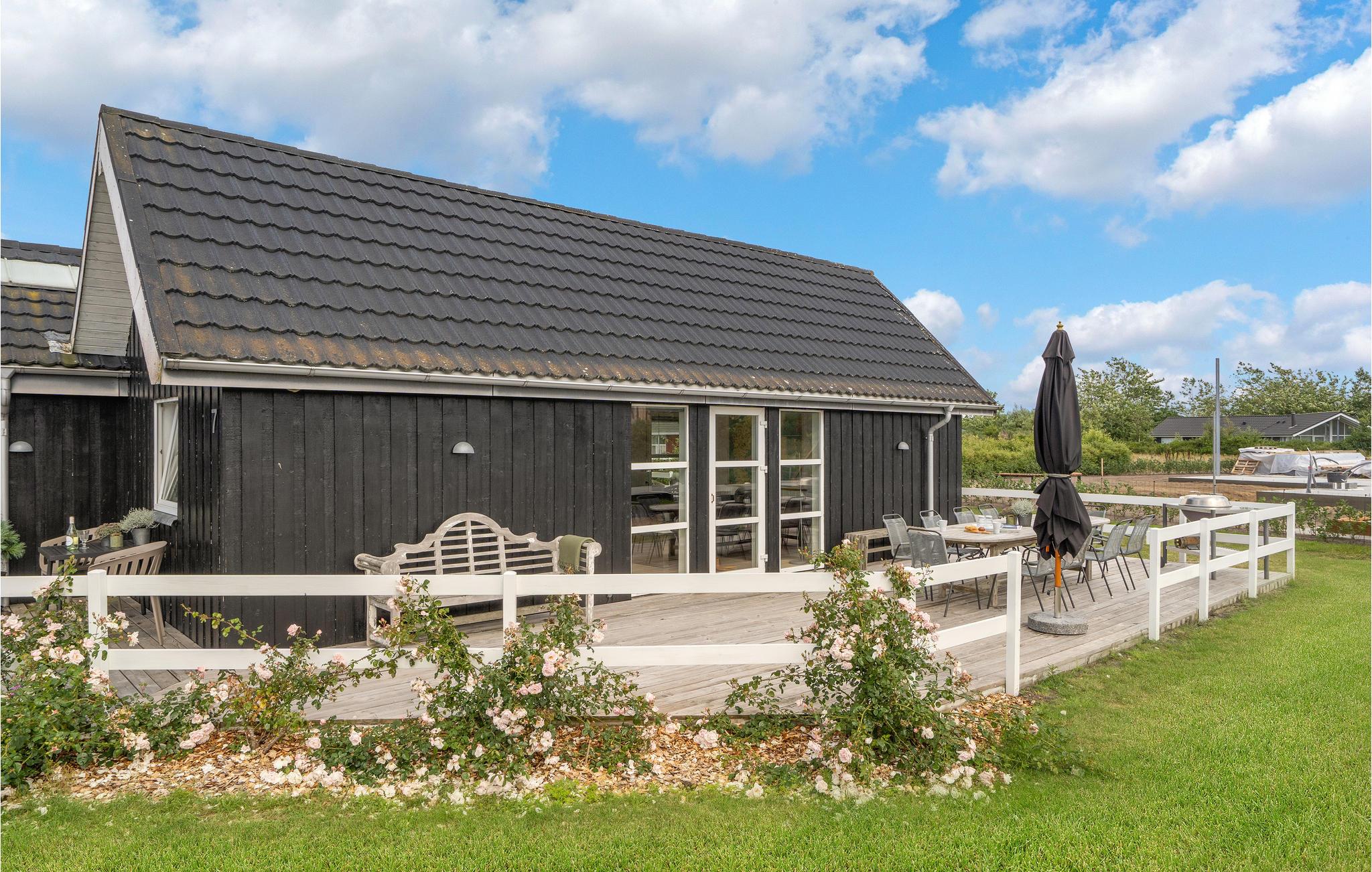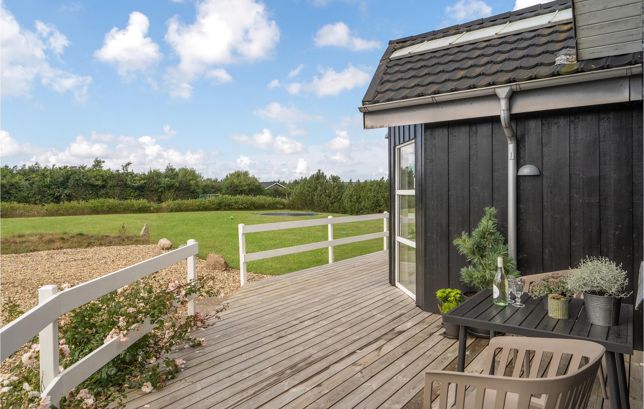 Hyggeligt feriehus ved Skaven Strand med sauna, terrasse og trampolin, perfekt til afslapning og familieaktiviteter.