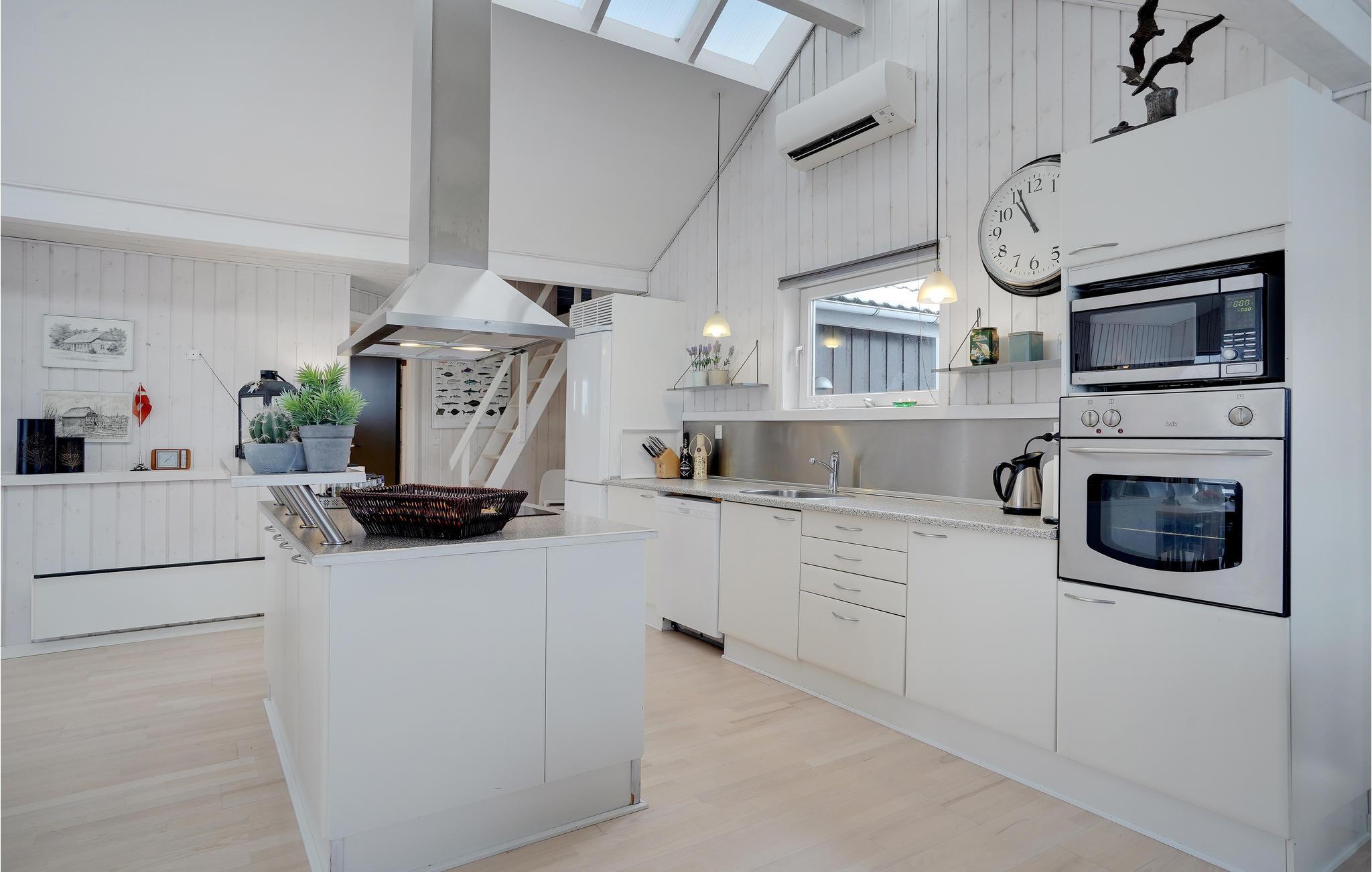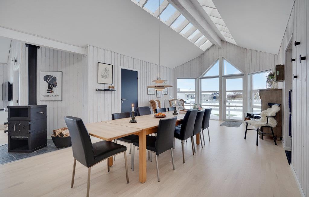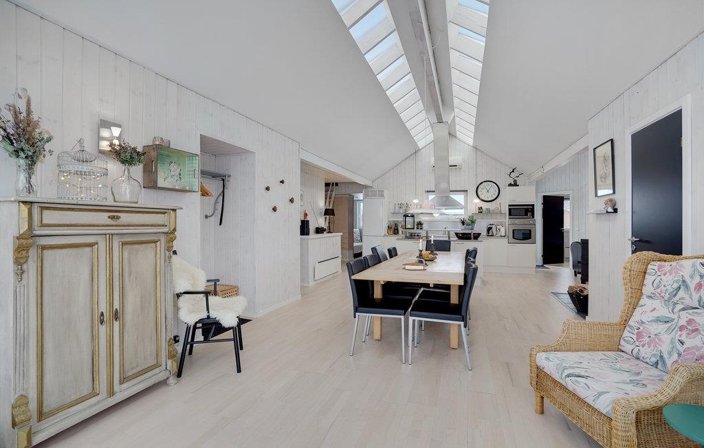 Oplev en afslappende ferie i dette dejligt beliggende hus, hvorfra I nemt kan gå til stranden. Slap af efter dagens aktiviteter i opholdsstuen, som med sit lyse og smagfulde interiør indbyder til hyggelige stunder. Spis jeres måltider med udsigt til haven gennem de store gulv-til-loft-vinduer, og hyg jer sammen i sofaerne foran den knitrende brændeovn efter en afslappende tur i saunaen.