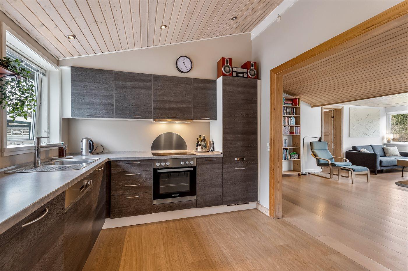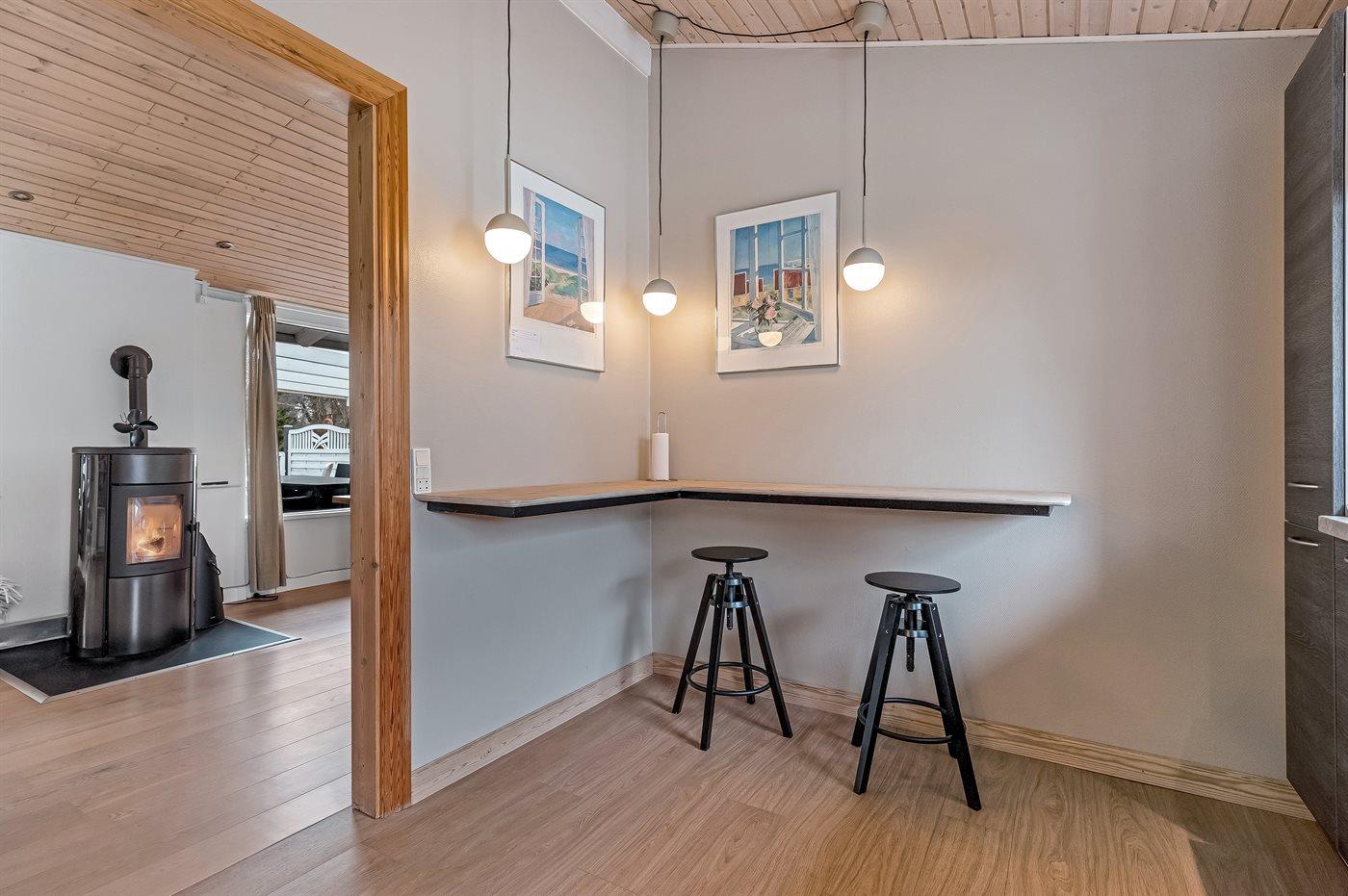 Køkkenet er udstyret med 1 køleskab. Der er 4 keramiske kogeplader, varmluftovn, mikrobølgeovn samt opvaskemaskine.