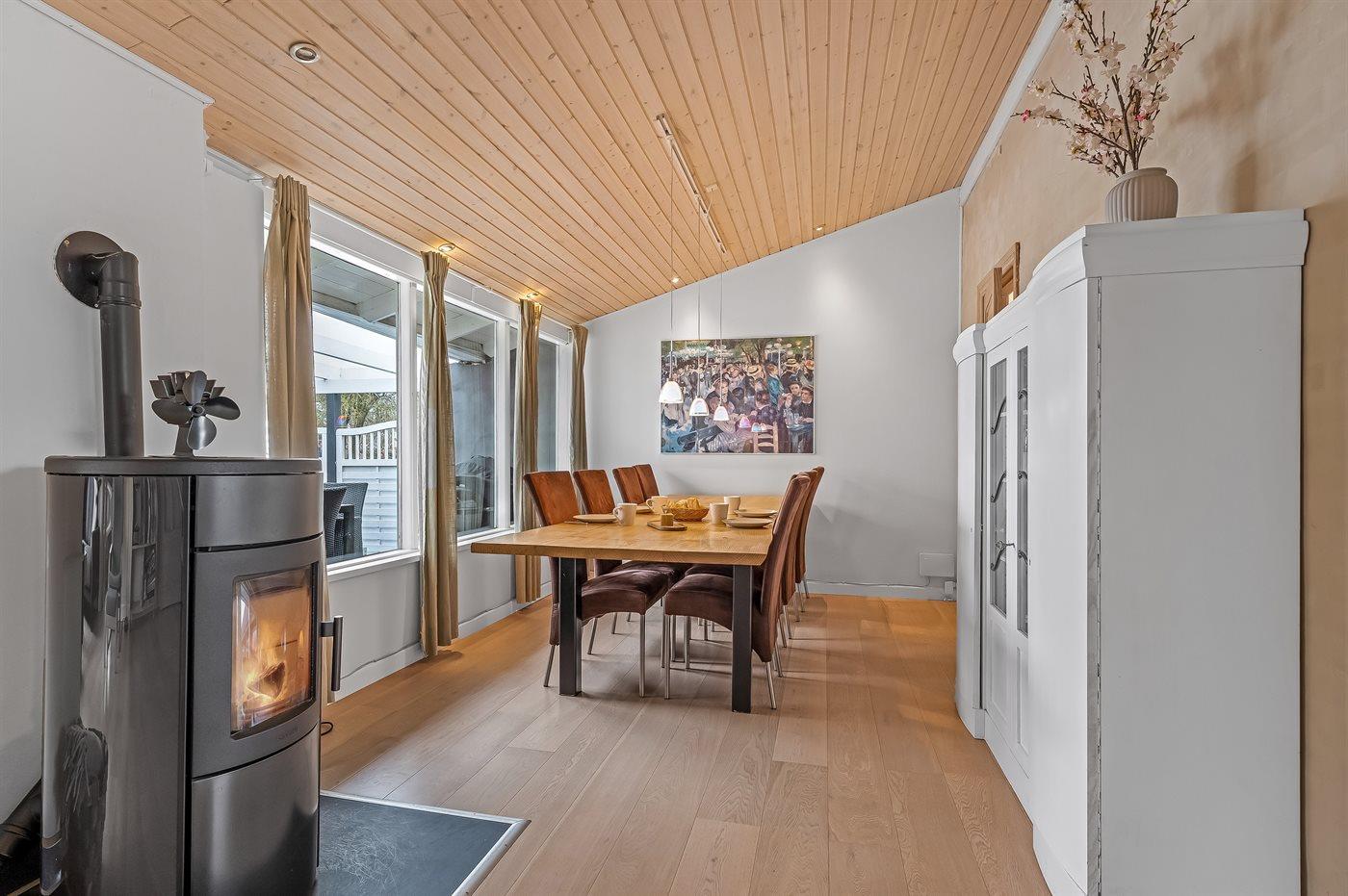 Huset indeholder blandt andet et stort åbent køkken, en stor stue med spisehjørne samt tre gode soveværelser, alle med dobbeltseng (der er ikke klædeskabe i soveværelserne). Fra stuen er udgang til den overdækkede terrasse, hvor aftensmaden kan tilberedes på grillen. I haven er der masser af plads til boldspil og leg.
