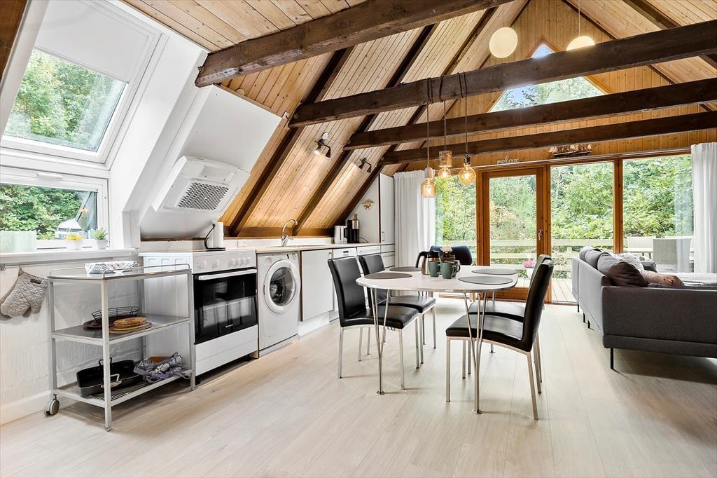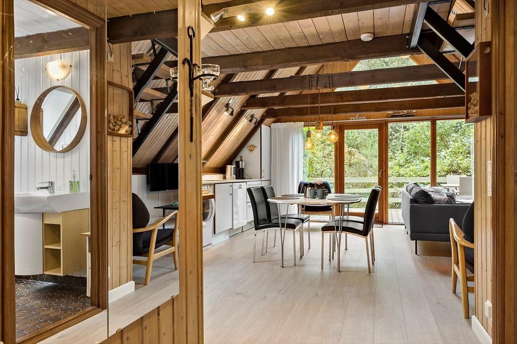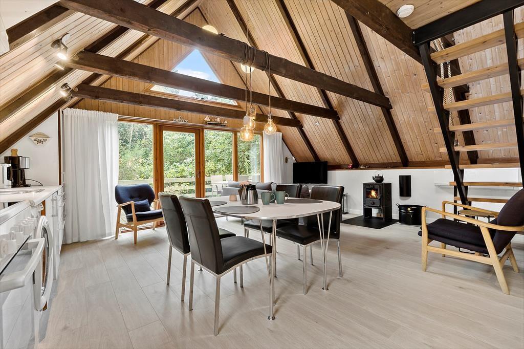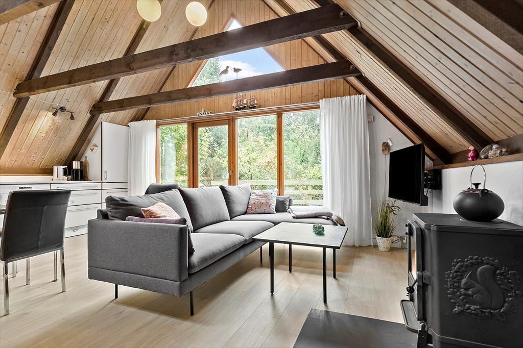 Huset ligger i dejligt område 1 km øst for smukke Ebeltoft. Du kan fint gå til byen og det er en smuk tur over den europæiske filmhøjskoles naturarealer til byen. Ebeltoft gamle købstad har så mange skønne seværdigheder, aktiviteter og spisesteder. På havnen kan du både spise lækker mad på restauranterne og købe fisk, vin og italienske specialiteter. Når du går langs promenaden fra havnen til byen, kan du, på vejen, nyde smuk glaskunst både hos de lokale glaspusterne og på Glasmuseet og besøge Fregatten Jylland. Nyd smukke Ebeltoft med brostensbelagte gader, dejlige butikker og restauranter samt det gamle rådhus, hvor giftefogeden har travlt med at vie folk fra nær og fjern. Og glem endelig ikke at besøge Maltfabrikken, hvor der altid sker noget spændende. Fra huset er der 2,5 til skønne badestrande og der er 14 km. til Naturnationalpark Mols Bjerge.