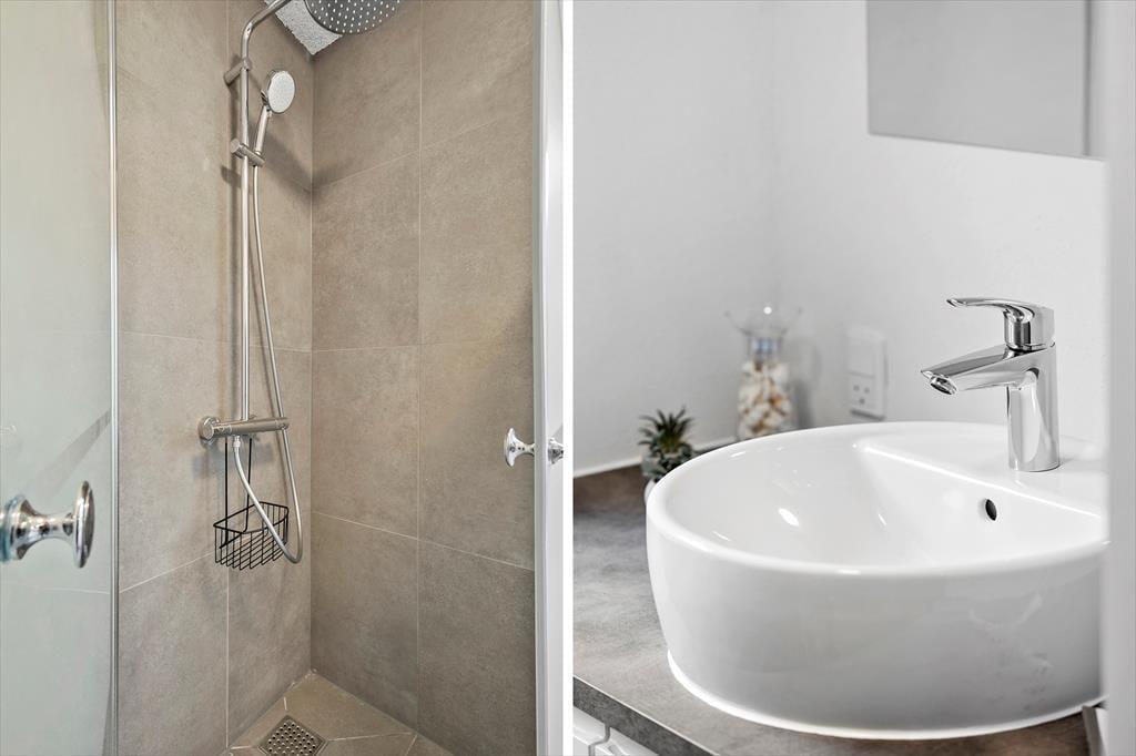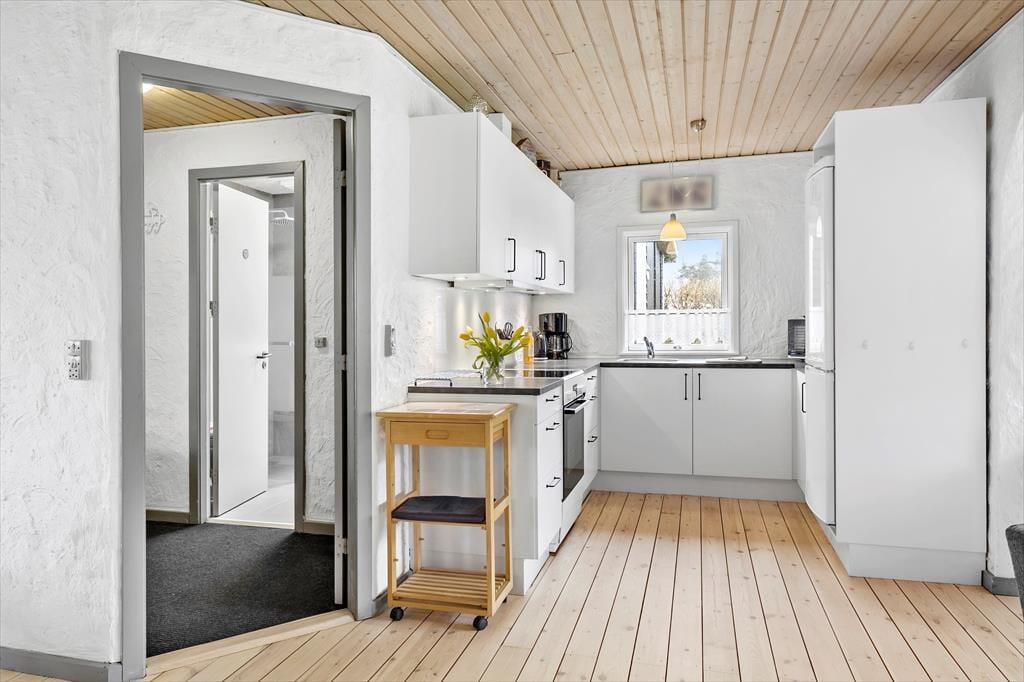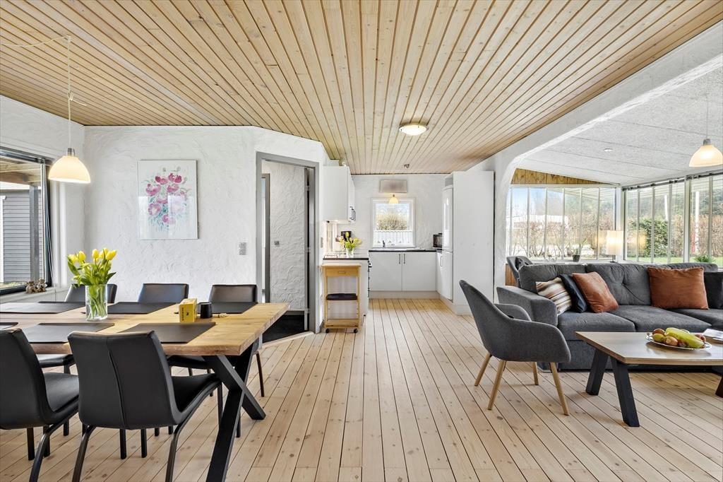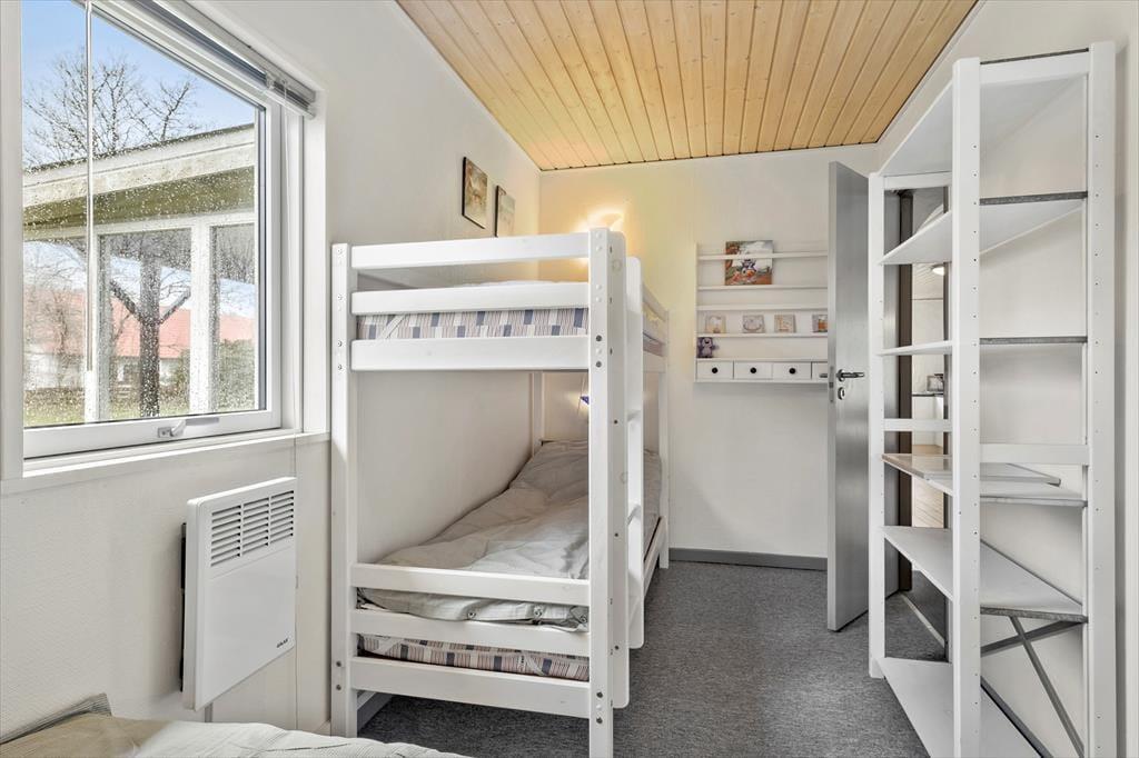 Sommerhusets 80 m2 er fornuftigt indrettet, så I nemt kan være seks personer. Planløsningen byder på to soveværelser, hvoraf det ene er udstyret med en dobbeltseng og det andet med to enkeltsenge og en køjeseng – og der er også mulighed for at rede op på sovesofaen i stuen. Udover en behagelig sofaafdeling er stuen indrettet med spisebord og brændeovn, og husets køkken er også en integreret del af opholdsrummet. Her er gennemstrømmende lysindfald og sågar fjordkig fra de nordøstvendte vinduer. Planløsningen rummer endelig også et badeværelse, og som en sidebemærkning skal det nævnes, at der er adgang til vaskemaskine og tørretumbler på campingpladsen.