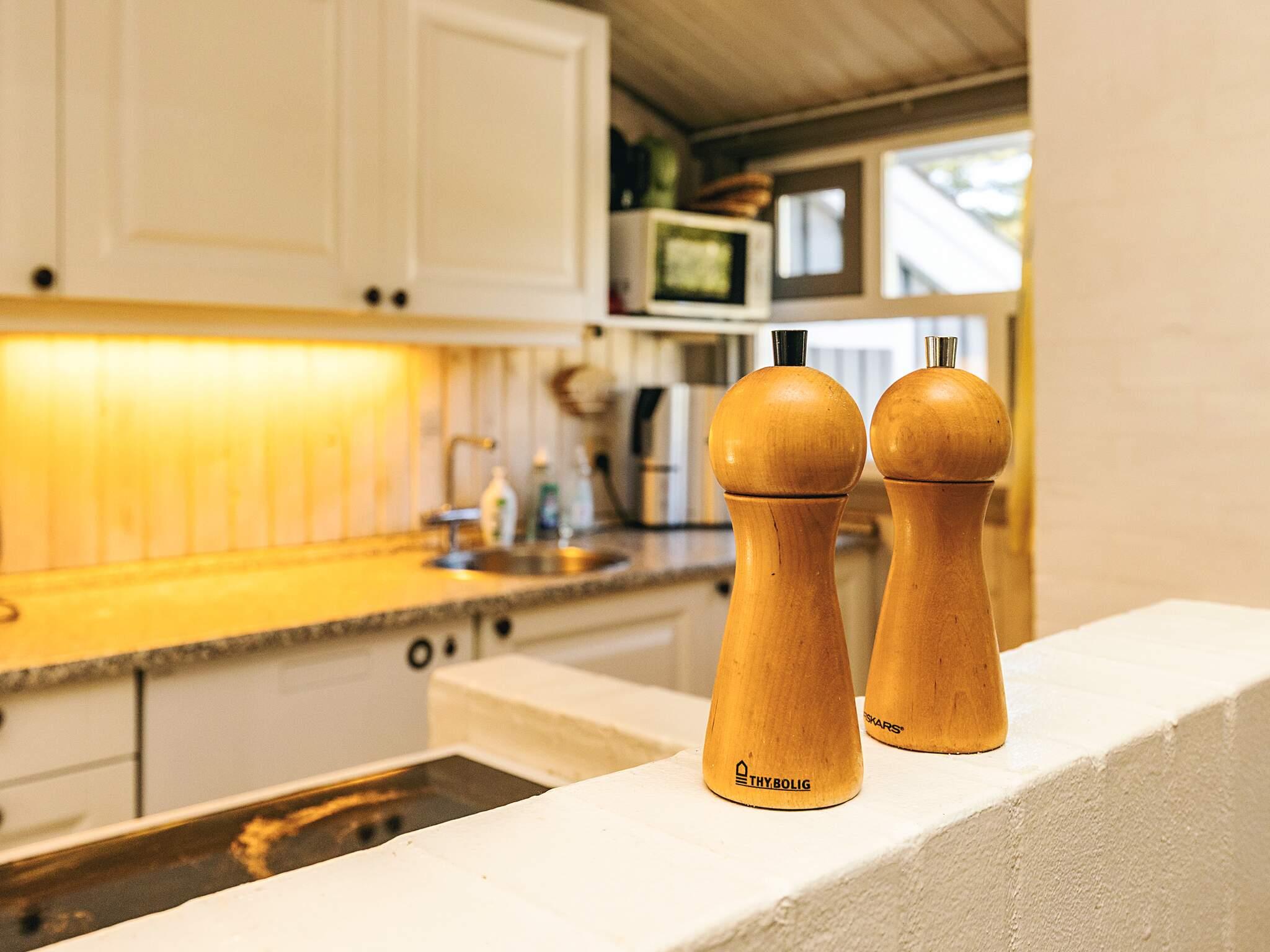 I den forsænkede opholdsstue er brændeovn, hvor I kan nyde de lidt kølige sommeraftener og slappe af med en god film. Spisestuen ligger i åben forbindelse med køkkenet, som er praktisk indrettet med alle tekniske hjælpemidler.