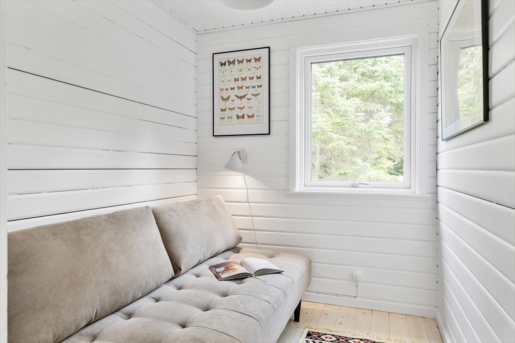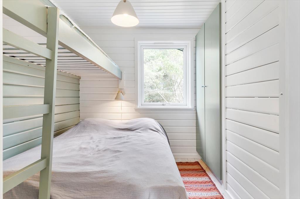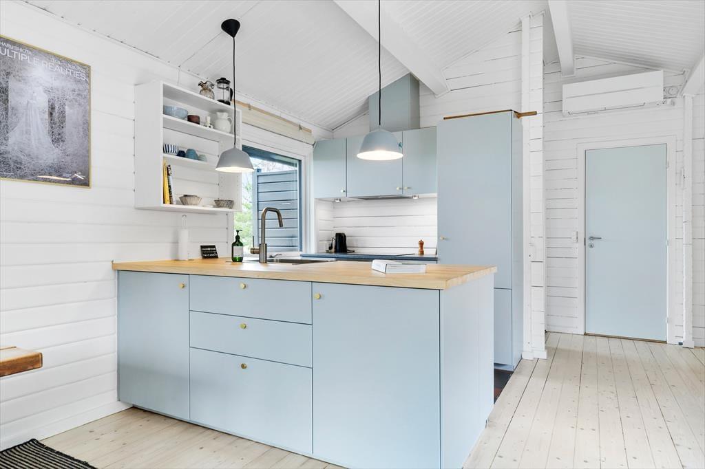 Træhuset, som måler 66 m2 og har plads til fem personer, er blevet renoveret i 2023 på vellykket vis. Der er masser af sommerhusstemning i den velindrettede stue, der har loft til kip, hvidmalede trævægge og et veludstyret, lyseblåt køkken. Fra spisekrogen har I et fint kig ud over åbne marker, når I drikker te og spiller brætspil, mens sofaen og lænestolene indbyder til langstrakte læsestunder og hygge med strikketøj og krydsogtværser. Der er tv med Chromecast, varmepumpe og brændeovn i rummet, mens husets sengepladser er fordelt på tre soveværelser. Fra entréen har I adgang til et pænt og praktisk badeværelse med bruseniche.