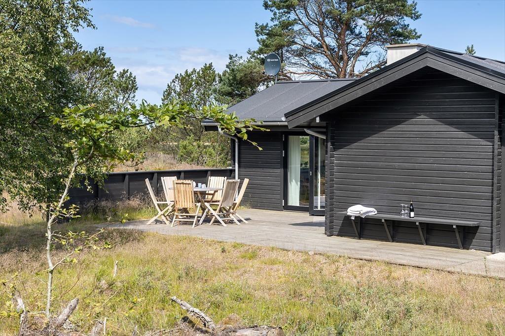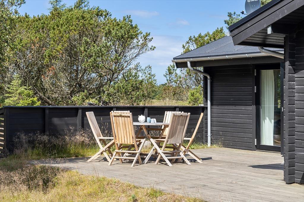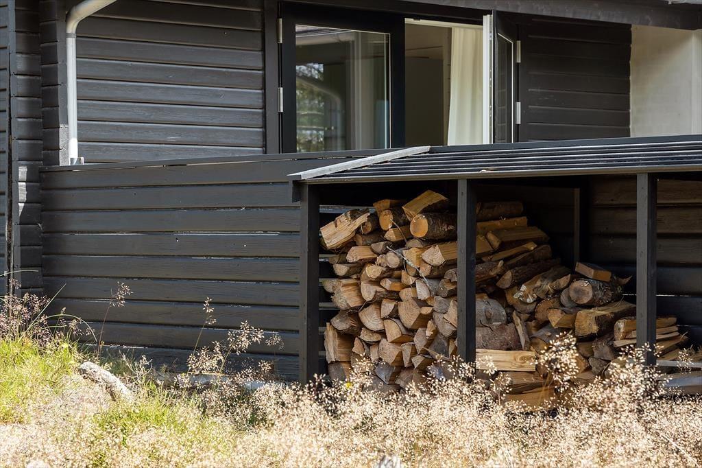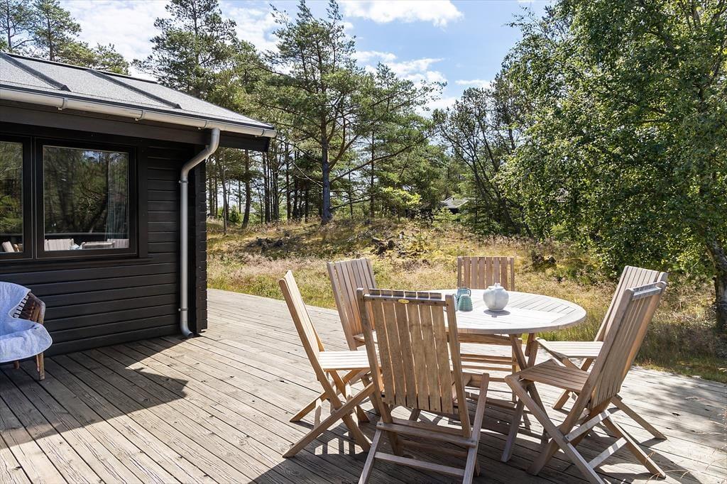 På en solrig og stille dag kan I lade stuens glasdør stå åben, så I har fri adgang til terrassen. Den er sydvendt og delvist afskærmet, og der er gode havemøbler til rådighed, hvis I vil spise frokost i det fri, have en middagslur eller grille om aftenen. Naturgrunden er med sine 2500 m2 dejligt stor, og huset er placeret ideelt på grunden, så det ligger omkranset af træer, men stadig med fri udsigt til et åbent naturareal.