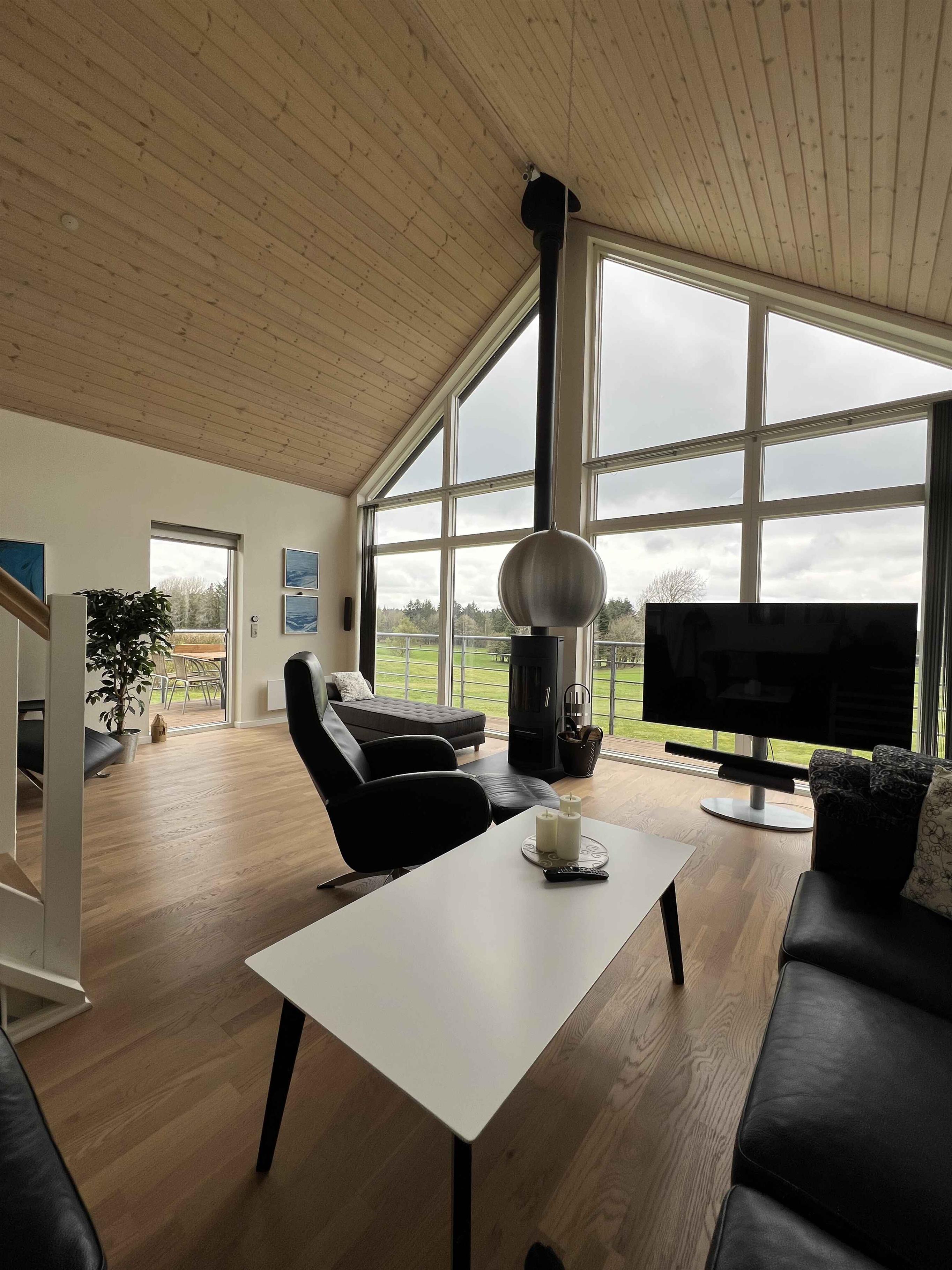 Flot sommerhus i fire plan med panoramavinduer og terrasse, tæt på golf og naturskønne omgivelser i Skjern.