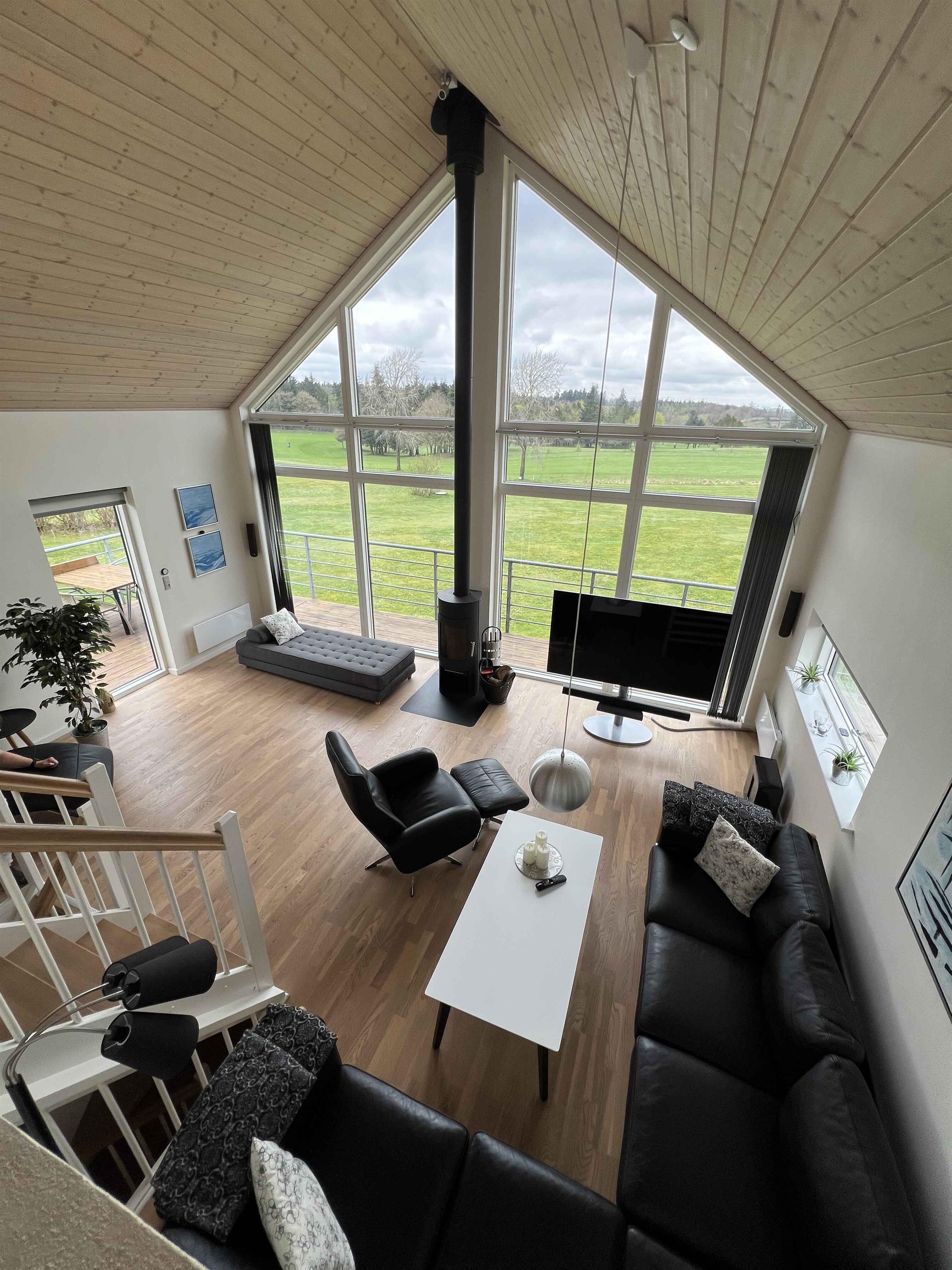 Spændende sommerhus i 4 forskudte plan med fantastisk udsigt, tæt på smuk, fredfyldt natur og golf. Her kan du nyde udsigten fra huset eller fra de udendørs træterasser i forkellige niveauer, mens børnene leger i legetårn, gynger, eller spiller bold.