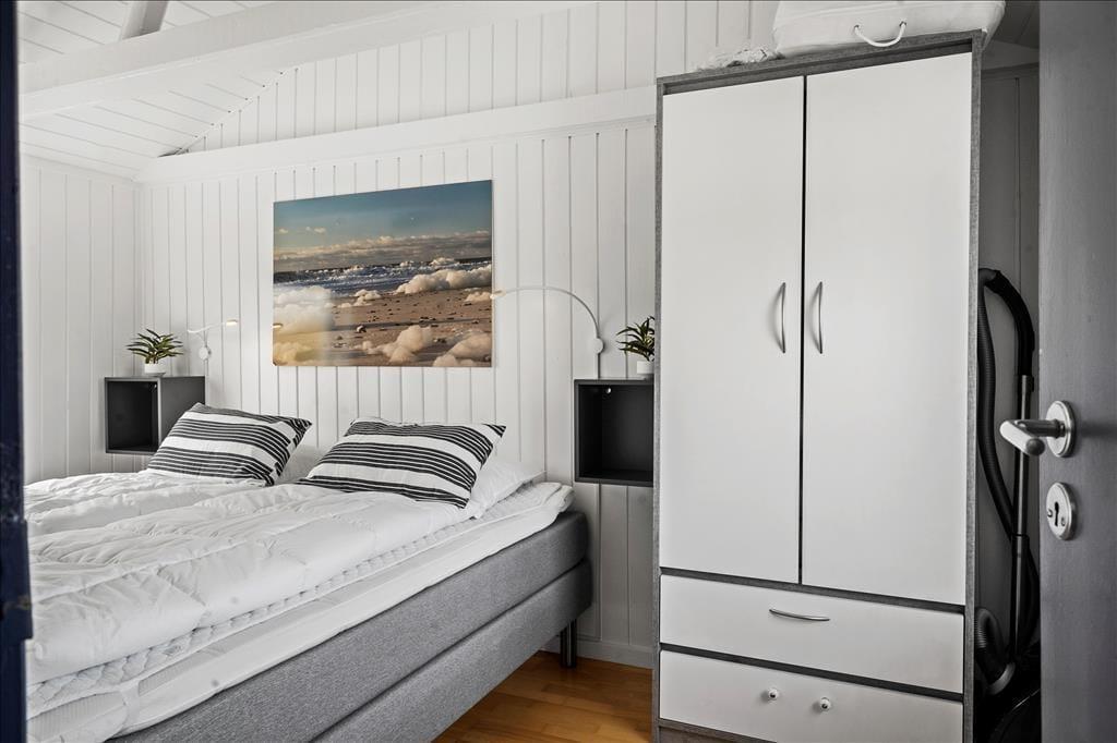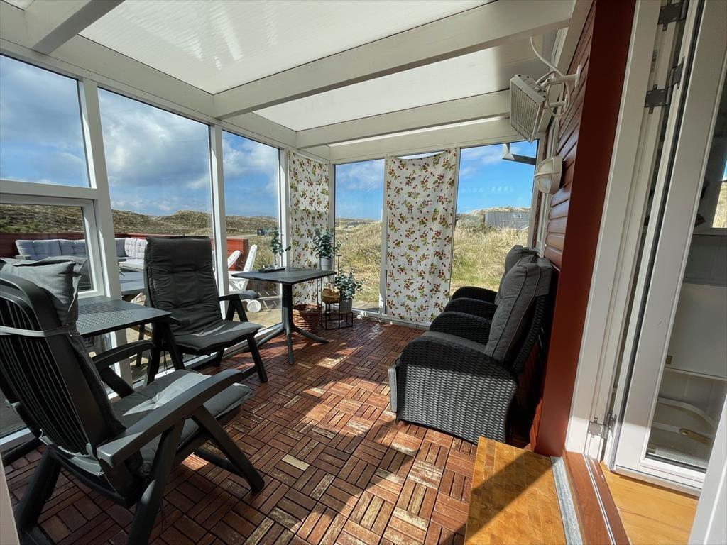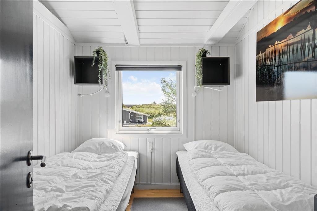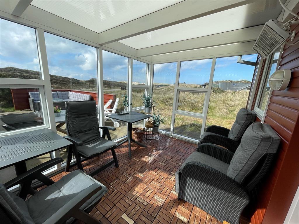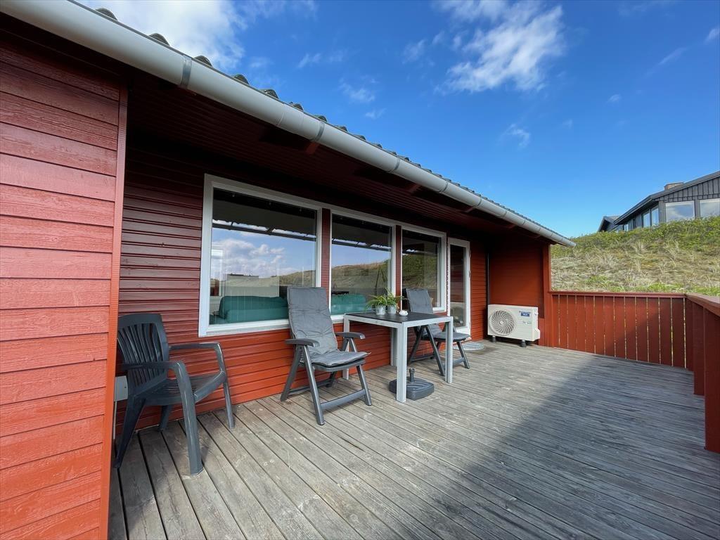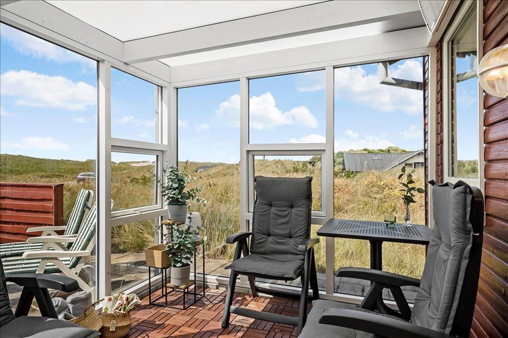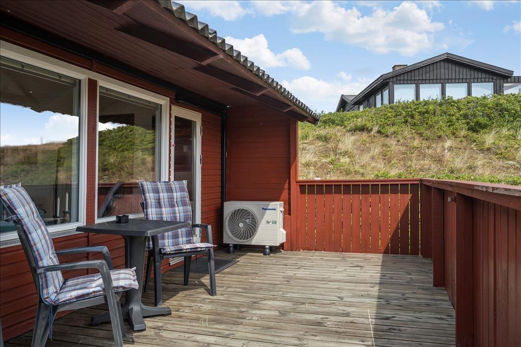 Det klassiske træhus byder på den helt rigtige, autentiske sommerhuscharme, som gennem generationer har dannet ramme om skønne feriedage og uforglemmelige ferieminder i sommerlandet. Vinkelhuset byder på en soveafdeling med to soveværelser og sengepladser til fire personer samt østvendte vinduer, så I kan lade jer vække af morgensolen. Denne del af huset byder også på et mindre men velindrettet badeværelse med bruseniche og gulvvarme. Køkkenet og stuen glider i ét, og det moderne køkken er godt udstyret til små såvel som store kulinariske udfoldelser, mens vaskemaskinen giver mulighed for tøjvask ferien igennem. Skrånende lofter med frilagte spær giver en luftig og charmerende atmosfære, og med både varmepumpe og brændeovn er her altid en behagelig temperatur. Stuen er indrettet med et spisebord samt et sofaarrangement, hvor der er tv, Apple-TV og parabol. Store vinduespartier giver en skøn udsigt til omgivelsernes smukke klitlandskab, og synet kan også nydes i den dejligt udestue, der har vinduespartier fra gulv til loft. Her er en terrassevarmer så selv på en kølig dag, kan I slappe af her og nyde udsigten med en kop kaffe.