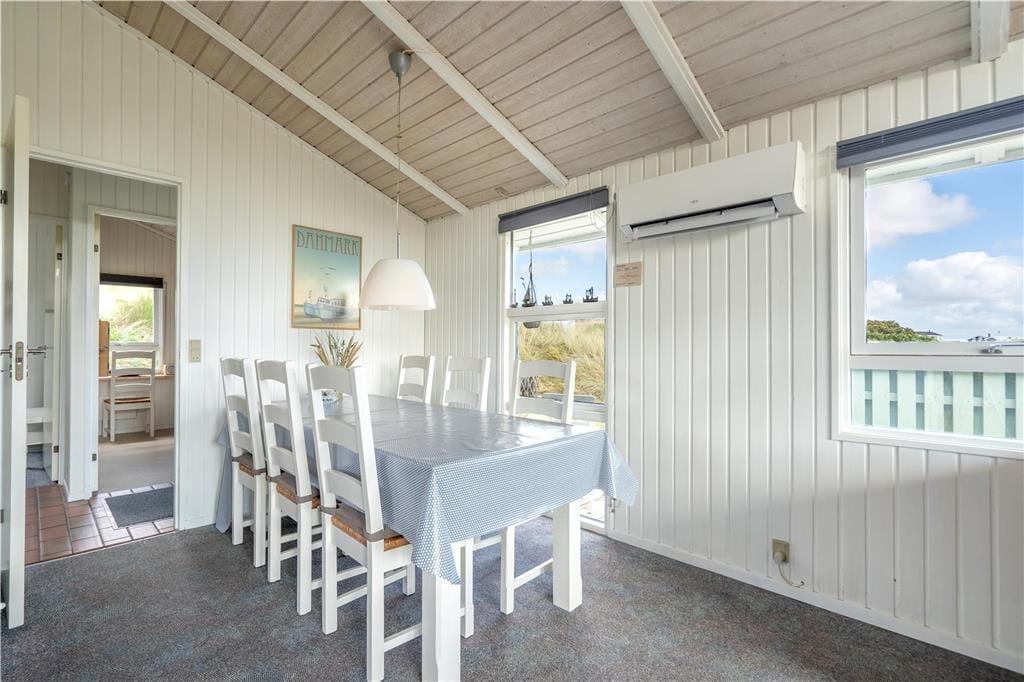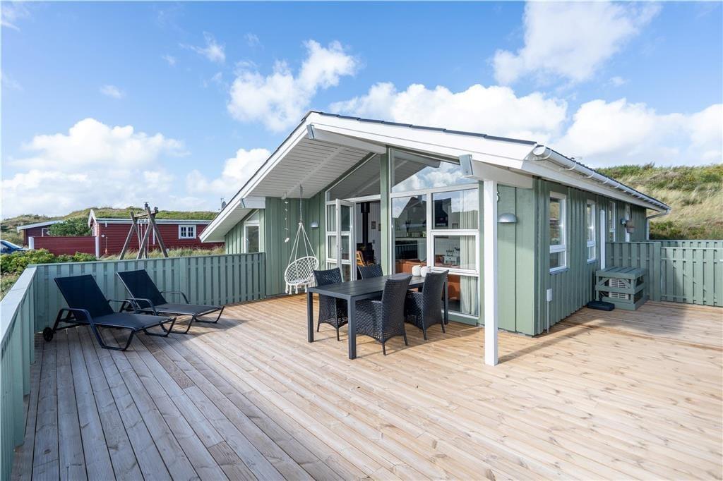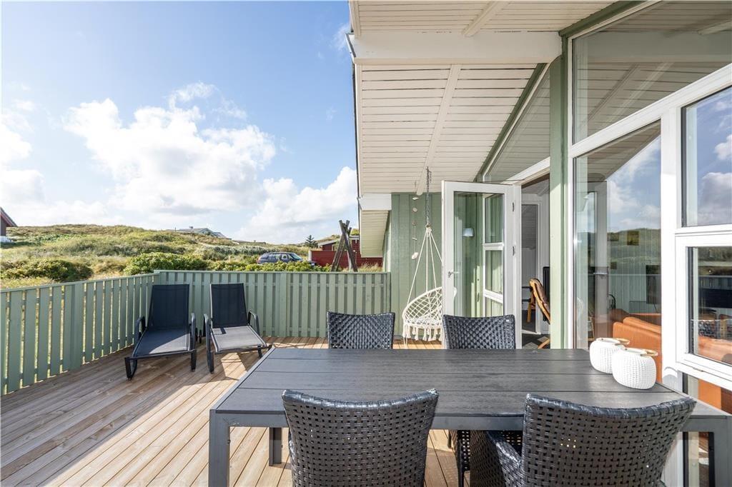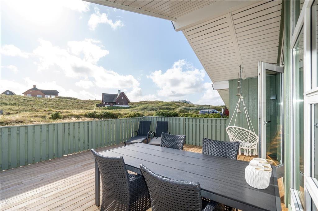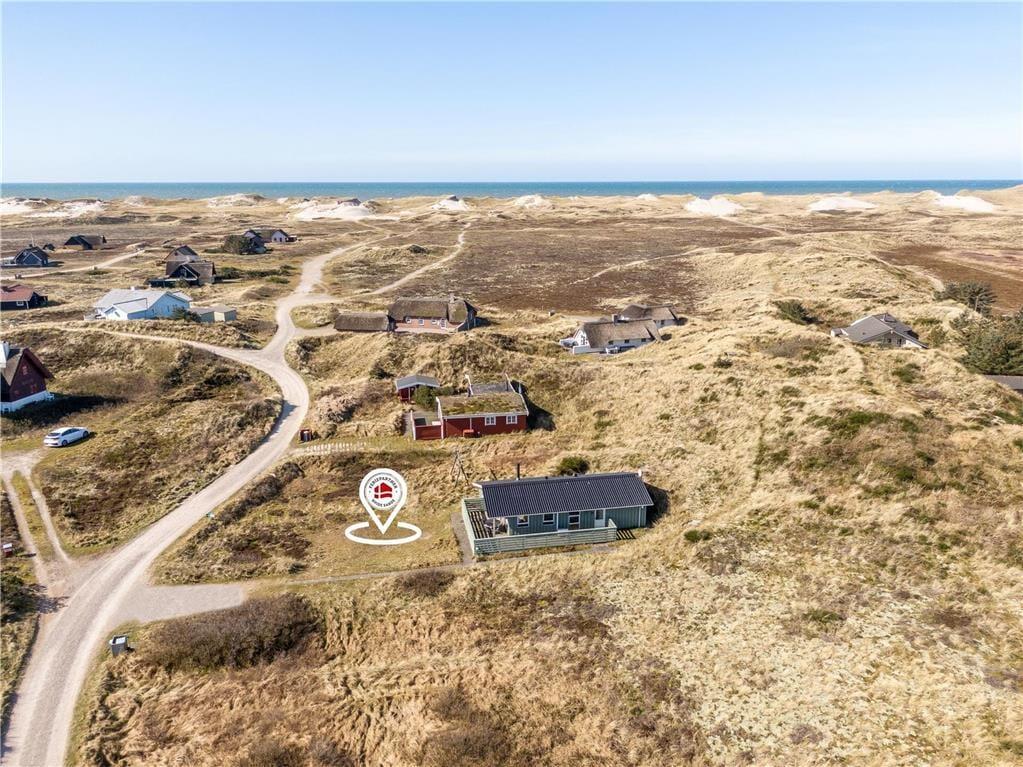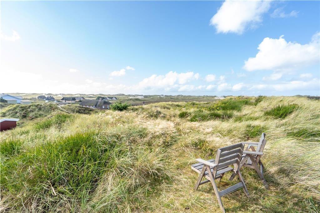 Omkring huset smyger sig hyggelige terrasser mod øst, syd og vest, og i løbet af dagen kan I flytte med solen rundt om huset og få det maksimale udbytte af sommerdagene. Her er god plads til at slappe af i solsengene og til at forkæle familien med lækkerier fra grillen. Huset ligger i læ fra en klit, og heroppe har I en skøn udsigt over Skodbjerges lyngklædte klitlandskab og fjordens vand. Naturgrunden byder også på et gyngestativ og en sandkasse til de yngste, og her er parkeringsplads til flere biler.
