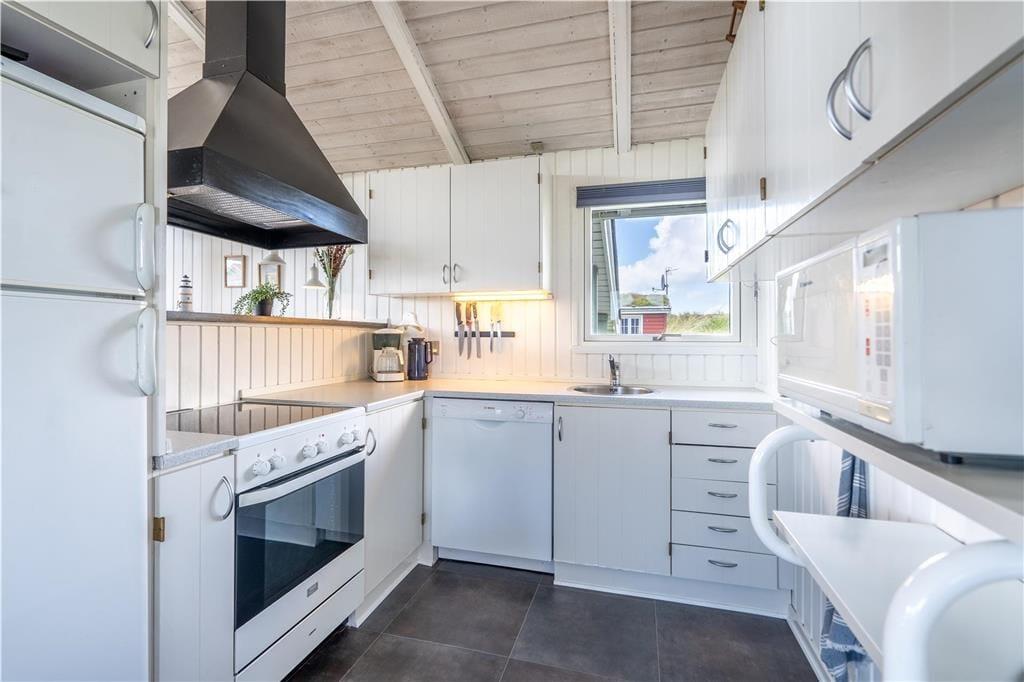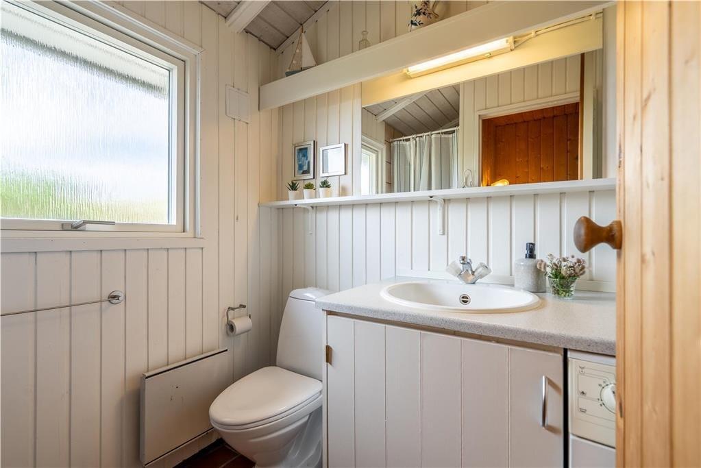 Feriehuset emmer af klassisk sommerhuscharme, og her får I en hyggelig ramme om feriedagene med masser af stemning og atmosfære. I stuen giver store vinduespartier et skønt lysindfald og udsigt til de naturskønne omgivelser, og sofaarrangementet er det ideelle sted at nyde en kop te sammen med en god bog eller en film, mens ilden knitrer i brændeovnen. Køkkenet er funktionelt indrettet og byder på alt ønskeligt udstyr, og maden serveres let ved spisebordet, hvor varmepumpen sørger for en behagelig temperatur. Badeværelset er indrettet med bruseniche og sauna, og som en praktisk detalje er her også vaskemaskine. Ferieboligen rummer tre gode værelser, som tilsammen giver sengepladser til seks personer.
