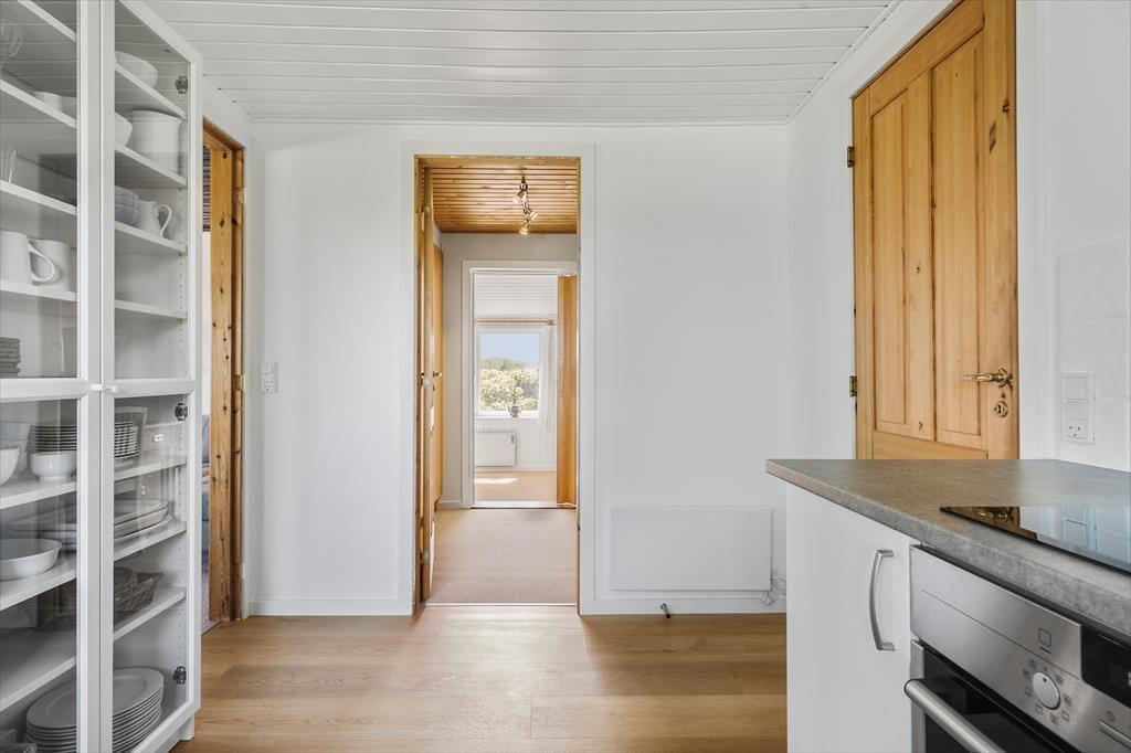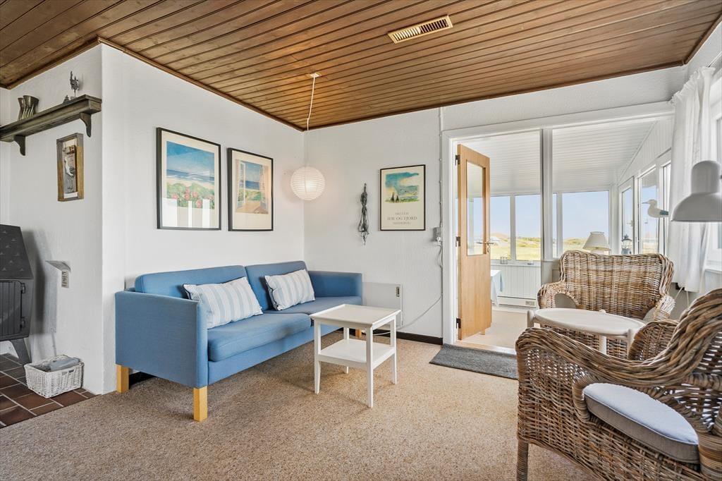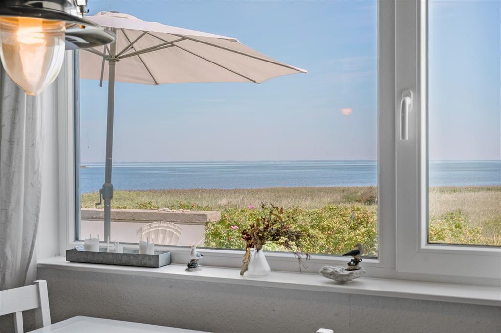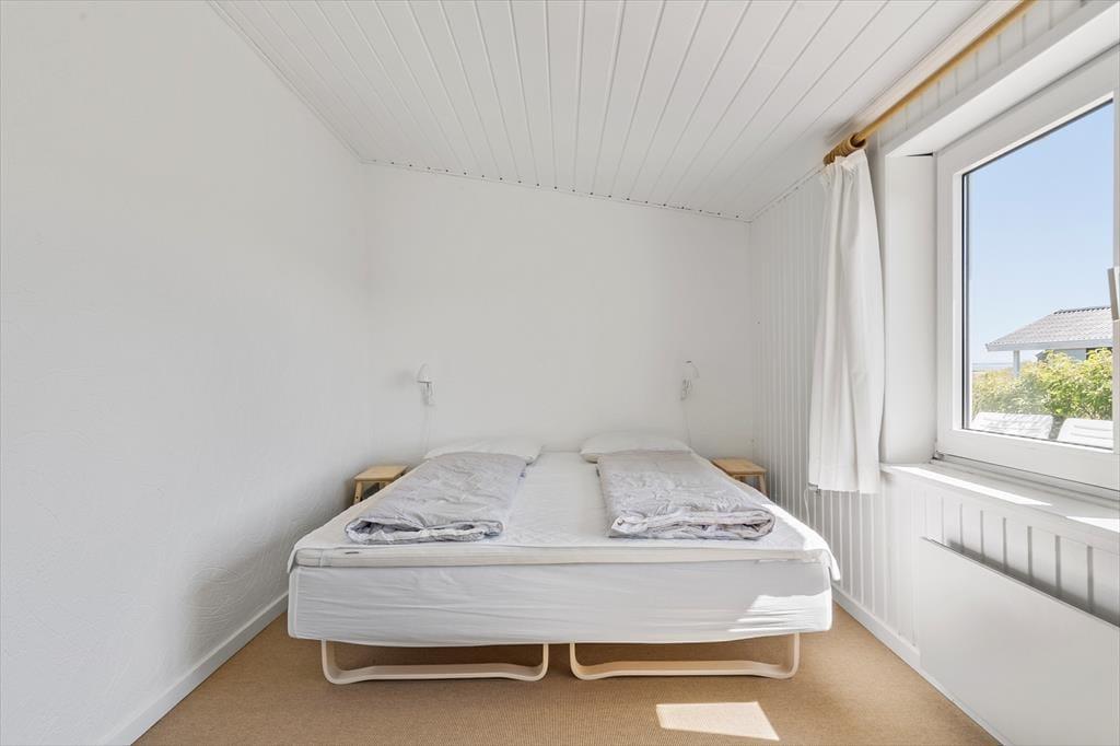 Feriehuset byder på store, lyse rum, hvorfra I får fuldt udbytte af den gode beliggenhed og udsigten. Mod øst findes en stor stue med vinduer ud mod fjorden, og mod nordøst har I en skøn udestue med et spisebord samt vinduespartier fra gulv til loft, hvor I kan nyde udsigten til fjorden og den lille vig nedenfor. Mod vest findes yderligere en udestue, hvorfra I kan lade jer betage af solnedgangen. Ferieboligen byder på tre værelser, som tilsammen giver sengepladser til seks personer. Her er separat toilet samt et badeværelse med bruseniche. Køkkenet er veludstyret og har god plads til, at I kan være sammen om at lave mad, og retterne serveres let i stuen, der er indrettet med brændeovn, et spisebord og et sofaarrangement med tv.