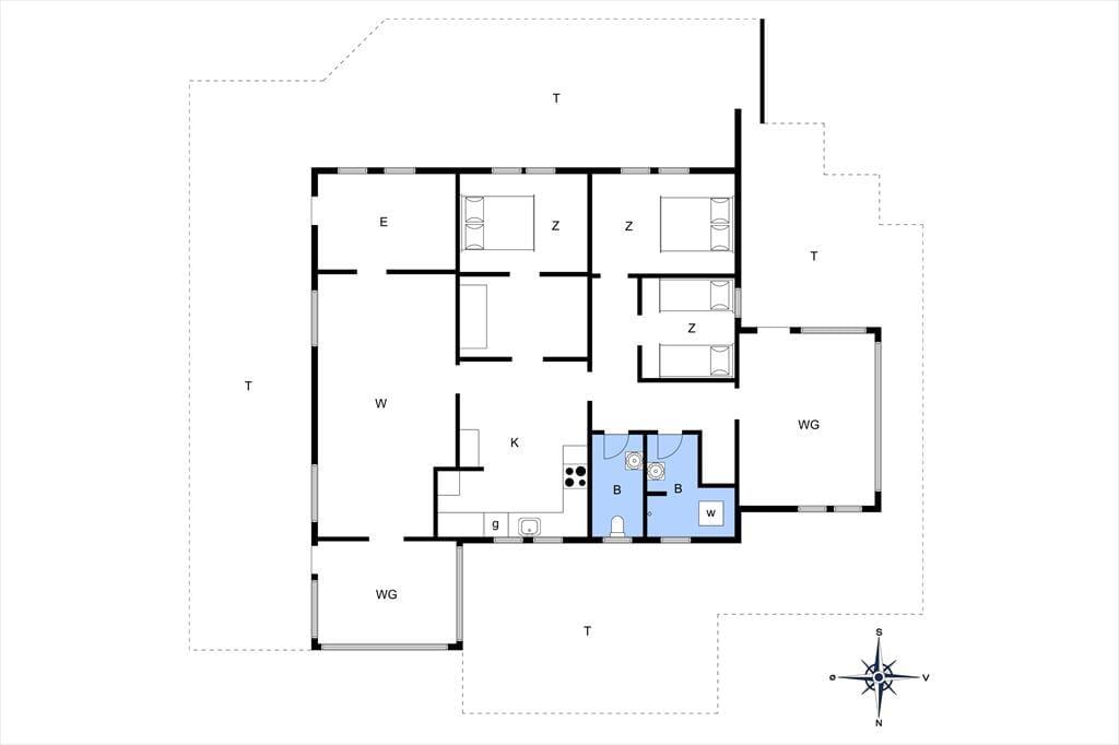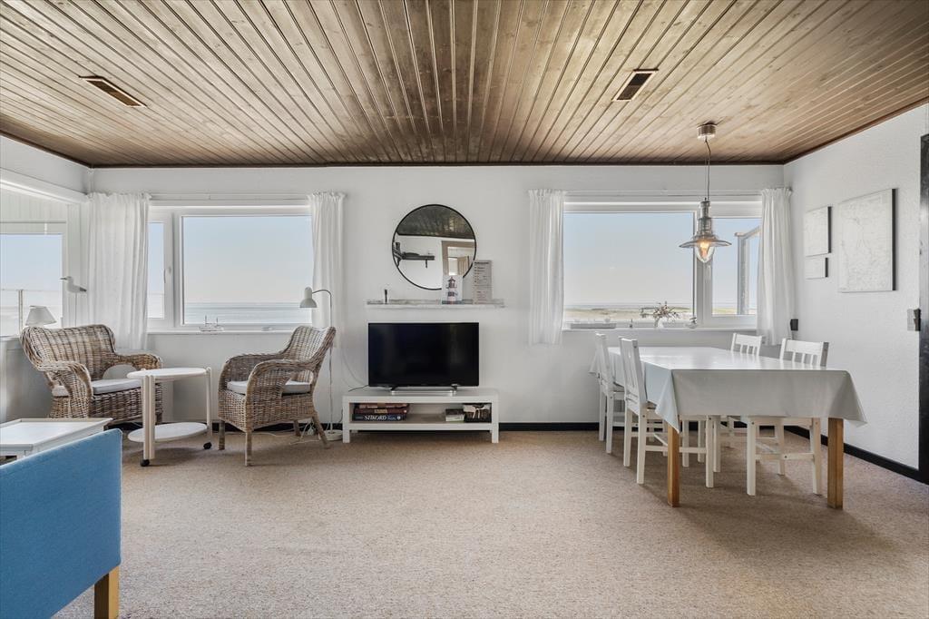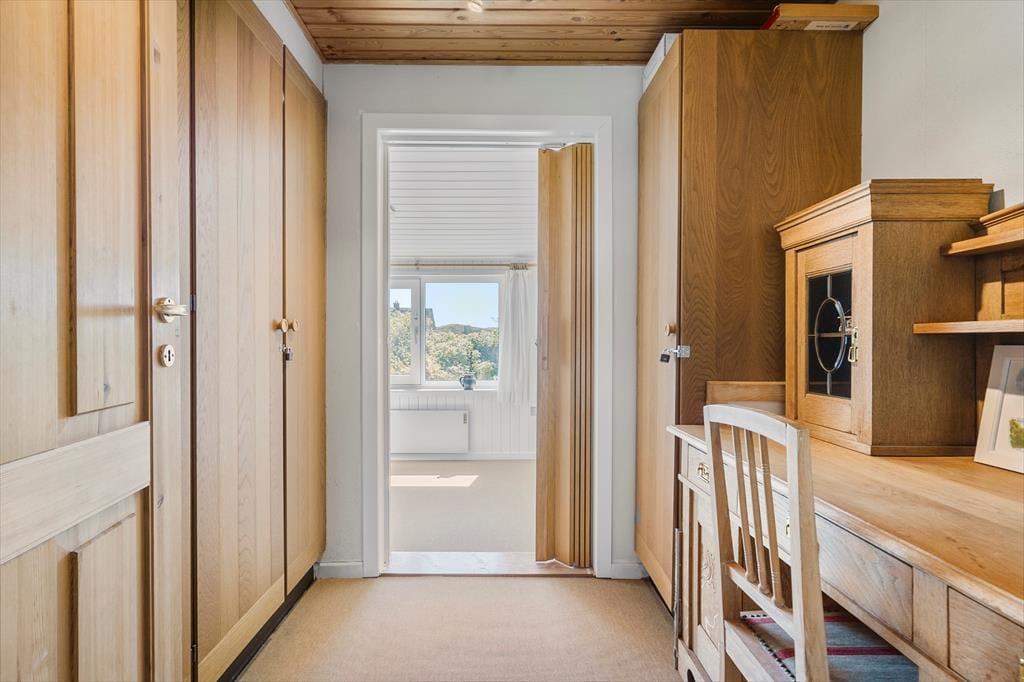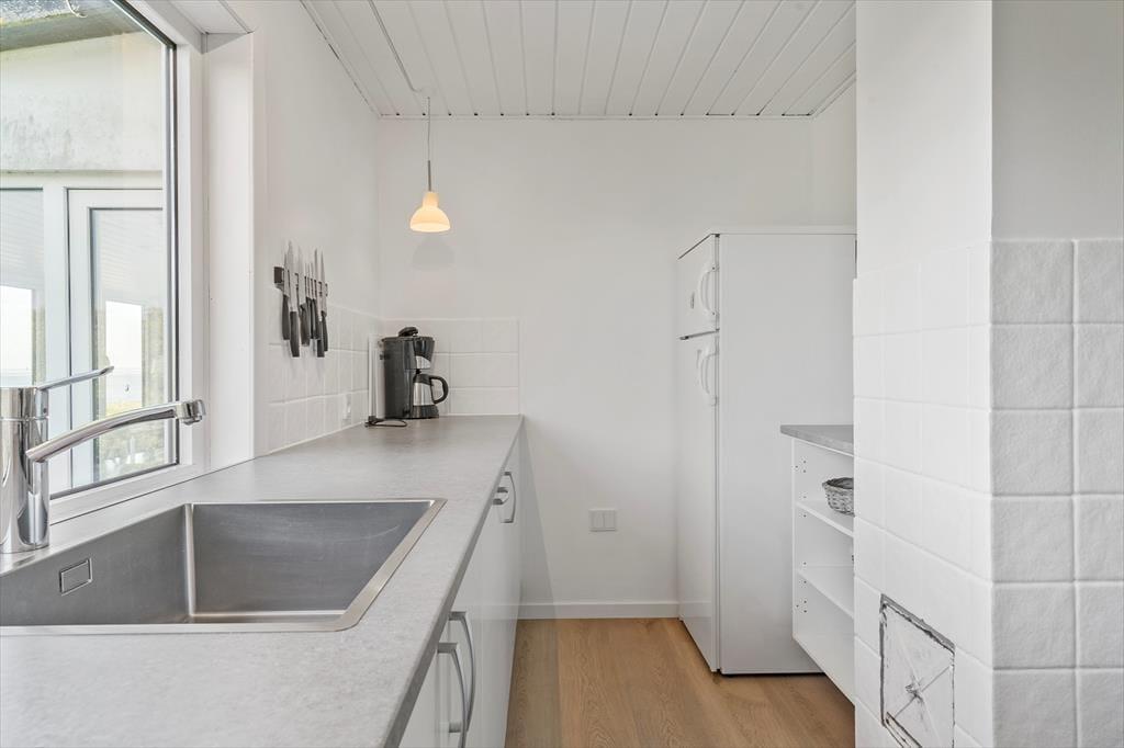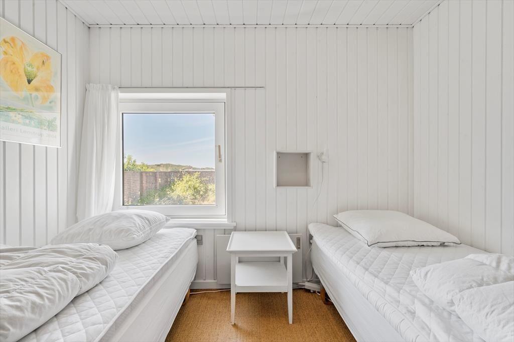 Feriehuset byder på store, lyse rum, hvorfra I får fuldt udbytte af den gode beliggenhed og udsigten. Mod øst findes en stor stue med vinduer ud mod fjorden, og mod nordøst har I en skøn udestue med et spisebord samt vinduespartier fra gulv til loft, hvor I kan nyde udsigten til fjorden og den lille vig nedenfor. Mod vest findes yderligere en udestue, hvorfra I kan lade jer betage af solnedgangen. Ferieboligen byder på tre værelser, som tilsammen giver sengepladser til seks personer. Her er separat toilet samt et badeværelse med bruseniche. Køkkenet er veludstyret og har god plads til, at I kan være sammen om at lave mad, og retterne serveres let i stuen, der er indrettet med brændeovn, et spisebord og et sofaarrangement med tv.