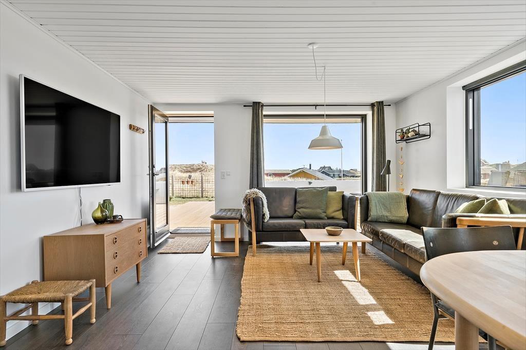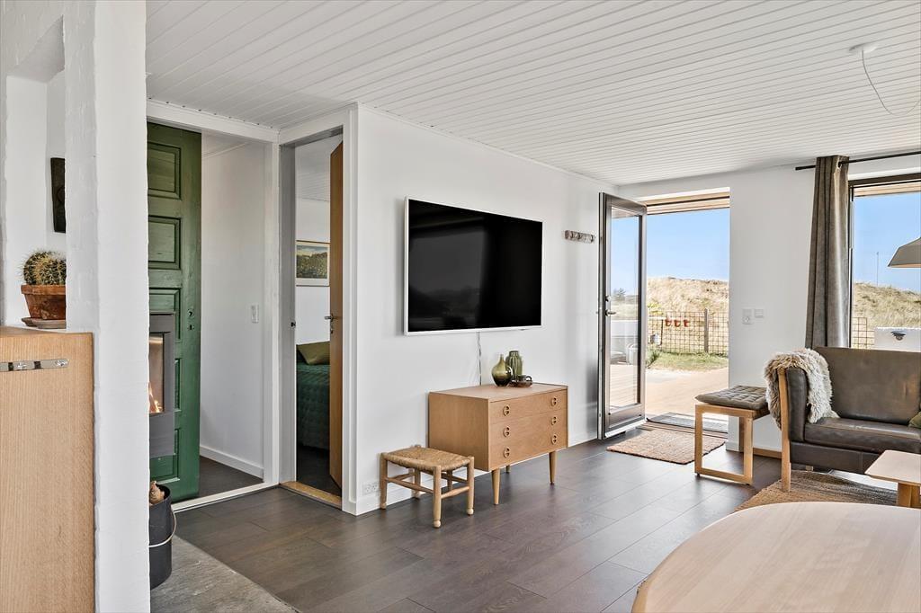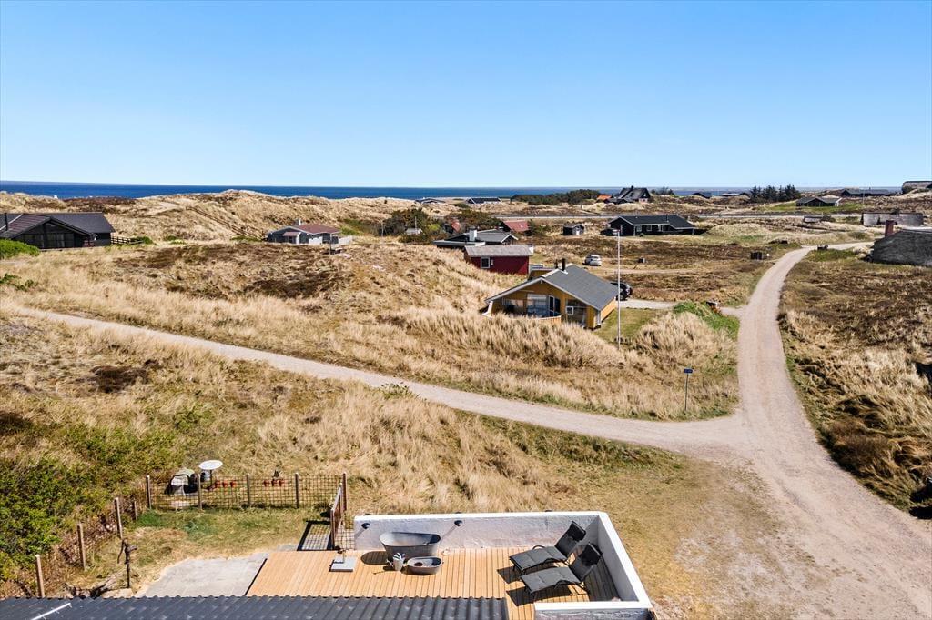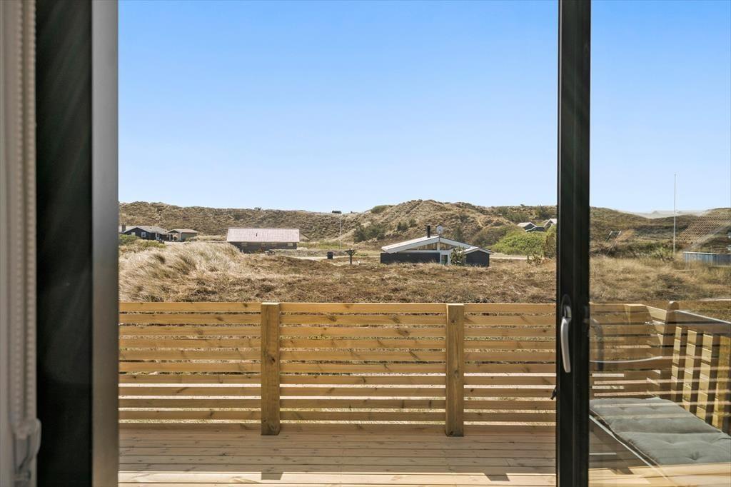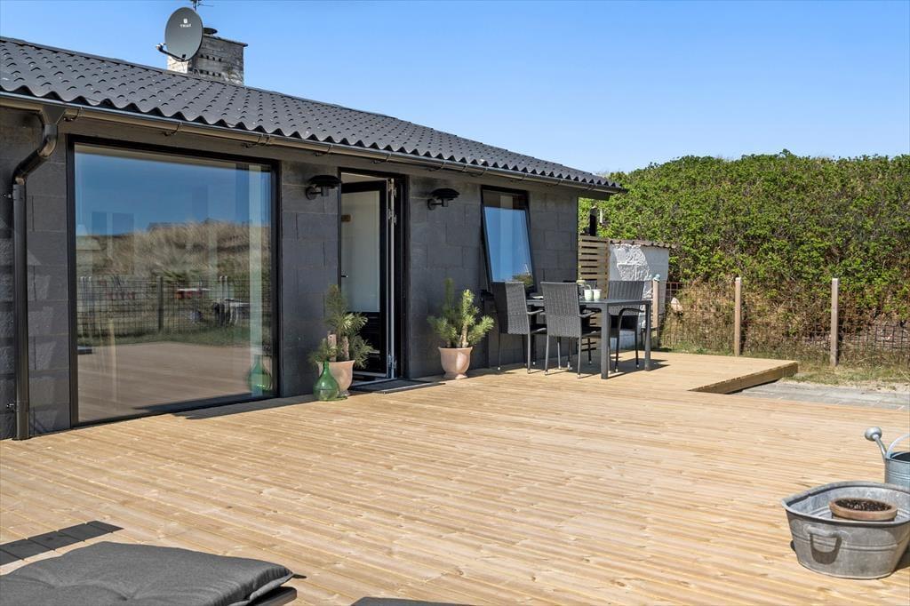 Det store terrassemiljø strækker sig omkring huset mod øst og syd, og her kan I slappe af i drømmesengene under solen fra morgen til aften. Her er en skøn udsigt til det bakkede klitlandskab, og morgenkaffen, frokosten, grillaftenen og alle forfriskningerne ind imellem kan I nyde i solens varme skær. Terrassen er tilmed indhegnet, så I kan lade hunden gå frit. Under terrassen har I en praktisk garage med plads til opbevaring af cykler, fiskestænger eller surfgrejet.