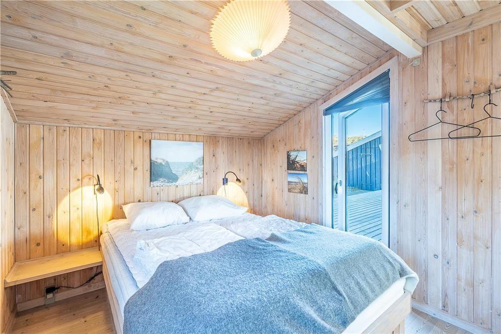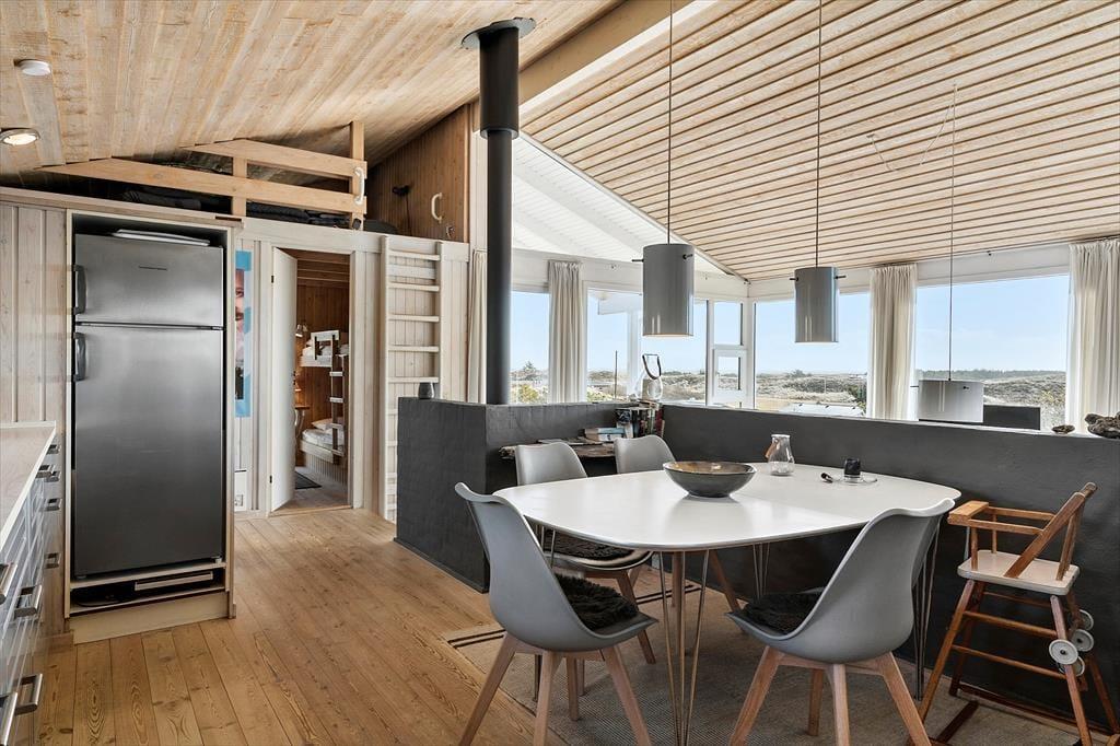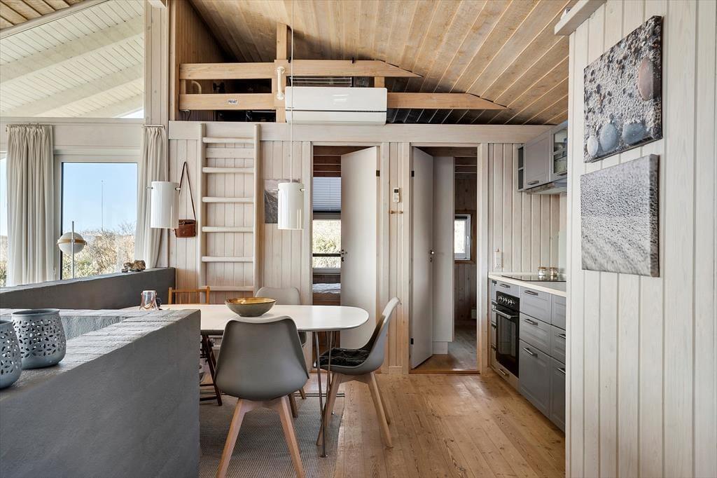 Feriehuset er lyst og indbydende, og i entréen er der god plads til sommersandaler eller efterårets støvler og vindjakker. Med tre soveværelser er her sengepladser til seks personer, og badeværelset er indrettet med vaskemaskine, bruseniche og sauna. I opholdsafdelingen ligger køkken-alrummet og stuen i åben forbindelse, men med forskudte niveauer, og varmepumpen og brændeovnen sørger for en behagelig temperatur. Køkkenet er velindrettet og veludstyret, og retterne serveres let ved spisebordet. Loft til kip samt store vinduespartier giver en luftig atmosfære, og i stuen kan I se film på fladskærmen eller bare nyde den pragtfulde udsigt gennem de store vinduespartier fra gulv til loft. Desuden er her to hemse, hvor familiens yngste kan kravle op for at læse eller surfe på nettet.