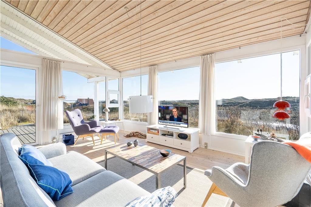 Dette lyse, velindrettede fritidshus ligger omgivet af smuk natur, og her kan feriedagene bruges med udsigt til Ringkøbing Fjord og den uspolerede klithede i Skodbjerge.