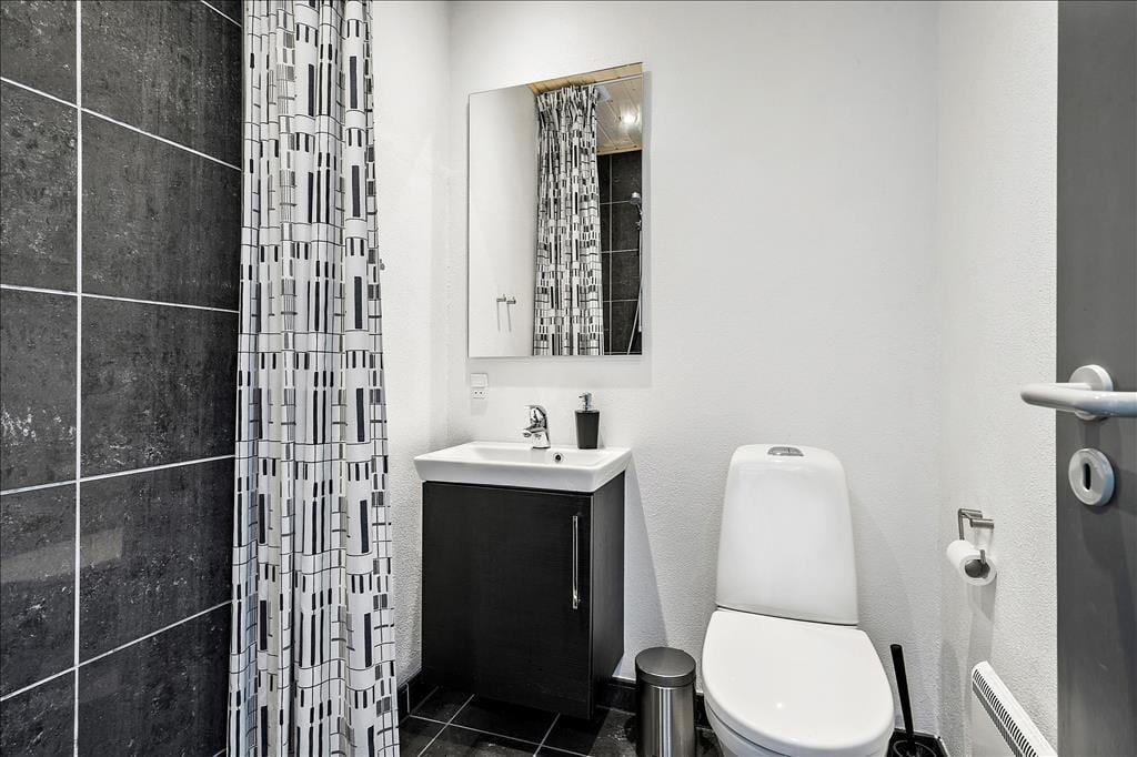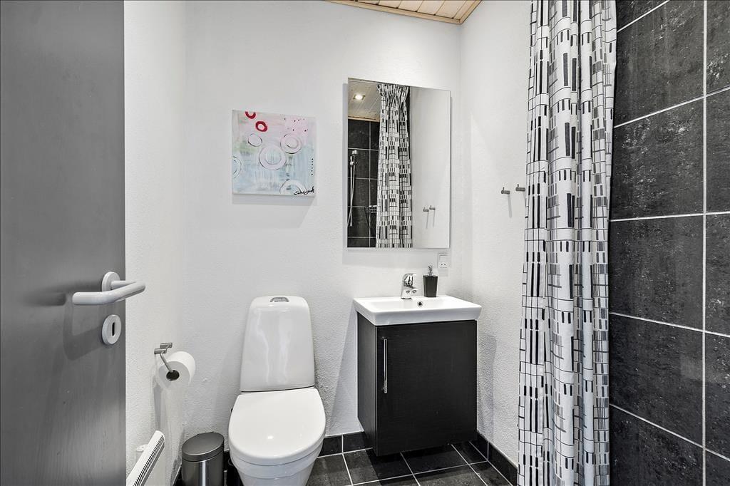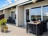 Ikke bare fra opholdsafdelingen, men også fra de to soveværelser har I direkte adgang til lejlighedens sydøstvendte terrassemiljø med den mest fantastiske fjordudsigt. Afskærmningen til siderne sørger for læ, og en markise kan tages i brug, hvis I får brug for skygge på de varme sommerdage. Mod nordvest har I også en dejlig opholdsplads i form af en stor terrasse med havemøbler, parasol og aftensol.