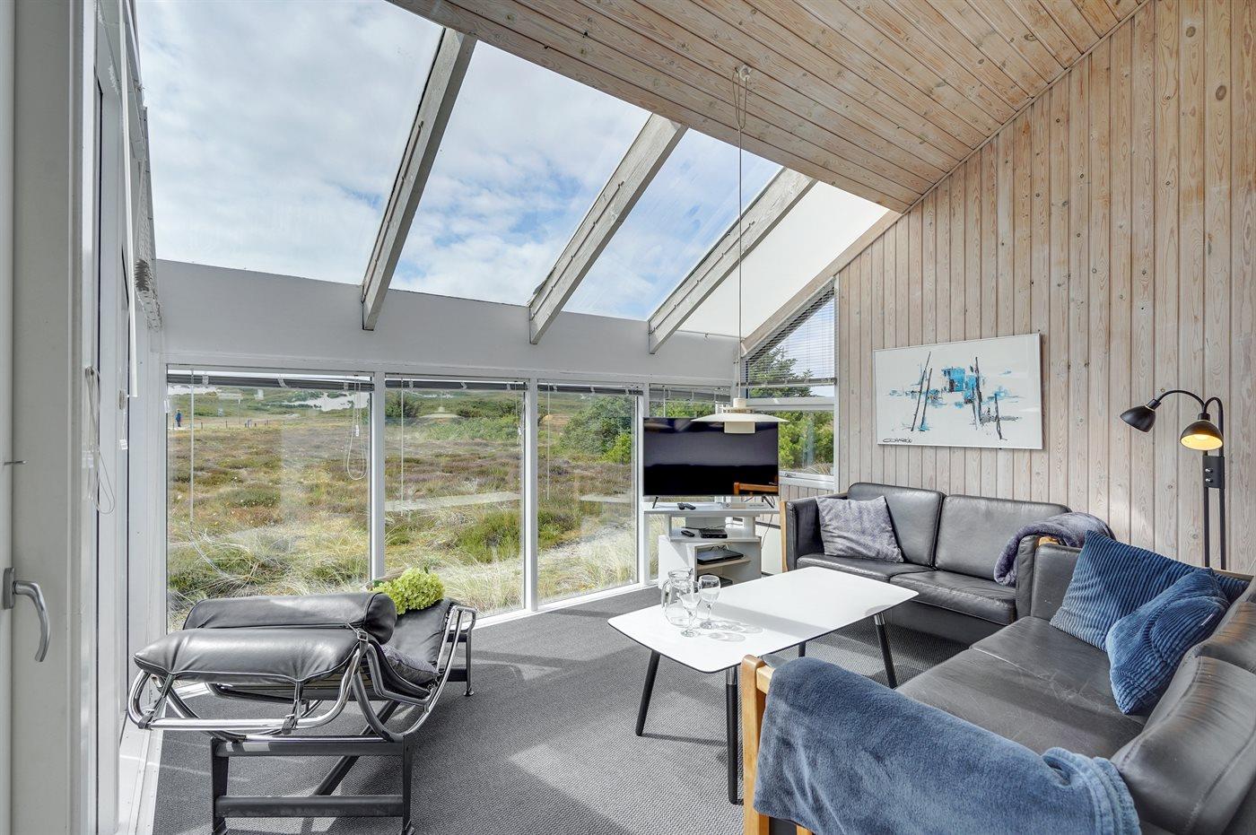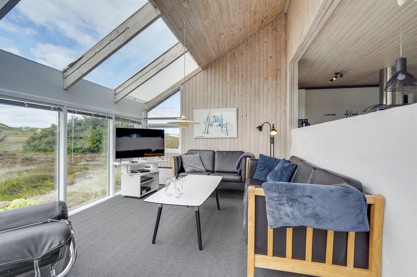 Dette dejlige sommerhus i træ ligger i første klitrække på en stor naturgrund med en fantastisk udsigt over det flotte klitområde. Huset bliver løbende vedligeholdt og 2012 blev huset udstyret med et nyt køkken. Til opvarmningen af huset er der installeret en energibesparende varmepumpe, der også fungerer som aircondition. Huset ligger på en stor naturgrund med en fantastisk udsigt over fredet område. 3 terrasser samt carport, sandkasse og gynge på grunden. Trælofter, -gulve og -vægge. Gulvtæpper i værelserne. Den hyggeligt indrettede stue i forskudt plan indeholder brændeovn, CD-afspiller og TV med parabol (TDC Home Trio med et udvalg af danske og internationale programmer) samt integreret DVD-afspiller. Husets sovepladser fordeler sig på 1 værelse med dobbeltseng, 1 værelse med 2 enkeltsenge og 1 værelse med køjeseng. Desuden alkove med 2 sovepladser i opholdsstuen. Gratis, trådløs internetforbindelse (computer medbringes). Køkkenet er udstyret med fryser, mikrobølgeovn og opvaskemaskine. Godt badeværelse med gulvvarme, vaskemaskine og tørretumbler. Sauna. Spa-afdeling med bruseniche, gulvvarme og 2-pers. spa. Endvidere barneseng og høj barnestol til rådighed. Et dejligt sommerhus i rolige omgivelser.