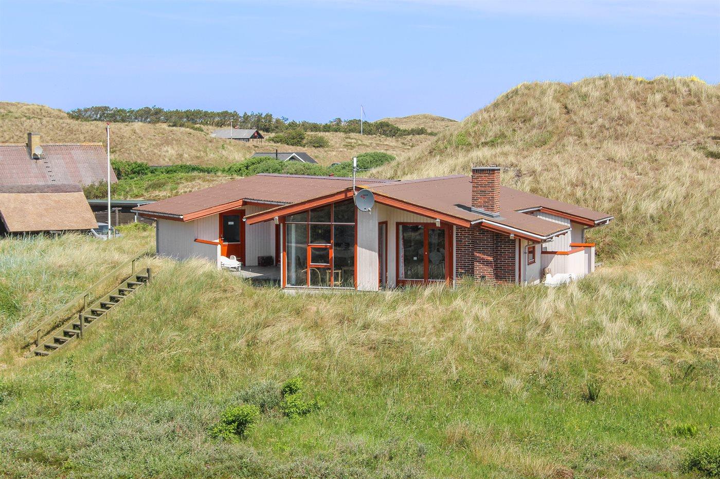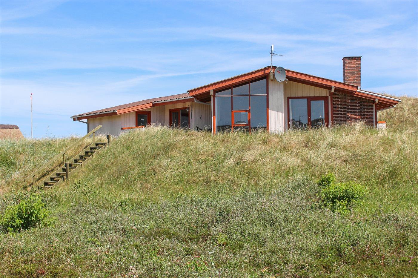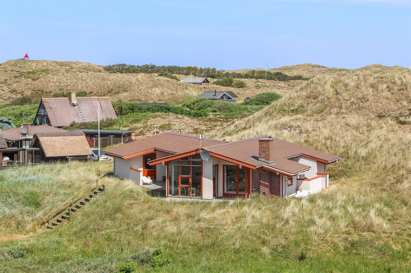 Dejligt sommerhus med en flot beliggende på en meget stor og kuperet grund med flot udsigt over klitområdet, havet og fjorden fra toppen af grunden. Få trappetrin op til huset.